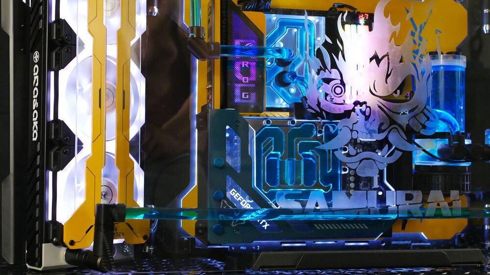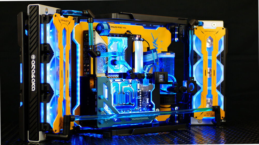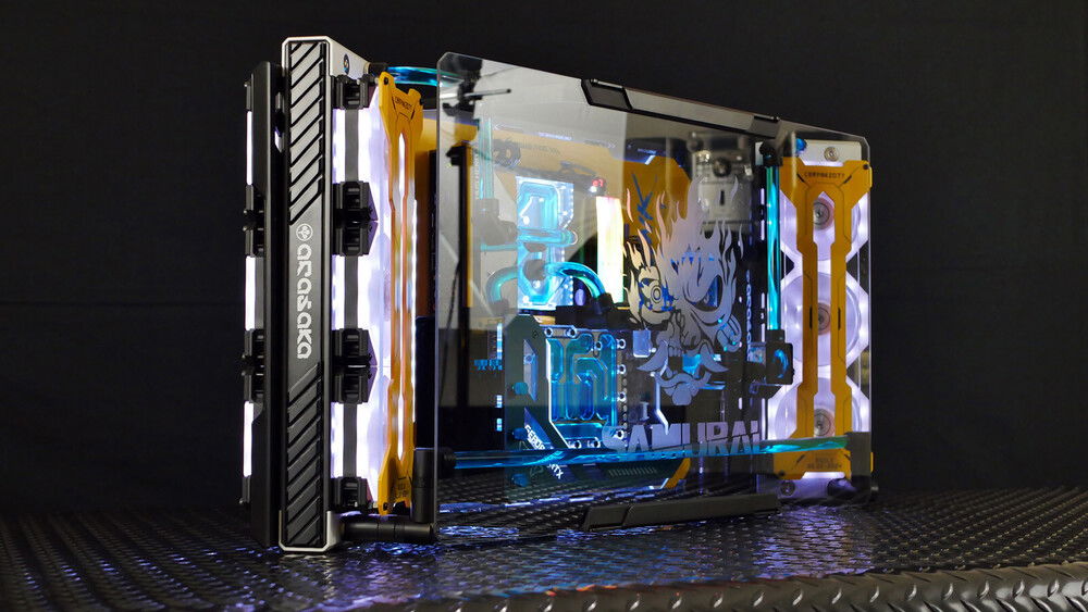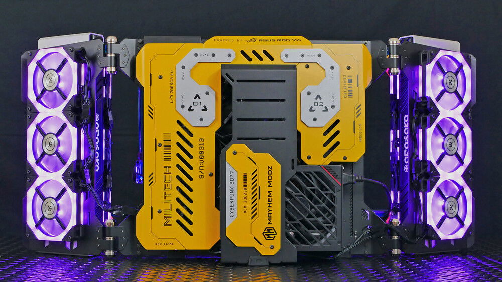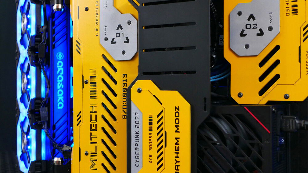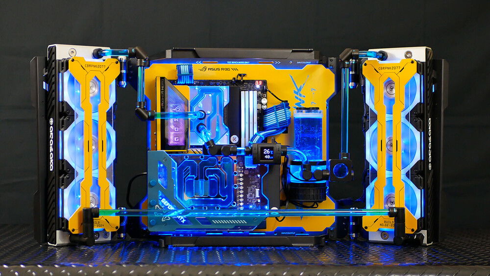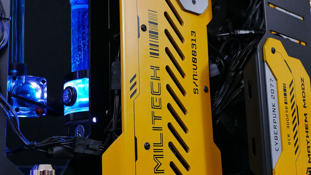 The frame has been enriched with customizations from the motherboard to the additional panels on the back to cover all the cables, to the radiator fan covers, acid etching of the tempered glass, the cyberpunk theme is always compelling and I would never stop creating customizations on it.