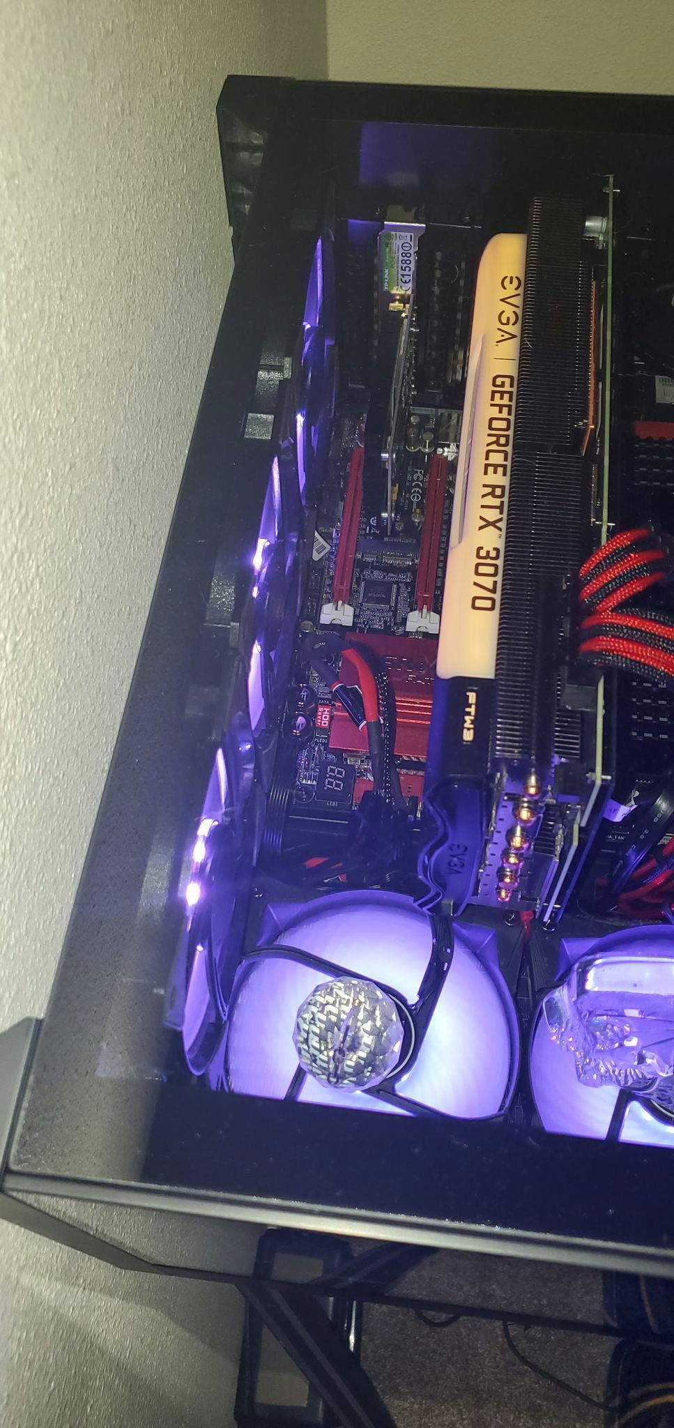 Details- so i wanted to do something a bit more unique then all the other Lian Li 011D builds i saw. i put 4 rubber feet on the metal panel side of the case and layed it horizontally. i chose the AIO specifically because it had the pump build into the radiator. and due to how the case is made the radiator is lower then the head block so this was ideal for my horizontal build of the case. otherwise i would have had to get a big enough radiator to compensate for the high of the head block. i managed to get my hands ona RTX 3070 FTW3 when my reservation came up from EVGA so i was super happy about that. i have the left(was bottom) of the case as the intake blowing on the GPU directly. which the GPU is triple slotted and triple fan. the 3 fans on the radiator are intake sucking cooler air from the bottom which is why i needed the rubber feet. which is keeping the radiator nice and chilly. and i have the right side(was top) of the case as exhaust. i have the fans segmented into 3 seperate ARGB splitters so i can change the color of three fans as a time. the head blocks ARG is tied into the 3 fans on it. i am using a Razer Chroma ARGB controller. i do have a 2tb 3.5" drive and a 256gb SSD in the system but i will be changing those out at a later date and they arent visible in the build so i didnt feel the need to mention them. the motherboard and CPU are a bit dated now(5-6 years now) but they are still chugging along like a champ. my CPU is OC to 4.0ghz right now.(can OC to 4.4 but dont need to) the GPU is OC by 1300mhz on memory and 140 on GPU. she stays a cool 54C pretty steadily. so she is blowing out cool air even.