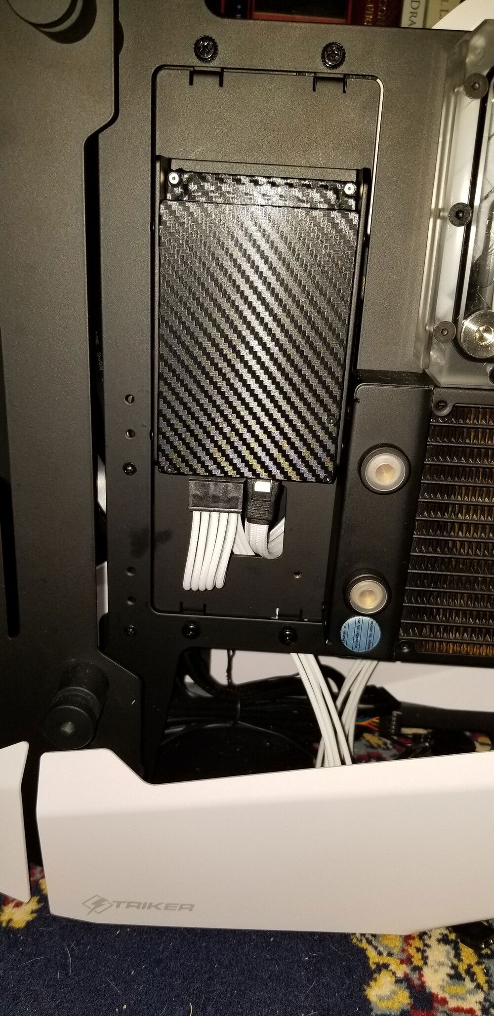 But the big change is that custom cover plate that I made and installed in the body of the case to cover the bottom of the motherboard and the PCI-E riser cable. I made it from acrylic and used a carbon fiber vinyl wrap for looks. It mounts using a pump bracket and some double-sided automotive tape.