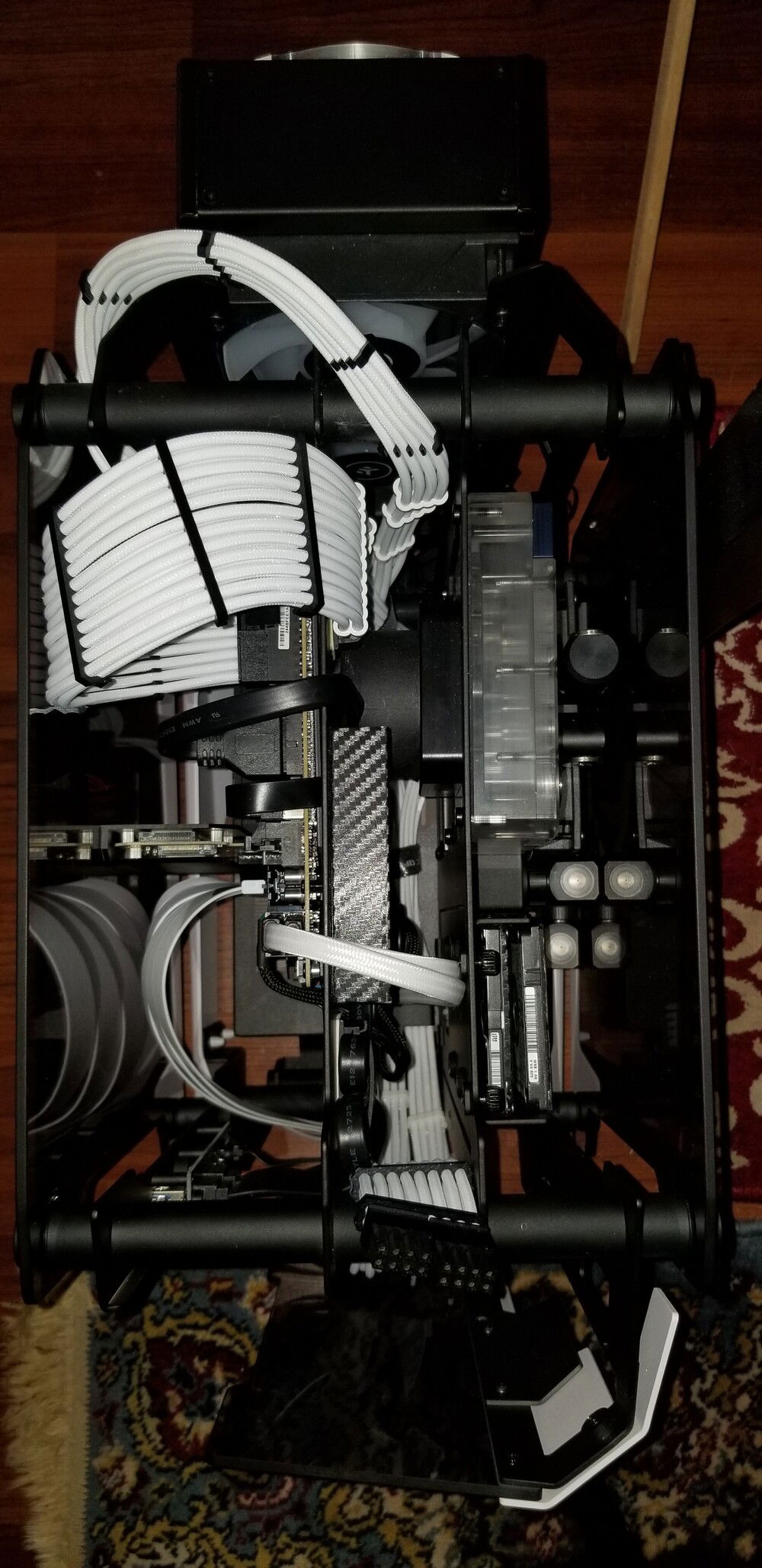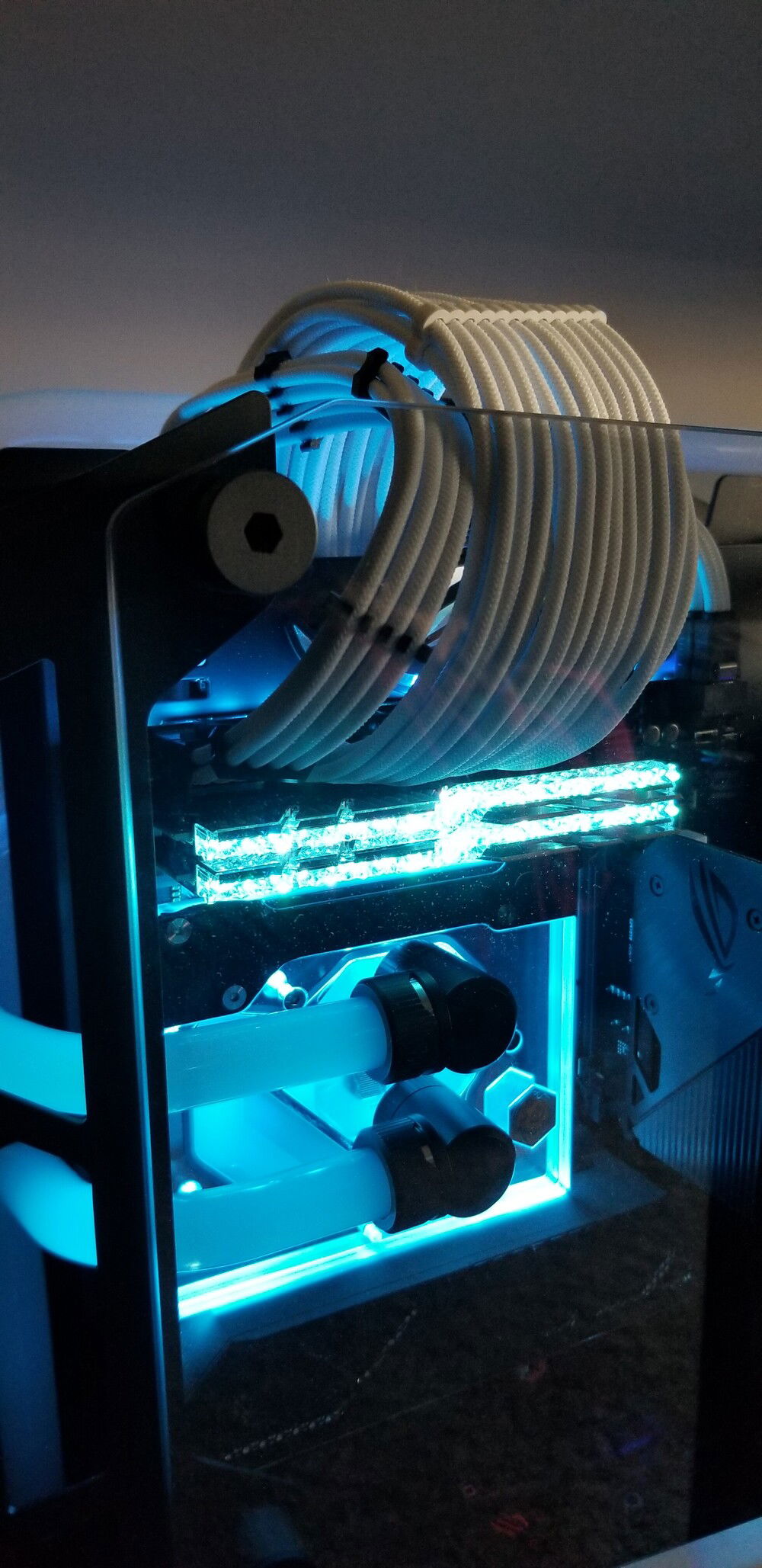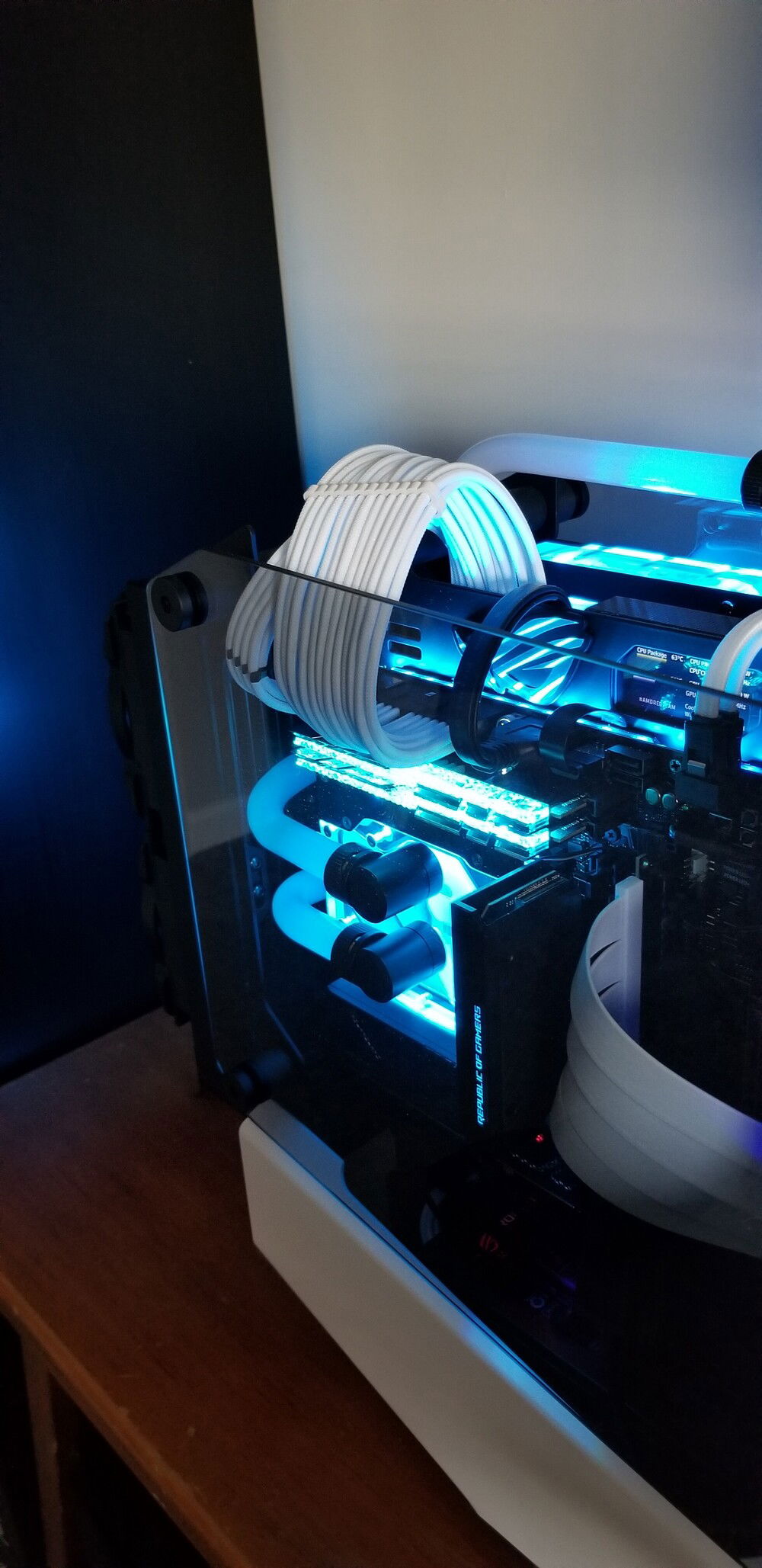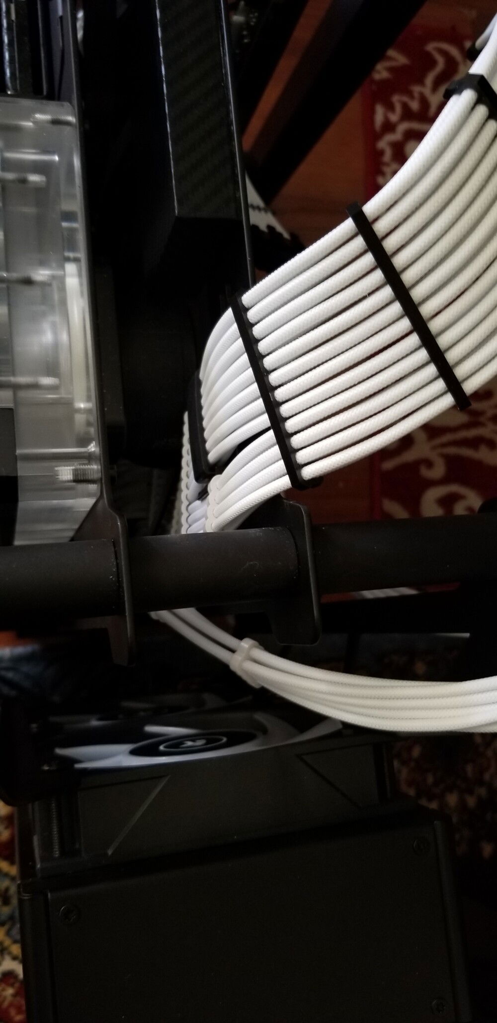 While this is not perfect, it is the build that I have wanted to do for a while now! This was my first time ever attempting hardlines, and some mistakes were made (messed up a few times and ordered way too much tubing, lol!), but it went pretty well! I am very pleased with the end result, but we shall see if I do a bit more with the case/frame...I tried to to get/find 24+8 bridged aluminum cable combs (black) for the motherboard and EPS power, but, alas, it was not to be. I ultimately settled on getting some more 24-pin combs and using 8-pin combs to join the EPS power to the underside of the 24-pin cable for part of the run. This cleaned things up substantially! Can't say that the end result is precisely what I had originally envisioned, but I am very pleased with it, so, yeah!
