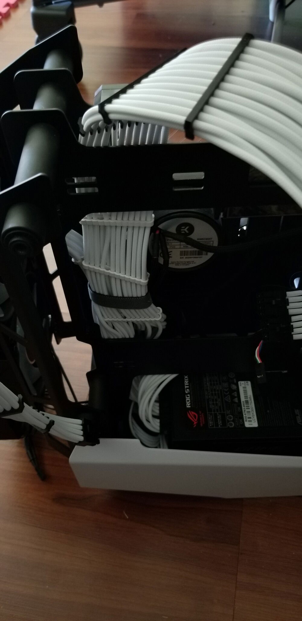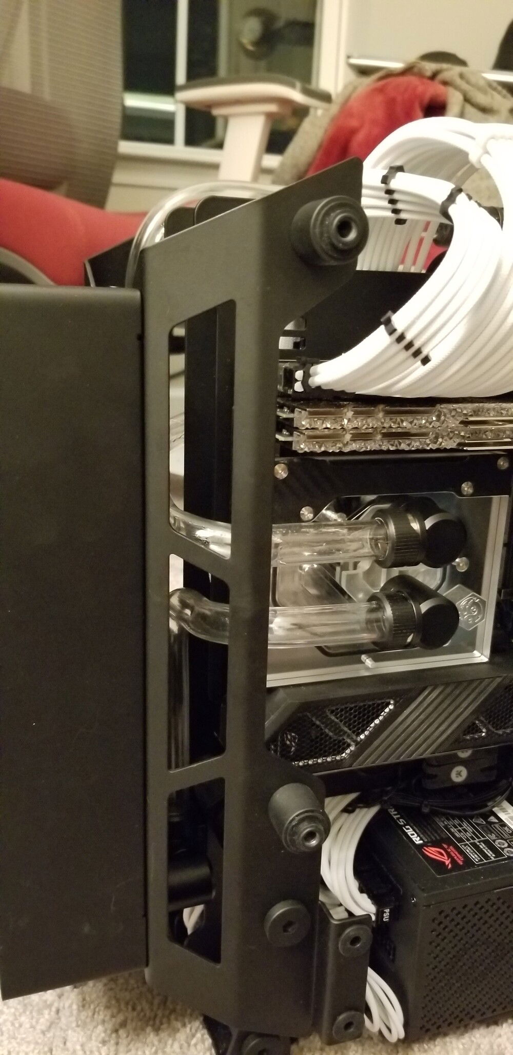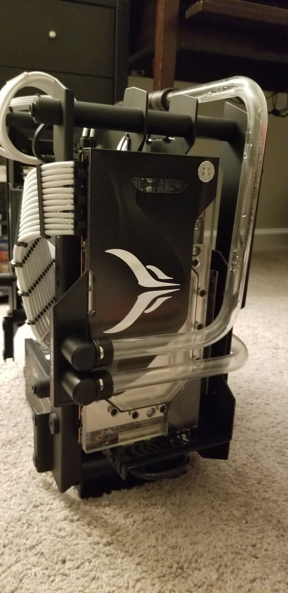 While this is not perfect, it is the build that I have wanted to do for a while now! This was my first time ever attempting hardlines, and some mistakes were made (messed up a few times and ordered way too much tubing, lol!), but it went pretty well! I am very pleased with the end result, but we shall see if I do a bit more with the case/frame...I tried to to get/find 24+8 bridged aluminum cable combs (black) for the motherboard and EPS power, but, alas, it was not to be. I ultimately settled on getting some more 24-pin combs and using 8-pin combs to join the EPS power to the underside of the 24-pin cable for part of the run. This cleaned things up substantially! Can't say that the end result is precisely what I had originally envisioned, but I am very pleased with it, so, yeah!