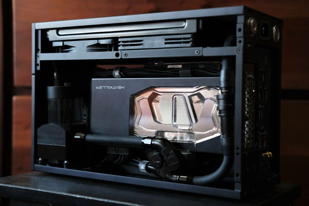 FormD T1, stuffed to the gills with a Heatkiller custom loop with a tiny but proper pump res! Chose heatkiller as my go-to blocks for their exceptional performance, build quality and sleek looks. System runs a little hot, but nothing a little undervolt couldn't solve. During gaming, system is only outputting 60-70w for CPU, 280w for GPU (1920mhz, 850mv). Am extremely pleased too that I managed to fit a full pump res in there, it makes filling so much easier and allows for some thermal mass to soak up before hitting equilibrium.