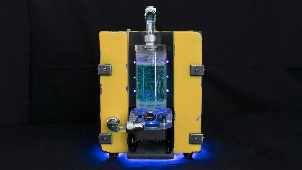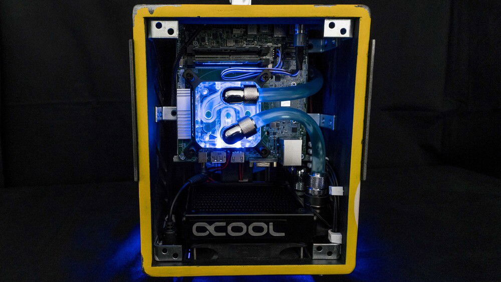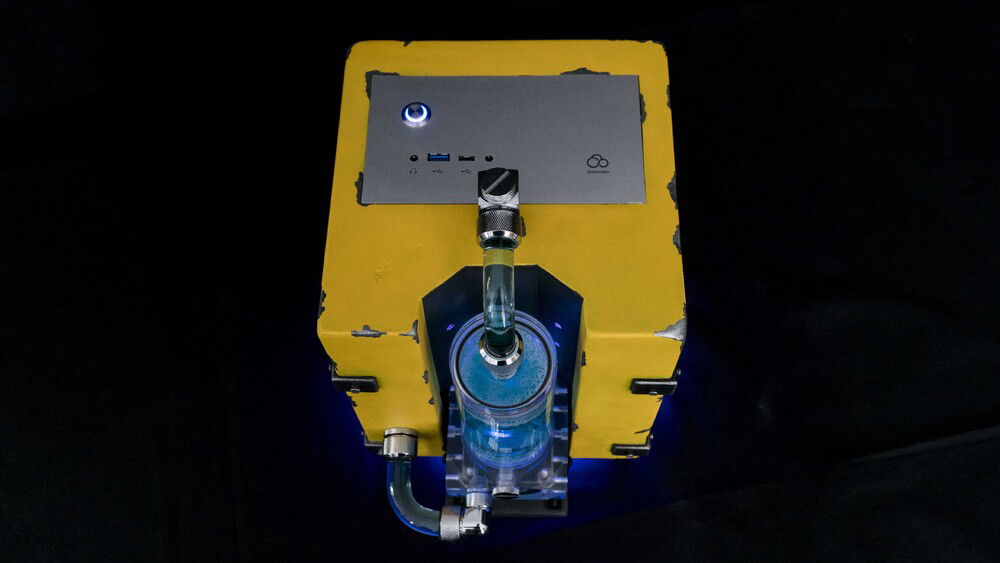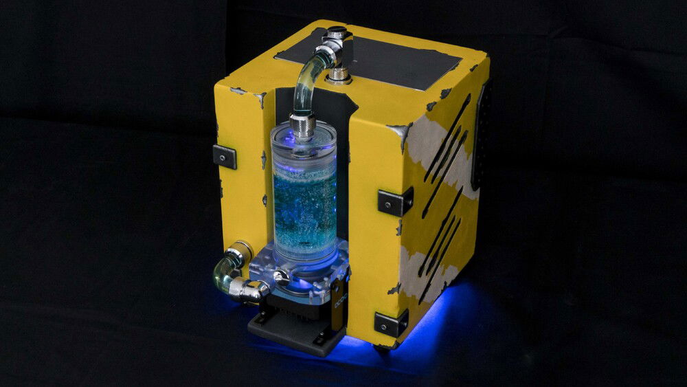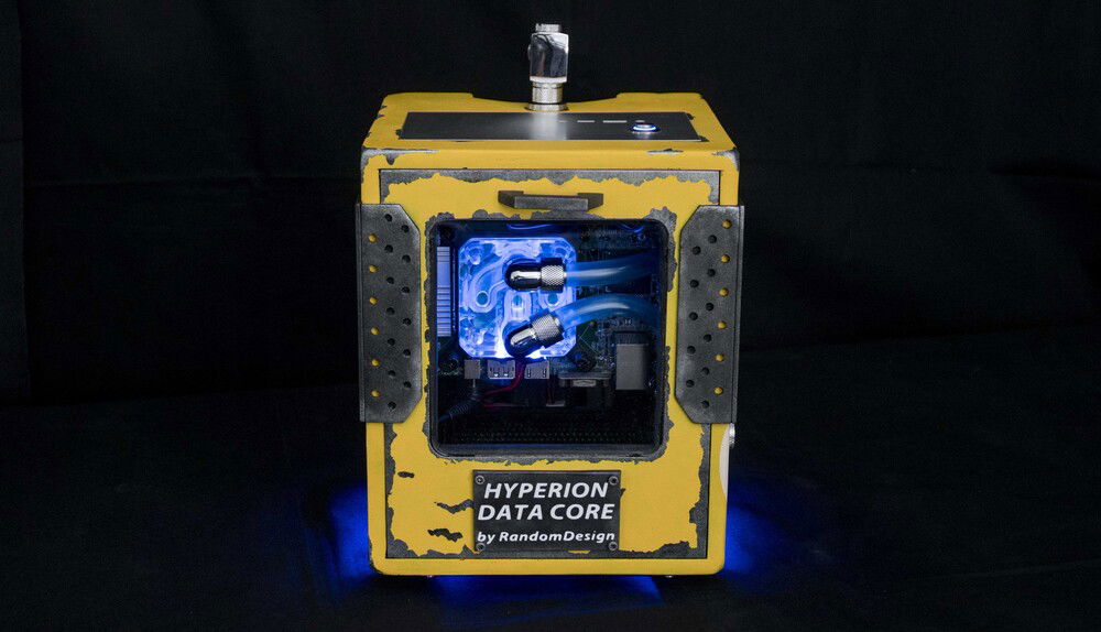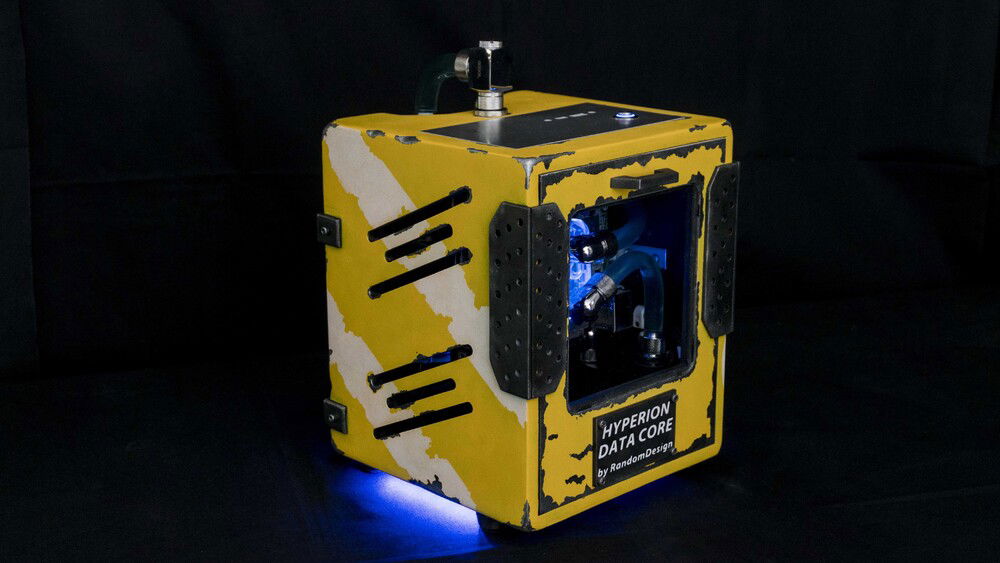 This is my smallest case mod so far. It was built for “rethink IT” for the promotion of their datamate micro-PC “Buddy”. The design refers to the “Hyperion” style from the video game series “Borderlands” (Gearbox). The self-made water cooling liquid is UV-active and illuminated by LEDs. It was already built in 2017