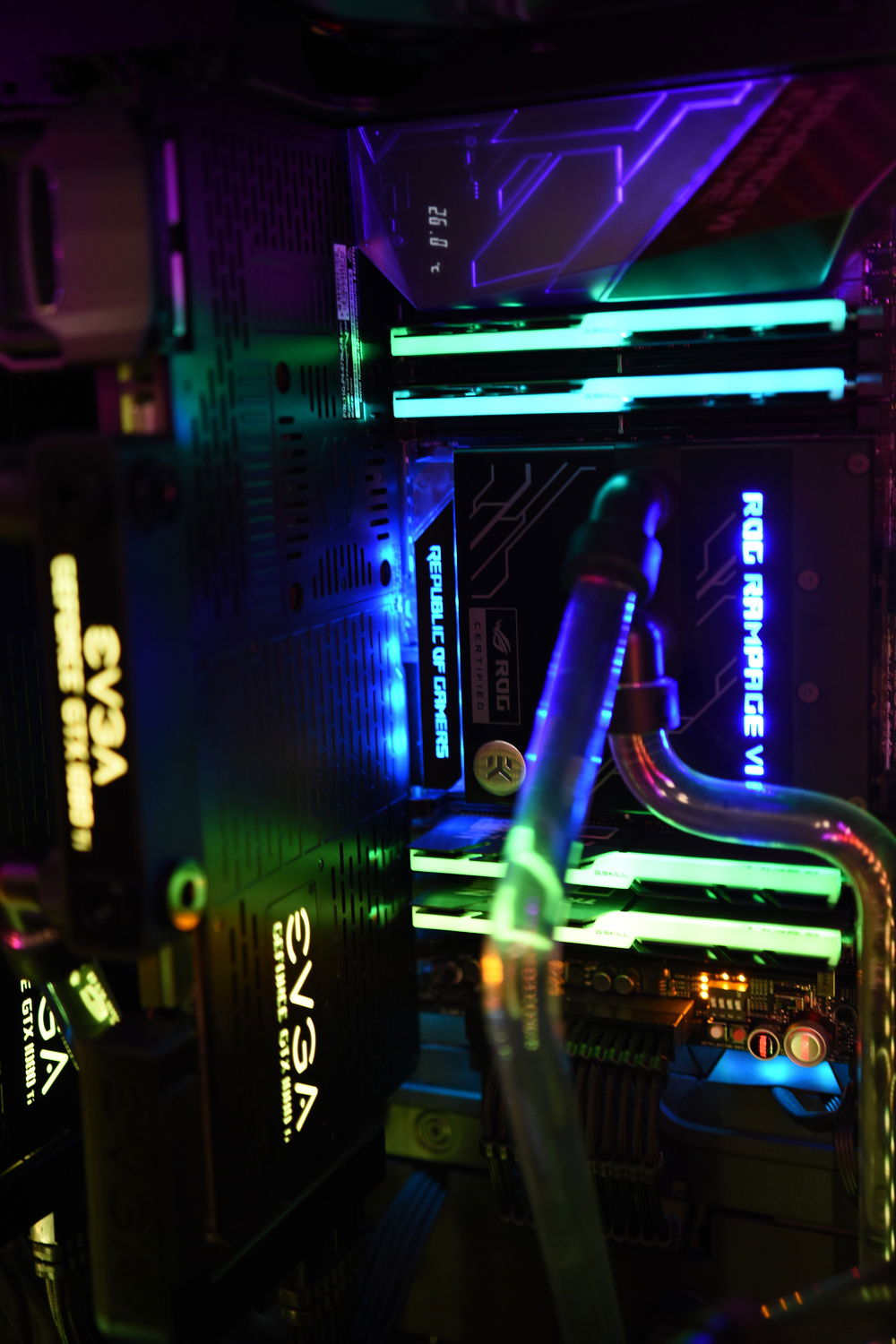 But it wasn't all fun and games. The first Asus X299 Rampage VI Extreme board was defective. It would absolutely freeze up randomly, including in BIOS. I bought a EVGA X299 Dark to verify it was that. Also, one of the two EVGA Hydro Copper water blocks shorted as soon as I booted the system after installing water cooling system. I freaked out because it went up in a poof of blue smoke. The RMA process went well for both, sort of. The Asus RMA was fine. Got a new board. But EVGA sent me a beat up used water block, which sucks because it is such a cheap item, and I have spent a lot of money with them. This was my first water cooling build, and first time for hard line tubing. I think it came out looking good. It took me like three weeks to get the tubing done right. She is a beast now. I want to upgrade to (2x) RTX 2080 ti with water blocks, but they are really not available yet at a decent price.