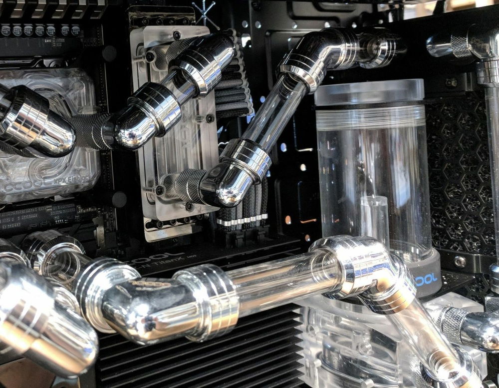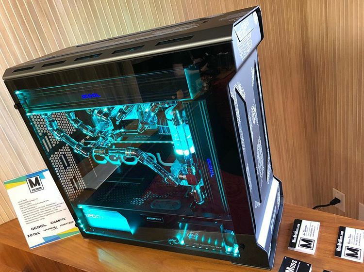 Featuring all sorts of great Alphacool goodies, the custom PC also includes various services that ModMyMods offers. We laser etched the top & front panels of the Phanteks EVOLV ATX case and cut out our infamous "air flow" design using the watercooled CNC at the shop. Since it was BIGKevin's first attempt at hard tubing, to make it easier we used fittings to make the bends allowing us to just make straight cuts. Although it was double the cost in fittings, it saved us from the headaches of bending tube. Honestly not very effective LOL. This was our first attempt at full RGB on everything using what LED strips were available at the time. This was before 5v digital RGB was even a thing and challenged us to get all of the RGB to work accordingly. This would change later on when we would recreate the build for PAX East 2018.