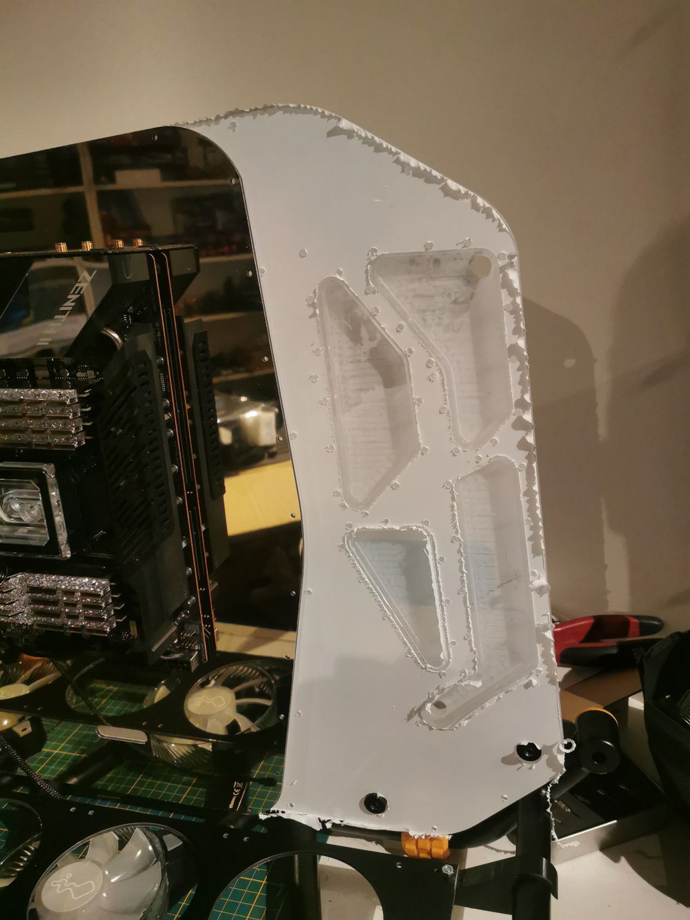 I wanted to create a new goldfish mobo tray, hiding a distroplate. Black rigid rubbing.