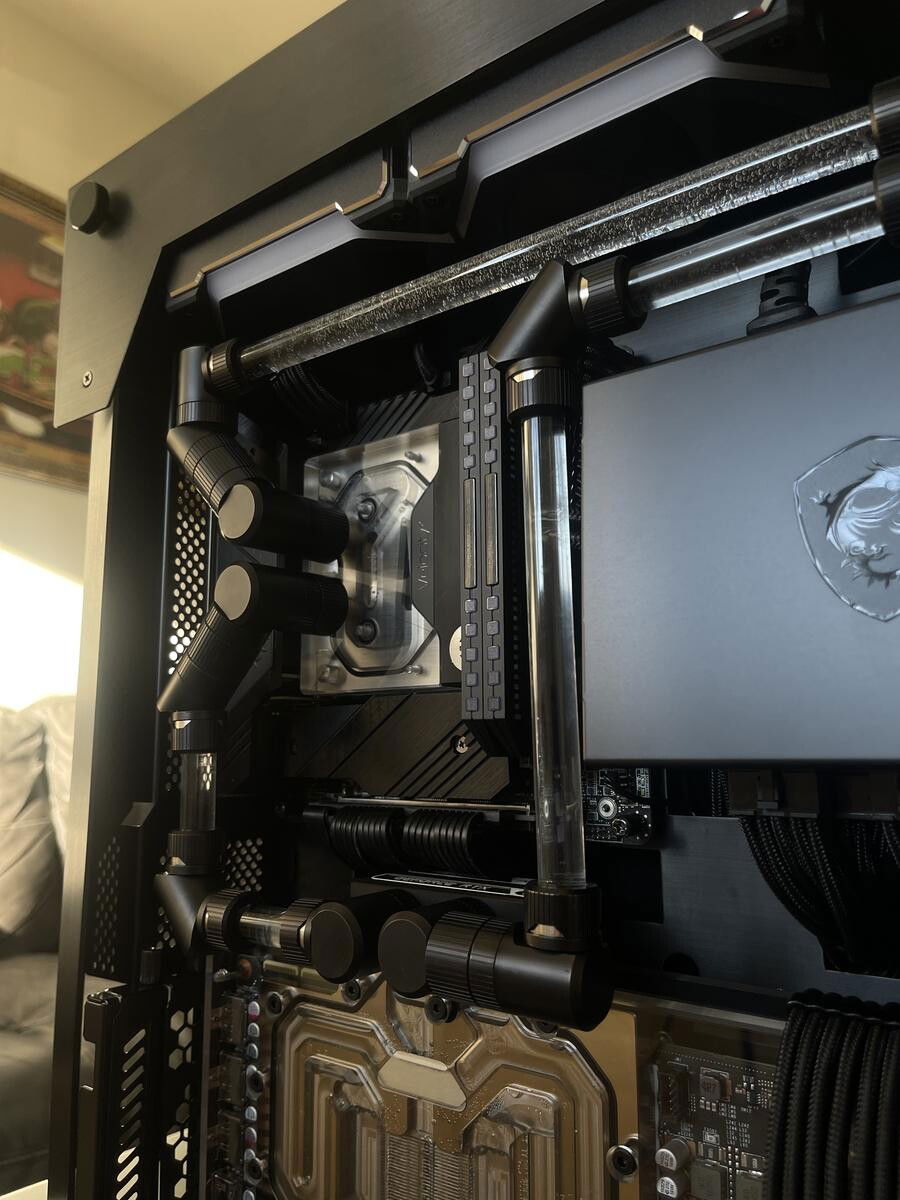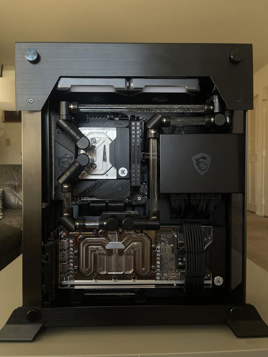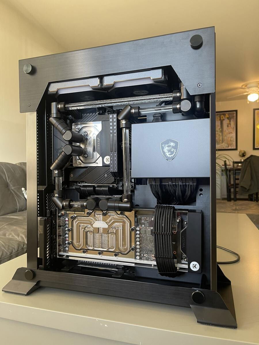 My Build for my client. based on my research for the allusive all-in-one radiator they led me to the Granzon radiator-pump combo. A brand I never heard of, but I had no choice because there is apparently a minimal selection of radiator-pump combo units on the market. After I discovered the radiator-pump unit, the rest of the build basically fell into place. I found the best-looking, all-black, components on the market, filled this system up with tons of storage and memory, and slapped them all together to get what I can say is a pretty awesome-looking PC that I am very proud of.