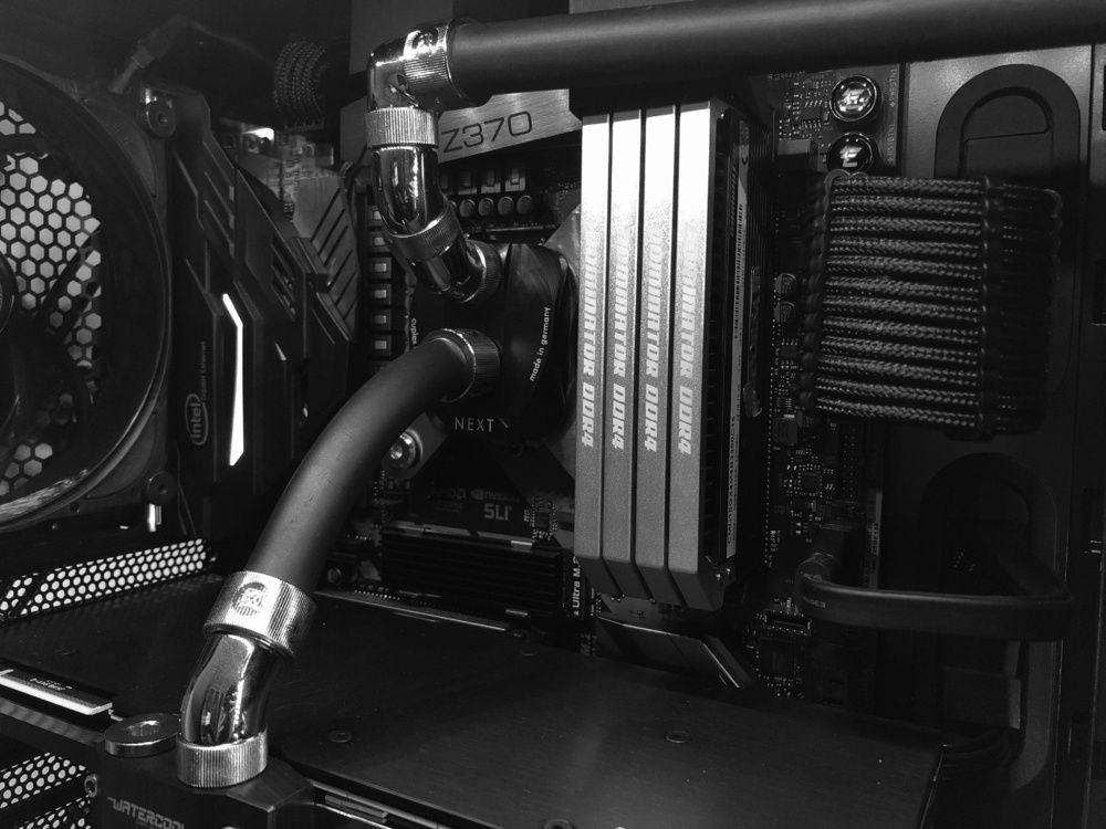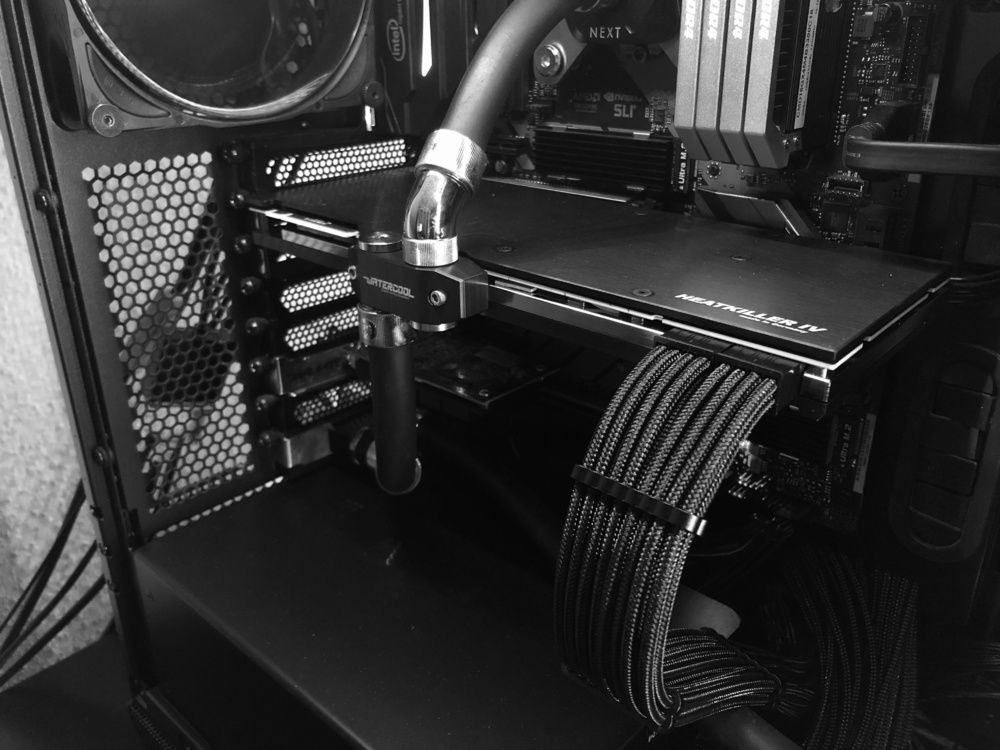backside with the ports for the external tubing for the radiator and a self made sleeved cable to the external Mo-Ra3 to power and PWM control the fans.