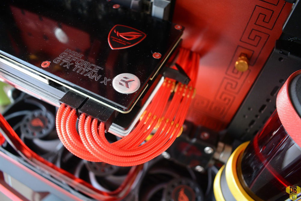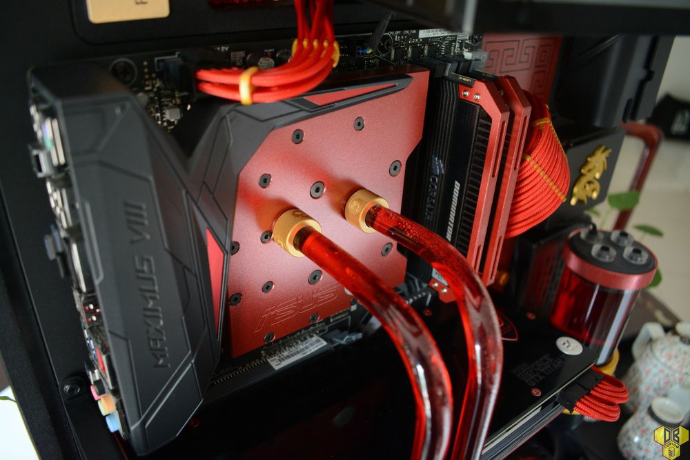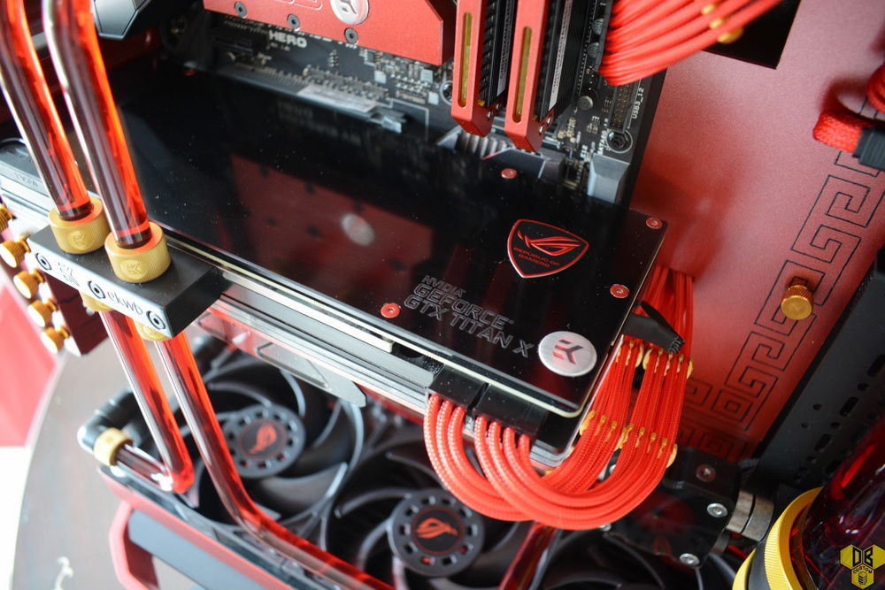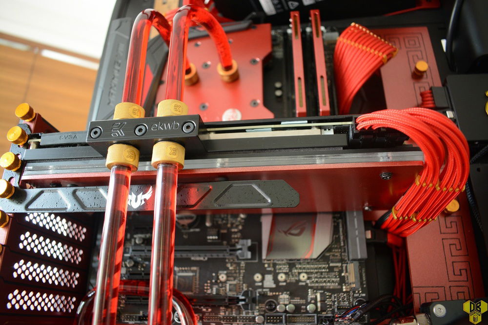 Coolant and fittings are from EKWB, with their gold/blood red combo.