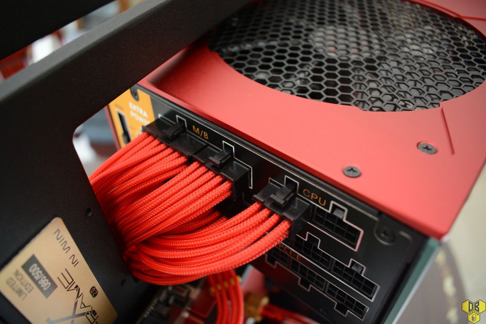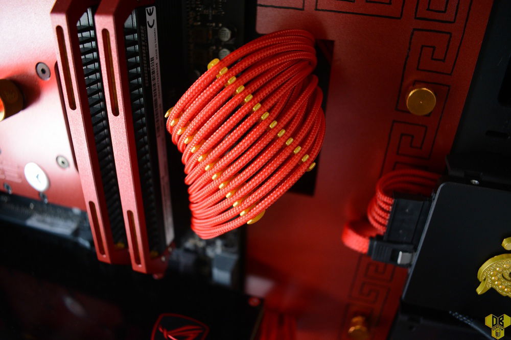 Cables used are the CableMod Modmesh Red Full PSU replacement cables. I really liked how they turned out, they are bright, vibrant and extremely high quality. They are complemented with gold cable combs.