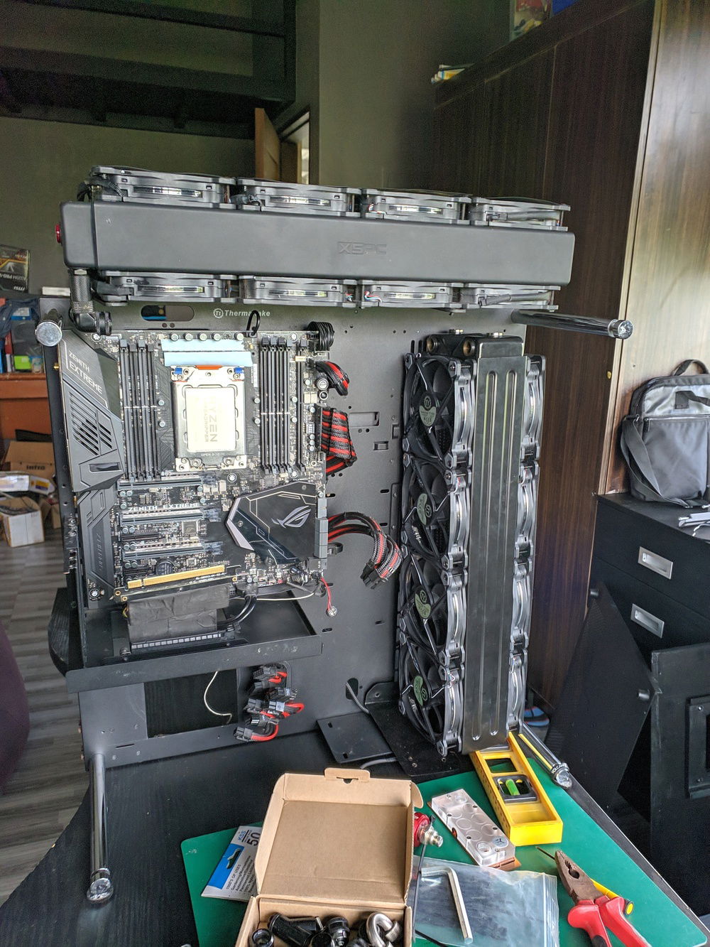 So finally in Dec 2018, the loop parts are almost complete, and before we had a vacation to US, I sold the 2700x and crosshair VII then finally added some hundreds and bought the threadripper.