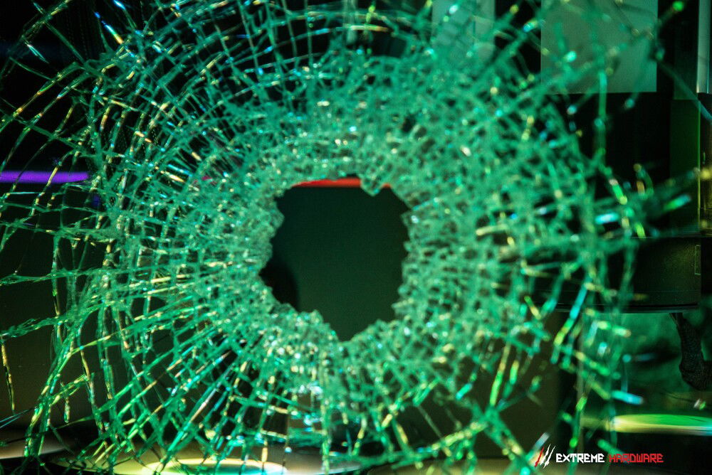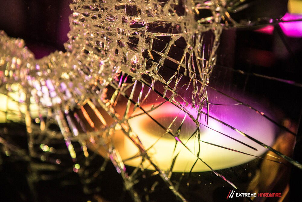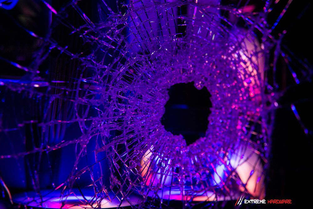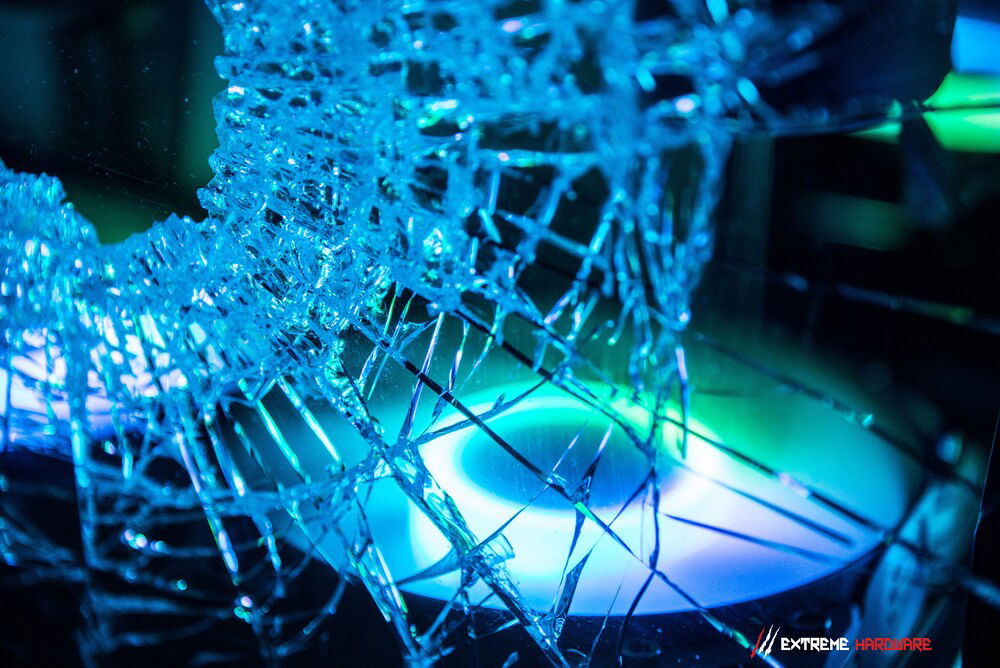 The broken glass is an additionally glued to the original hardened glass of the housing, cut to measure and with a hammer, caressed element that adds atmosphere to the machine. Behind the reservoir there is a mirrored plexiglass reflecting several elements of the configuration, well seen at the right angle.