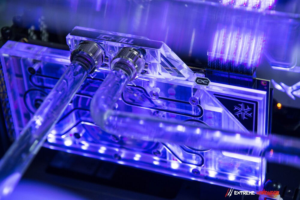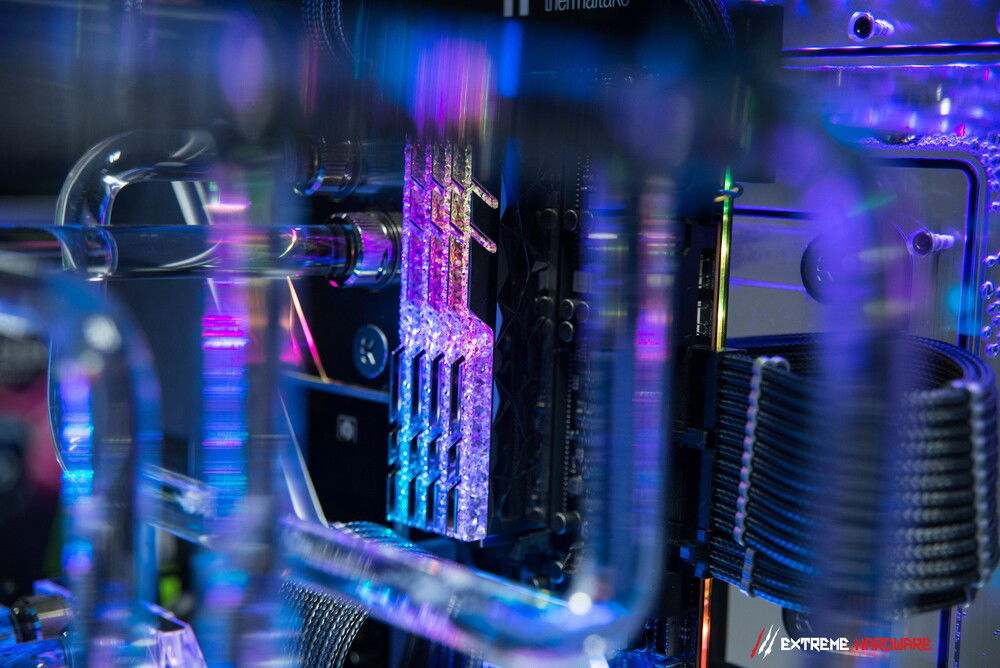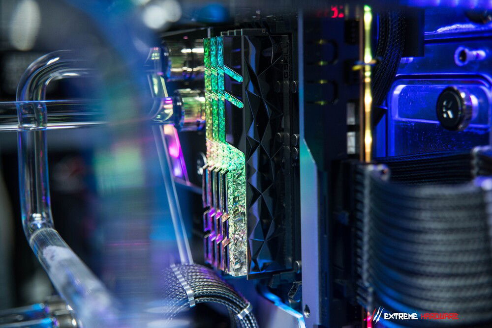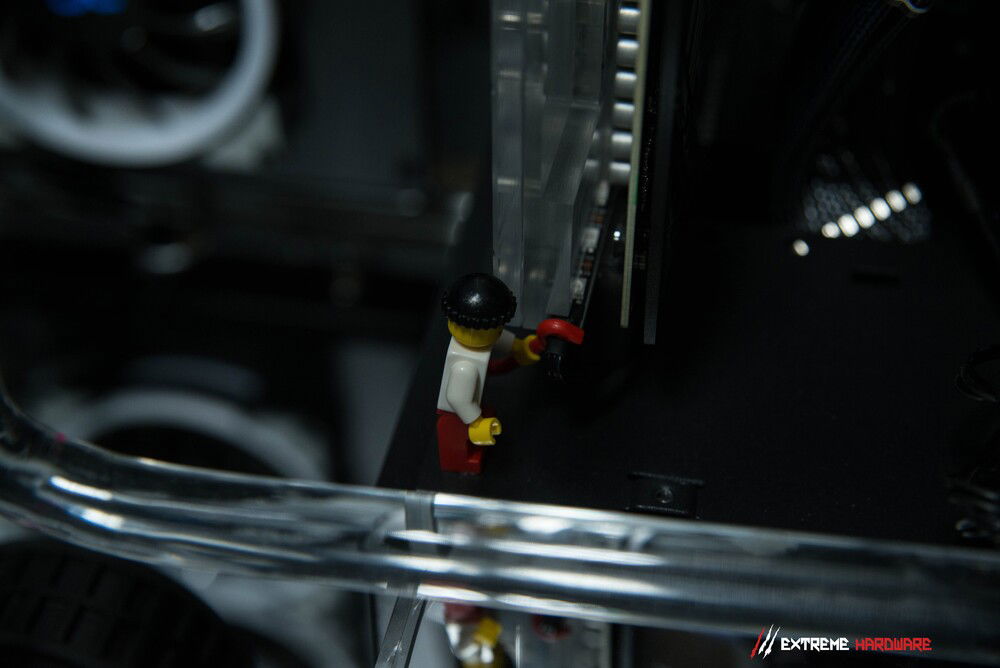 The RTX 3090 FROSTBITE was also an element that was to be included in this project because this model was extremely liked by the enthusiast for whom the machine was created. The card, although with a low PT for a GA102-300 PT (375W) chip, positively surprises and allows for comfortable use of as many as three 65-inch 4K panels.