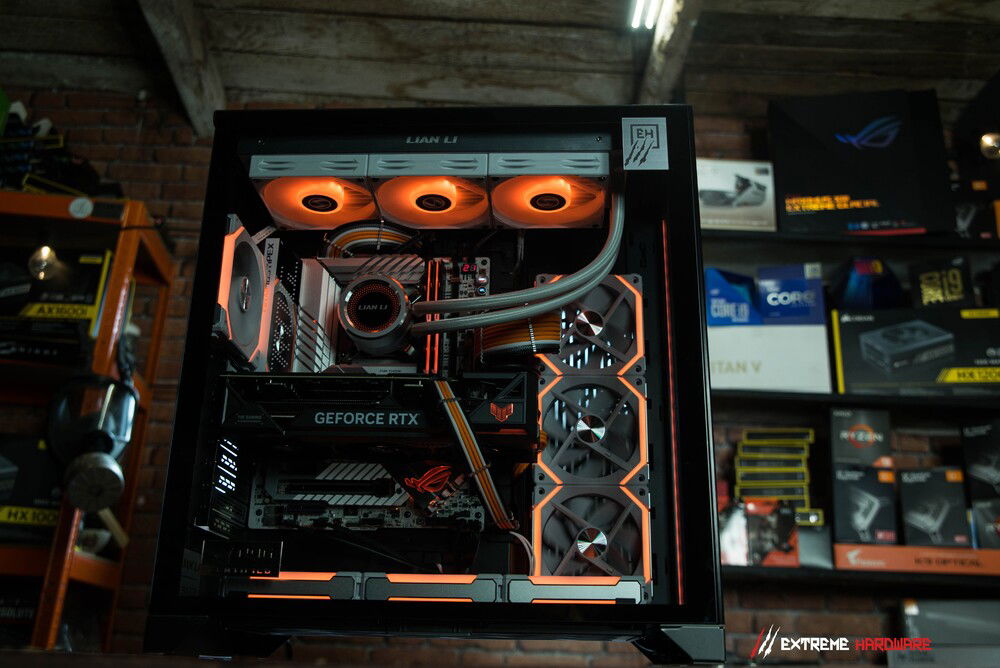 The fans that we used to support the air flow in the case differ in design from those of the AIO, but this is a deliberate procedure because the even illumination of the upper fans allows more effective illumination of the upper areas of the motherboard. AIO Lian Li V2 is devoid of the factory errors of the problematic V1 version and surprisingly copes well with keeping the i9-13900KS in check, of course, it's all a matter of adjusting the cooling system appropriately.