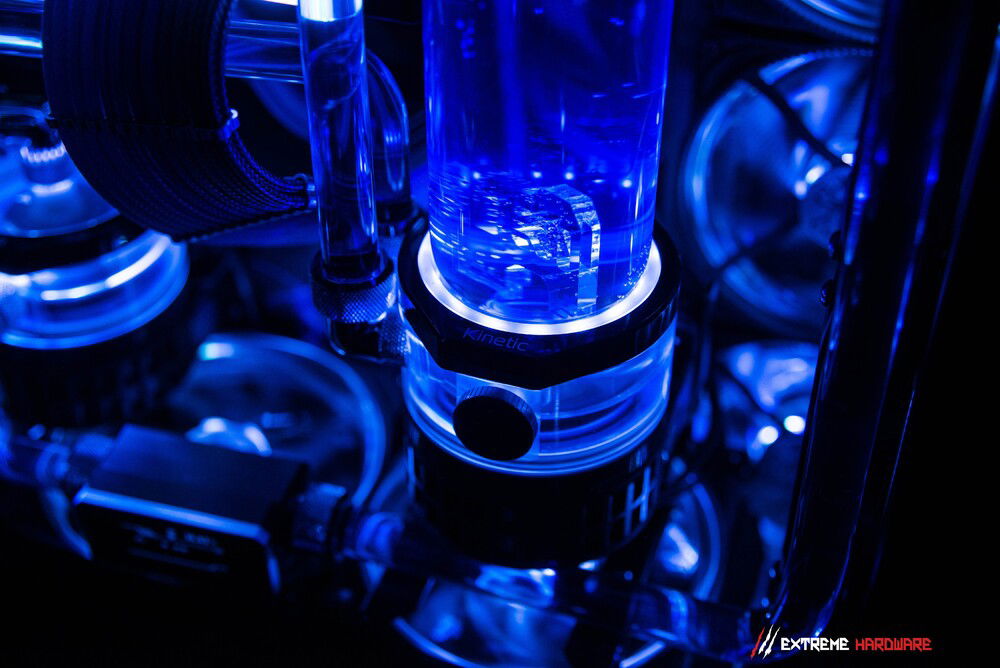 We started work on the "SCYLLA II" project in 2022, but at that time the concept underwent several further modifications. Earlier art i9-12900K (SP 95 P) replaced with i9-12900KS (SP 108 P), Samsung DDR5 modules changed to SK Hynix modules. The lower 360/45 radiator was changed to 360/60 in a Push&Pull configuration, we added an additional D5 pump, and four side fans to bring cold air from outside the case to the center of the configuration. The LC improvement treatments translated into spectacular results. The setup is extremely quiet and the components are cool. For example, with PT 480W on the GPU, it's hard to break the 46C barrier on the core, even after a long time of full load on the card.