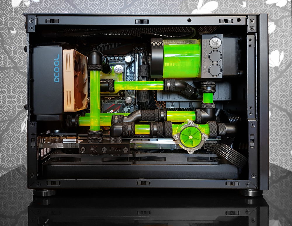 This build was made for my self as a personal gaming rig, the idea from the start was to try to fit a CPU+GPU loop with straight-pipes inside the NCASE v.5. The build uses a 240+92mm radiator setup which does the job, but I would lie to say that the build didn't get hot in the crammed case, but it does look very cool! This was my first water cooled PC made with pipes.