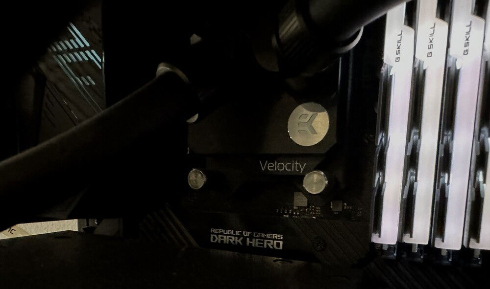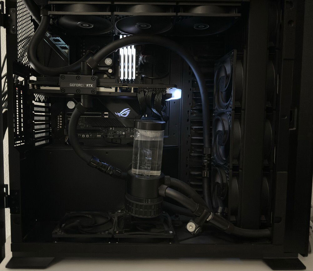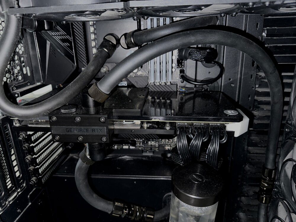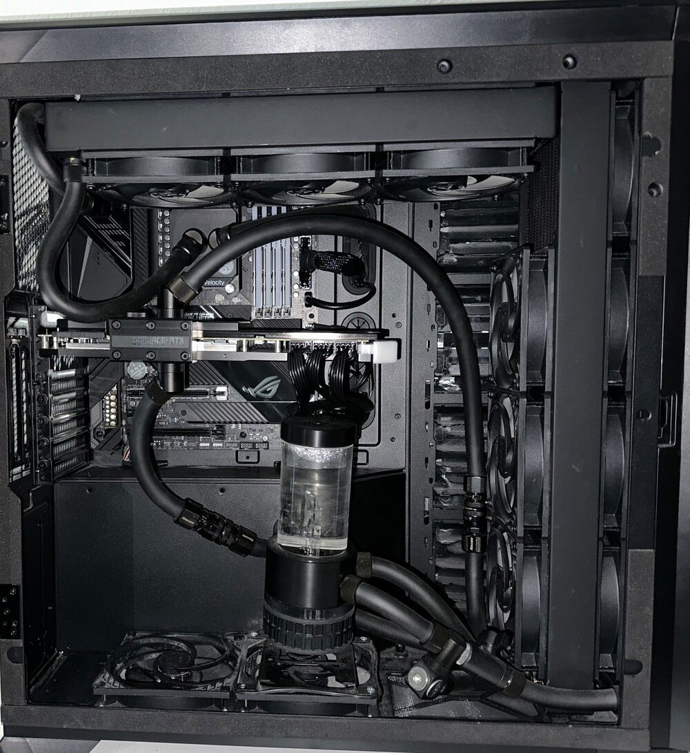 AMD Ryzen 5800X , ASUS dark hero x570 ,16 Gb g.skill 3200mhz cl 14 same ram I already had , EVGA RTX 3090 FTW3 Ultra, samsung evo 970 plus m2 250gb , Corsair MP400 4TB EKWB waterblock and Backplate, 3 more Fans on front Radiator