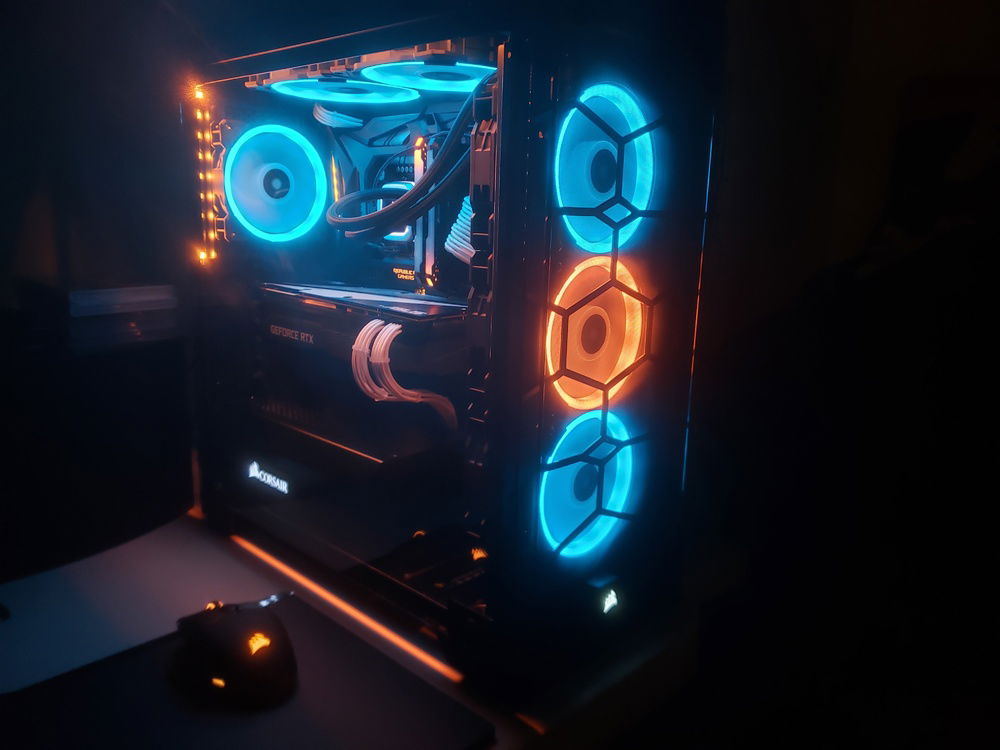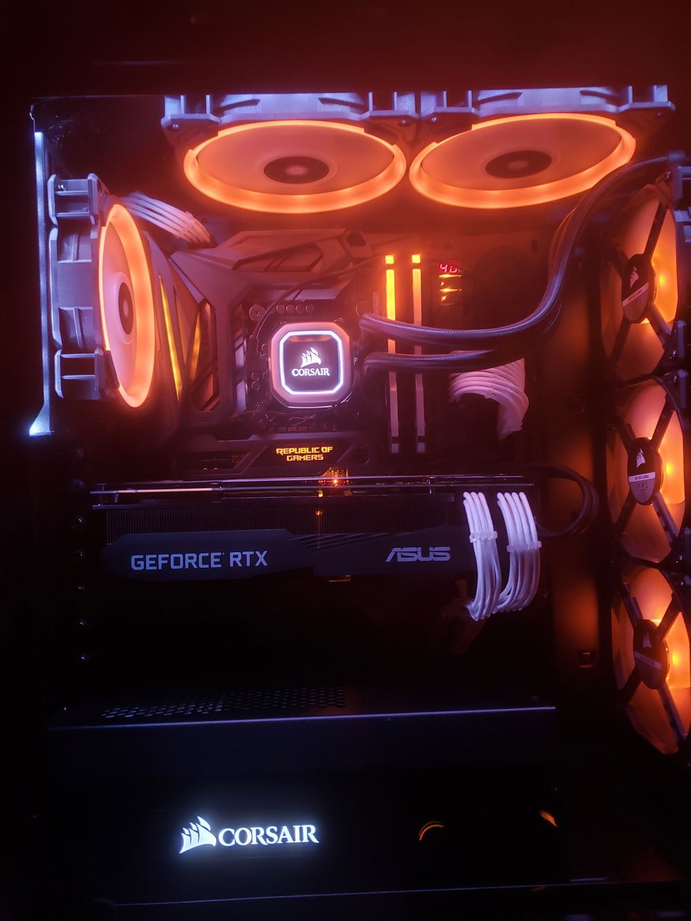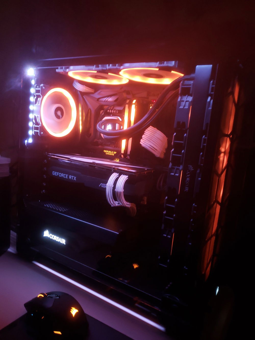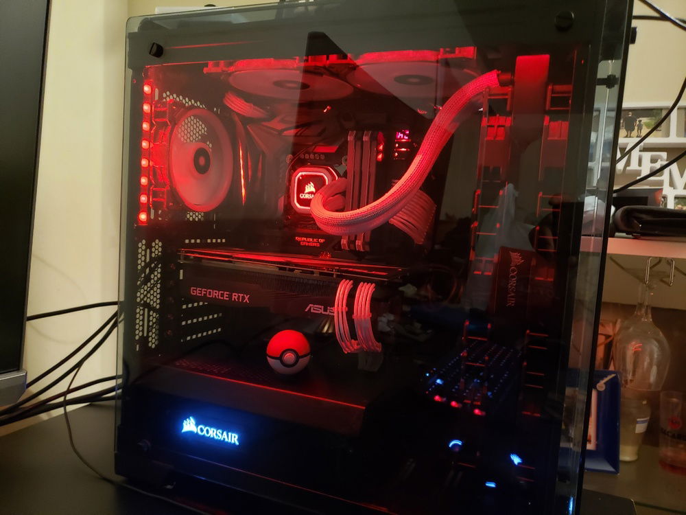 i7 8086k Overclocked to 5.1Ghz Asus Maximus X Code Motherboard Corsair Venegence RBG Pro 32G of Ram @ 3200mhz Asus Geforce RTX 2080 Corsair 150i Aio Cooler Corsair CX750M Power Supply Corsair 570x Case Corsair 6x LL Fans 3x SP Fans CableMods Addressable Led Strip CableMods White Extention Cables