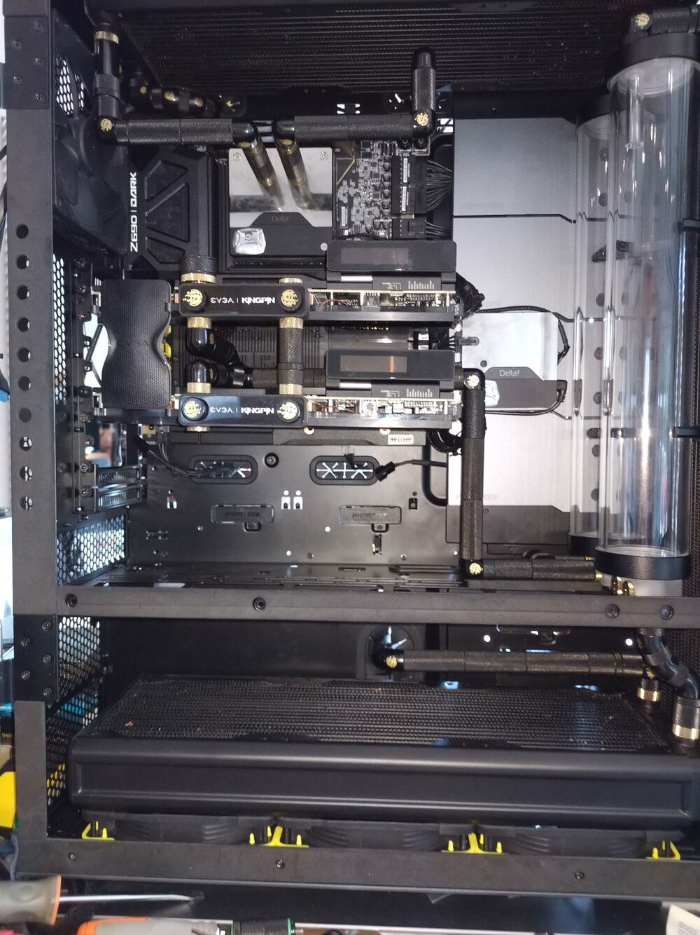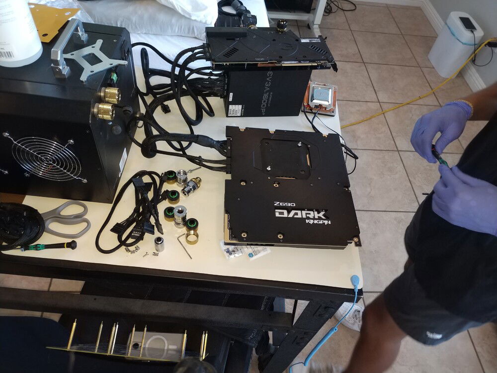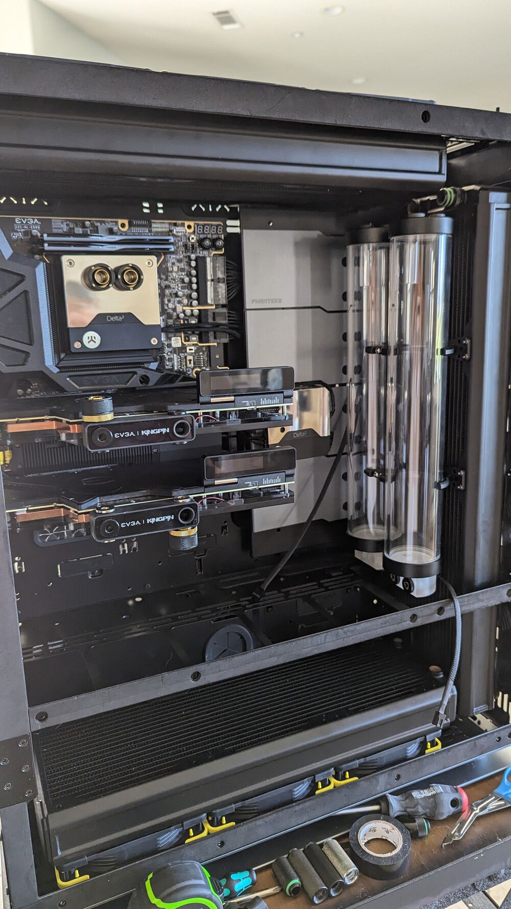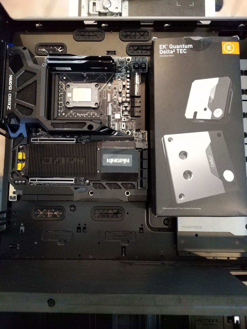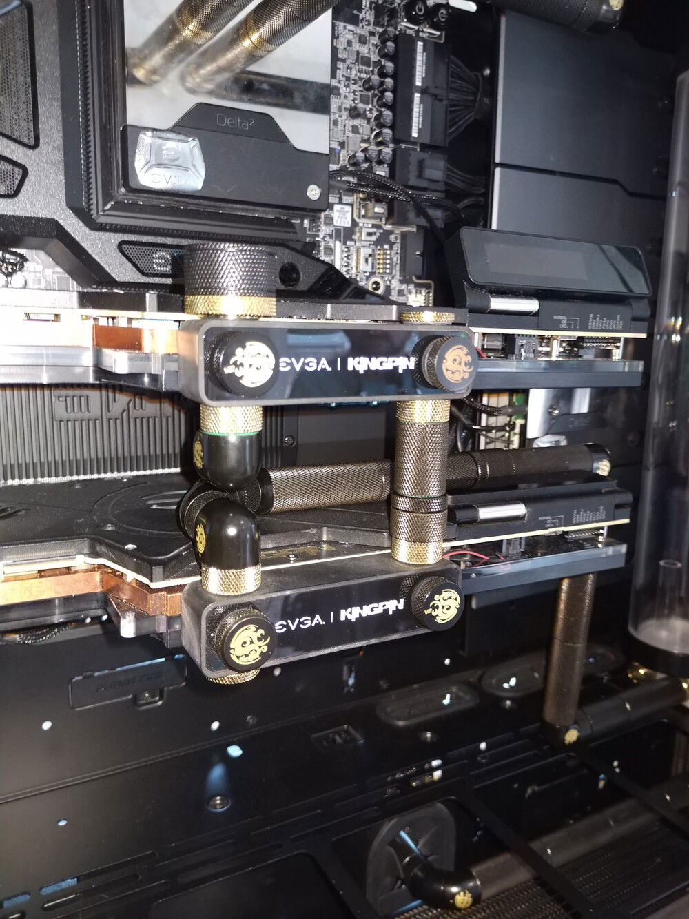 EVGA KINGPIN themed SLI build. Honoring the end of EVGA and Vince's (kingpin) and his team's contributions to the hobby over the years. Goals for the build are: build a gaming pc capable of exterme oc when needed. Able to run oced 24/7 very quietly. Using a tec so a dual loop was necessary.