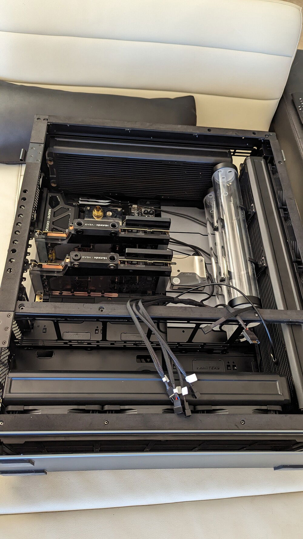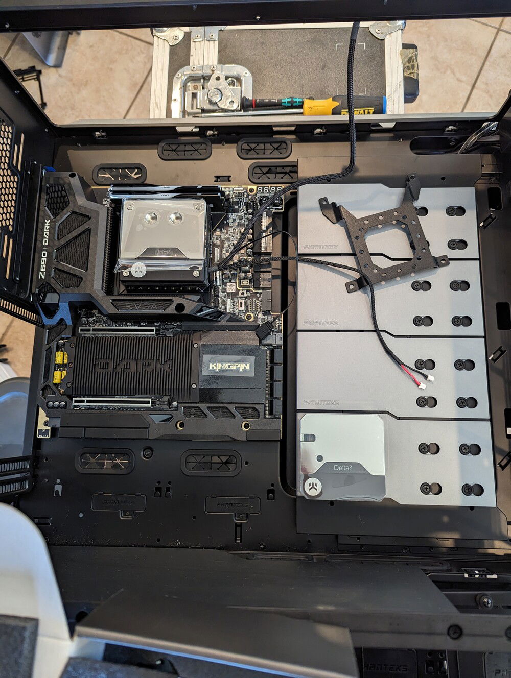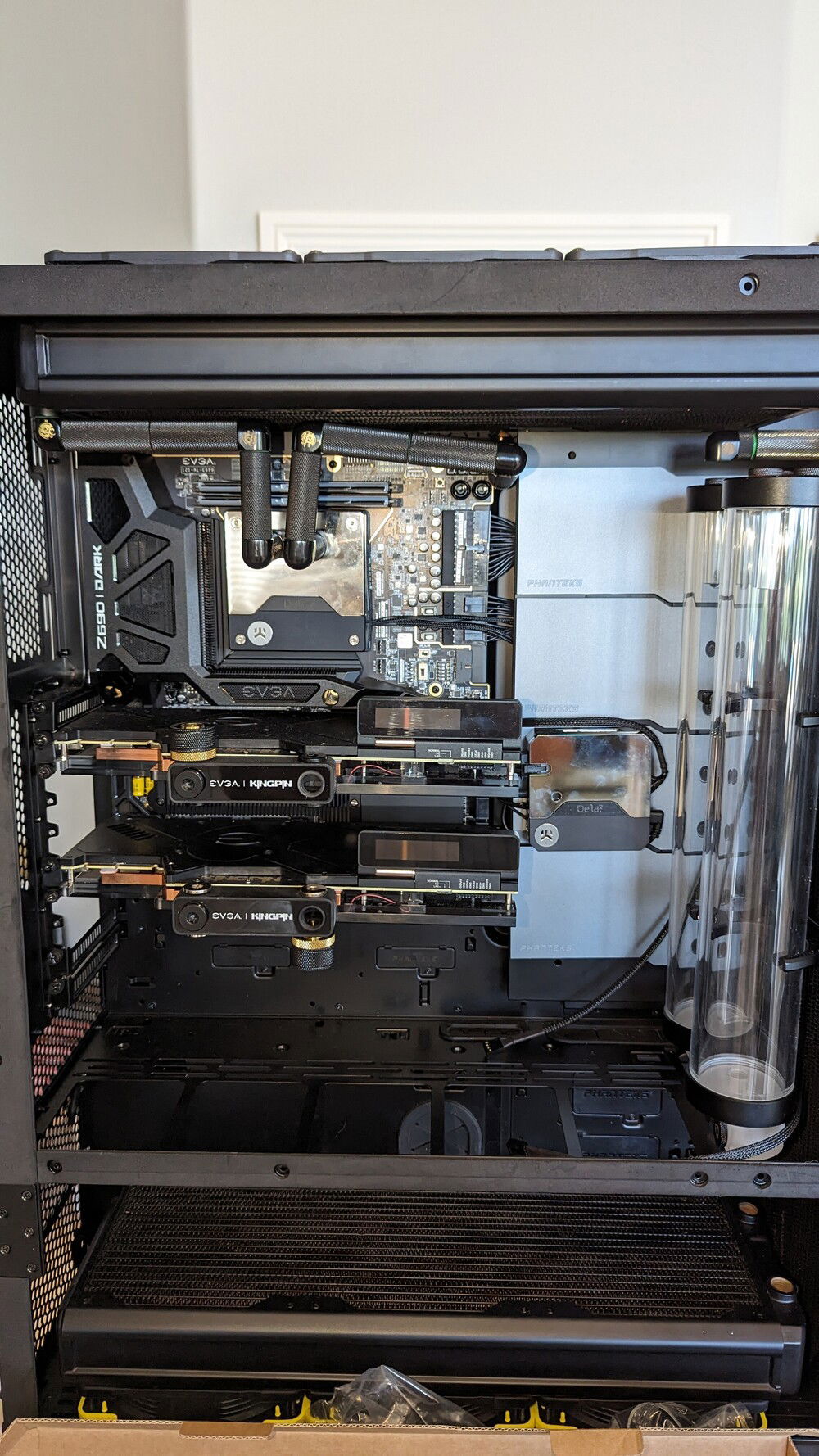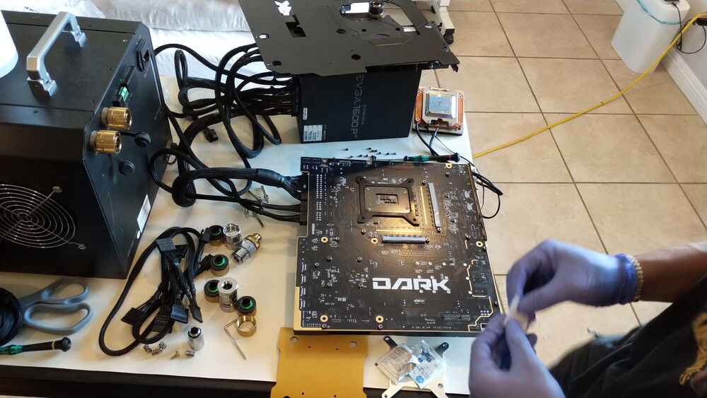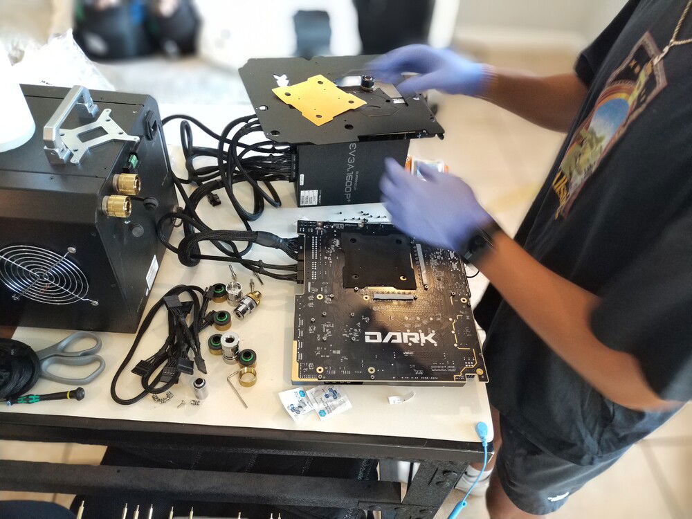 EVGA KINGPIN themed SLI build. Honoring the end of EVGA and Vince's (kingpin) and his team's contributions to the hobby over the years. Goals for the build are: build a gaming pc capable of exterme oc when needed. Able to run oced 24/7 very quietly. Using a tec so a dual loop was necessary.