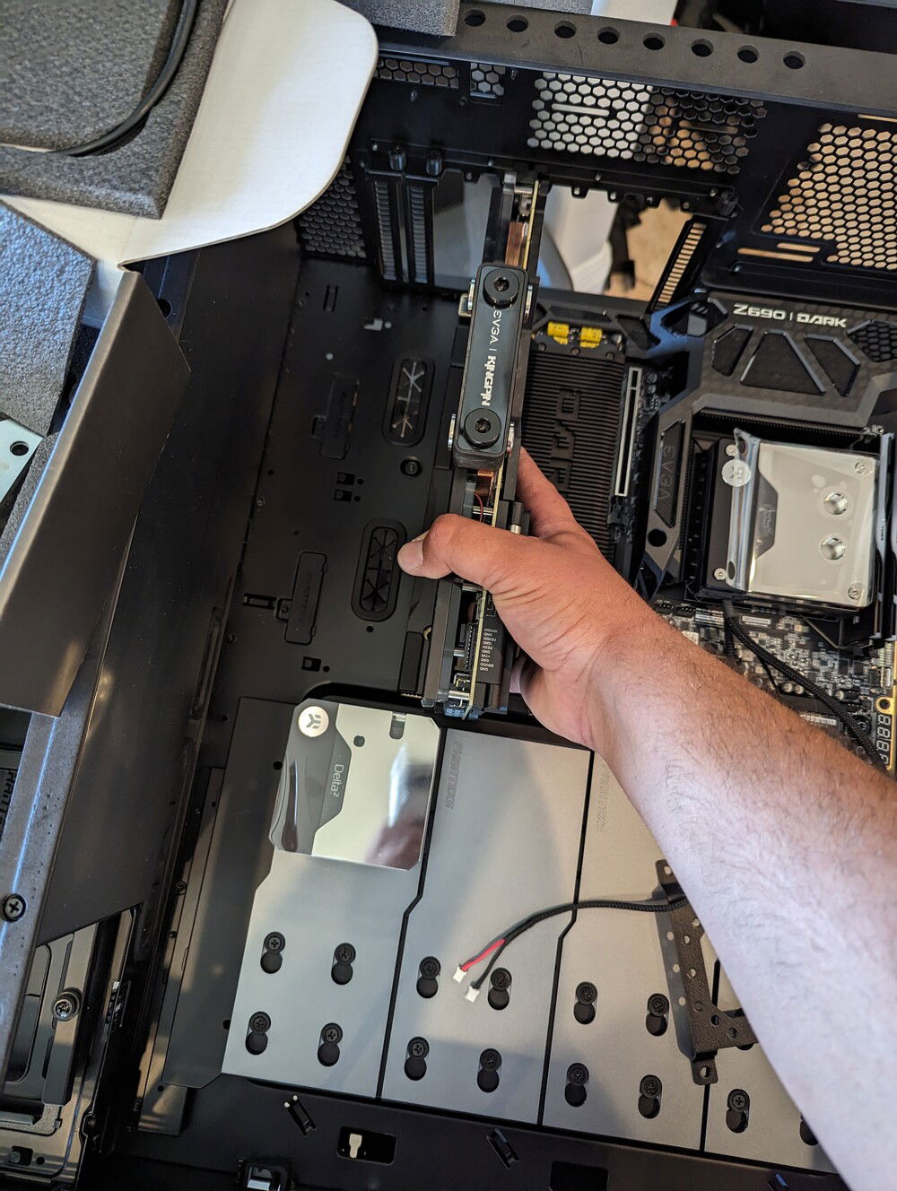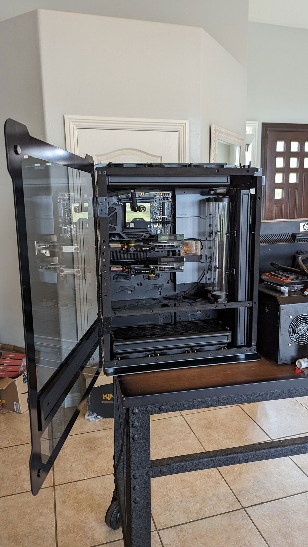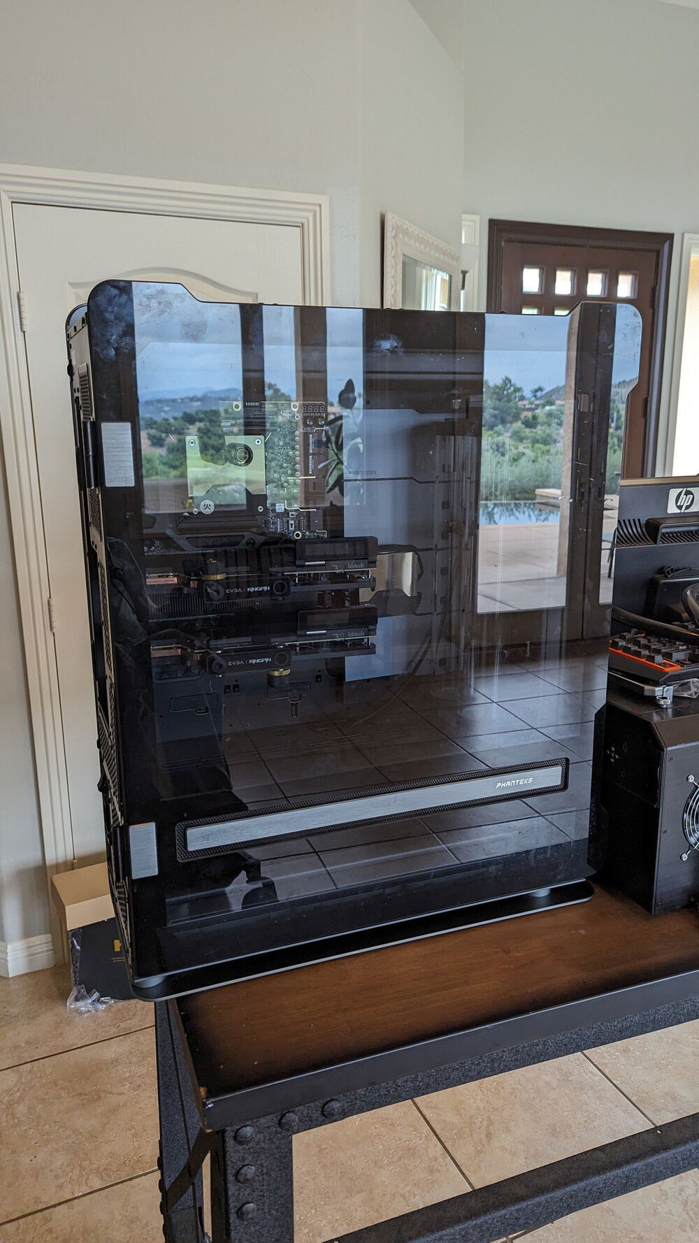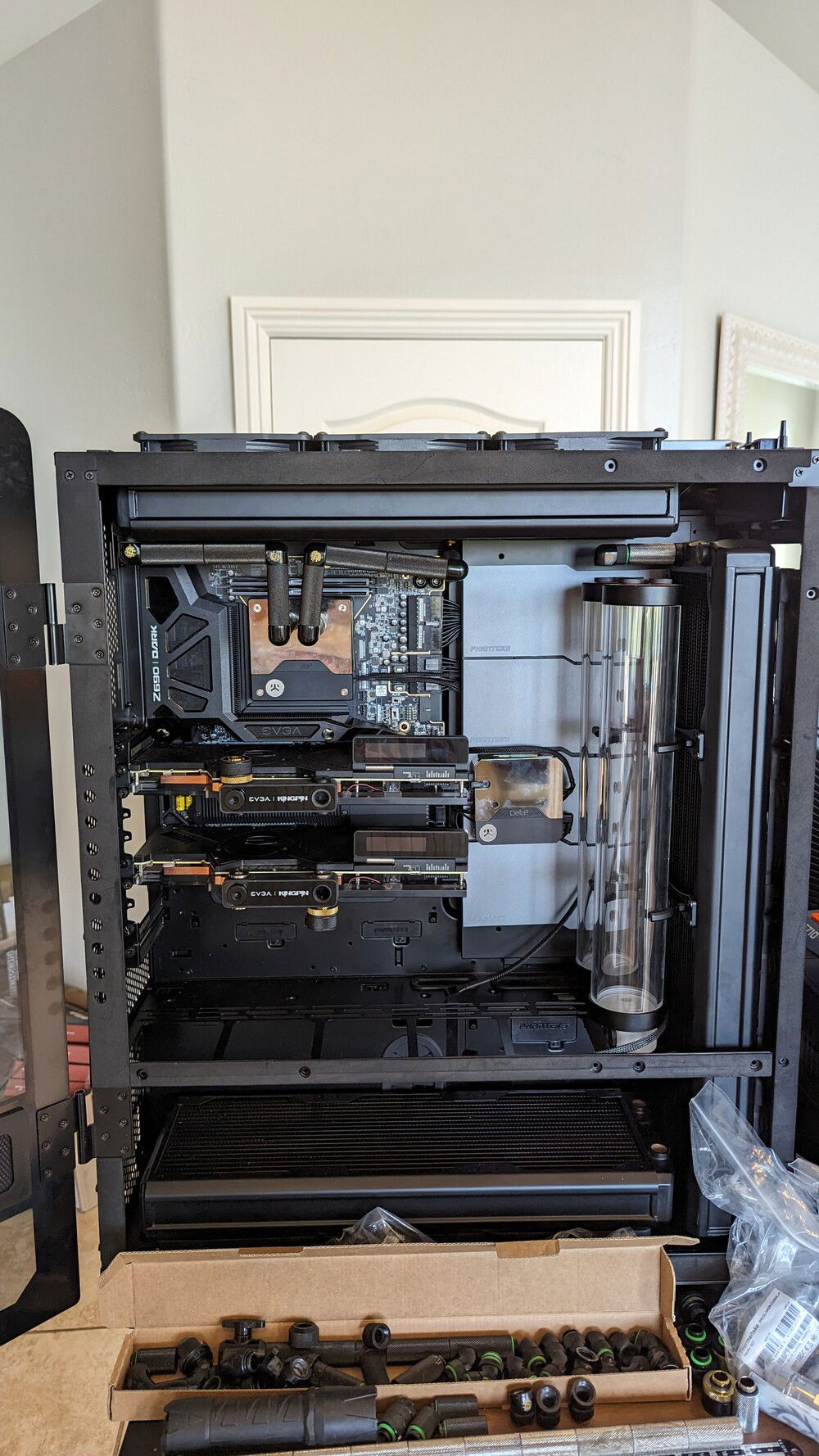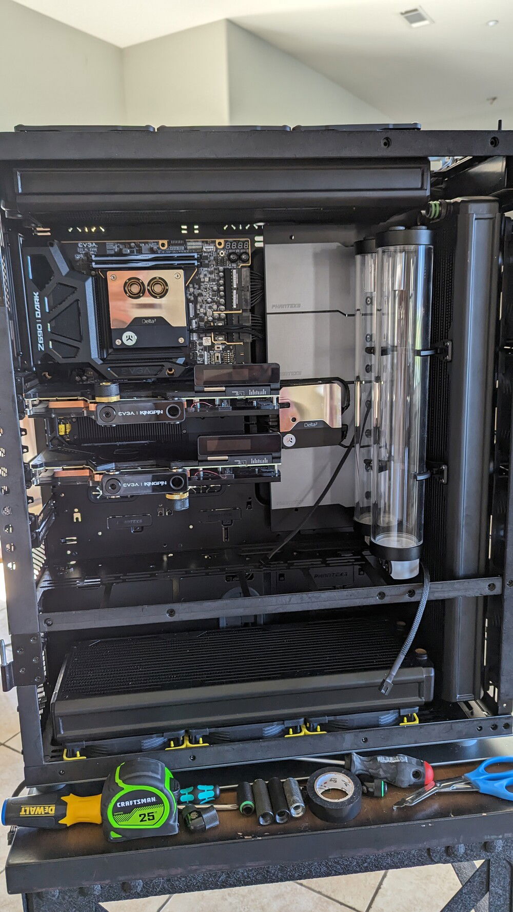 EVGA KINGPIN themed SLI build. Honoring the end of EVGA and Vince's (kingpin) and his team's contributions to the hobby over the years. Goals for the build are: build a gaming pc capable of exterme oc when needed. Able to run oced 24/7 very quietly. Using a tec so a dual loop was necessary.