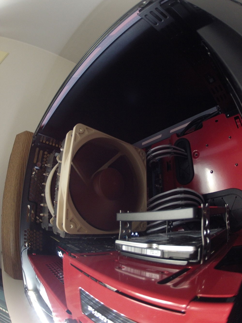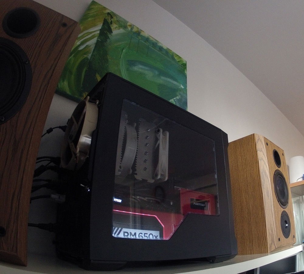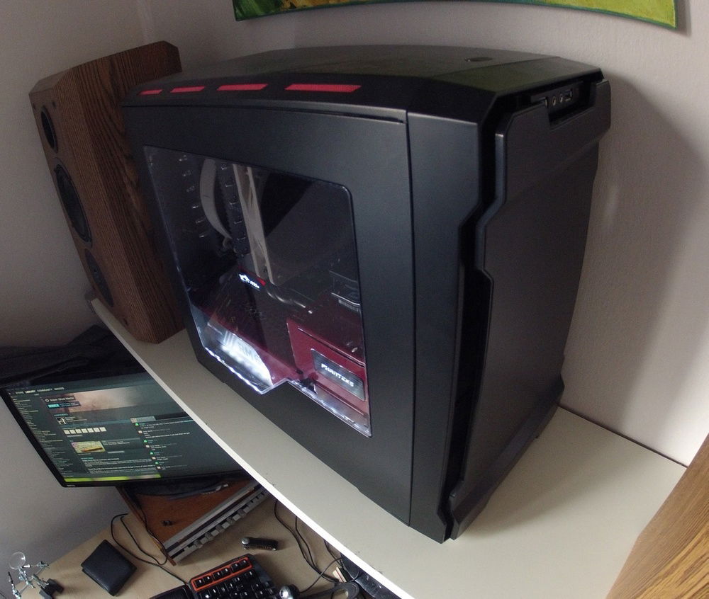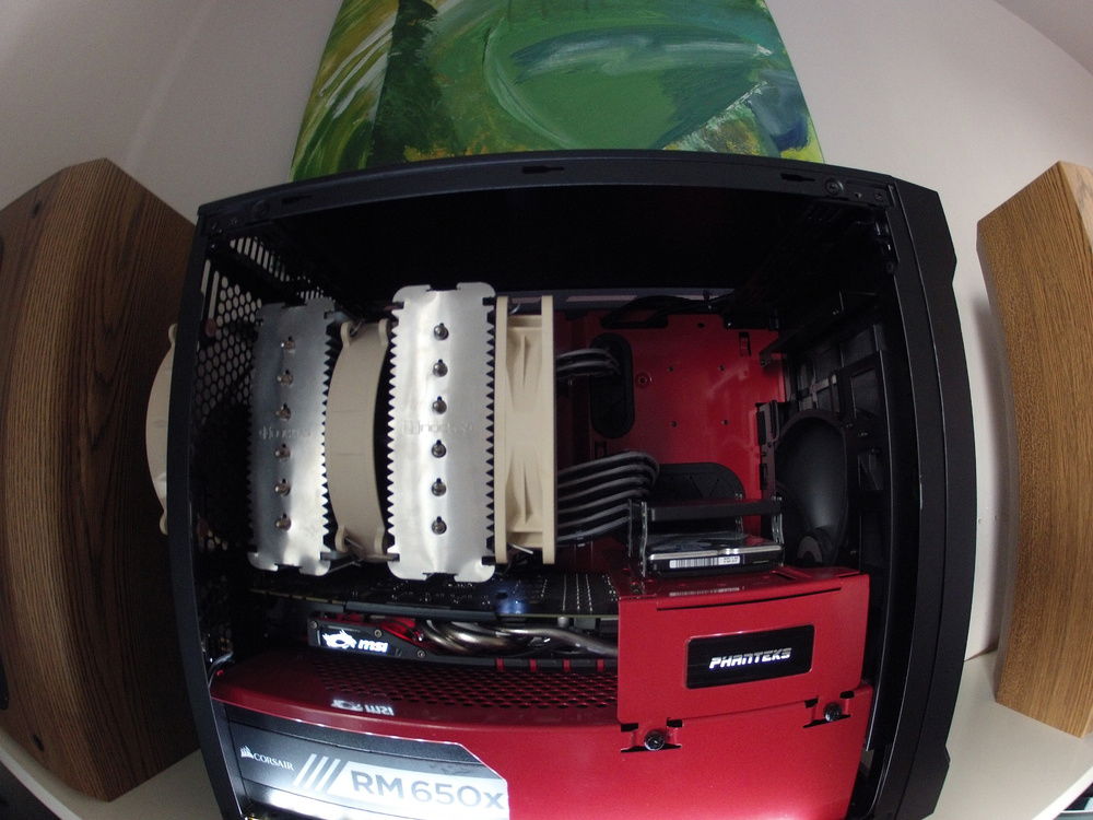Built on a budget with mostly used and discarded parts. Case and cable kit are the only parts that were bought new. Fell in love with this case when I spotted it on reddit a few years ago, and while I think it is a great case, it has very poor airflow. I have modded it slightly to improve airflow: Front panel is spaced out ~1cm, and I cut a hole in the bottom for an additional 140mm fan. This fan also has a dust filter. Lighting is a simple white led strip on the bottom of the case, with a toggle switch added on the rear of the case. I use a Zalman 6 channel fan controller for the fans as they are all 3-pin and the motherboard only controls pwm fans. The shiny aluminium brackets on the Dominators had to be removed for them to fit under the D14. I've been happy with the build, and it stays relatively quiet due to the noctua fans and 0db modes on the gpu and psu. Pictures were taken with a GoPro Hero 2 HD, so that's the reason for the over the top fisheye effect and the somewhat mediocre image quality.