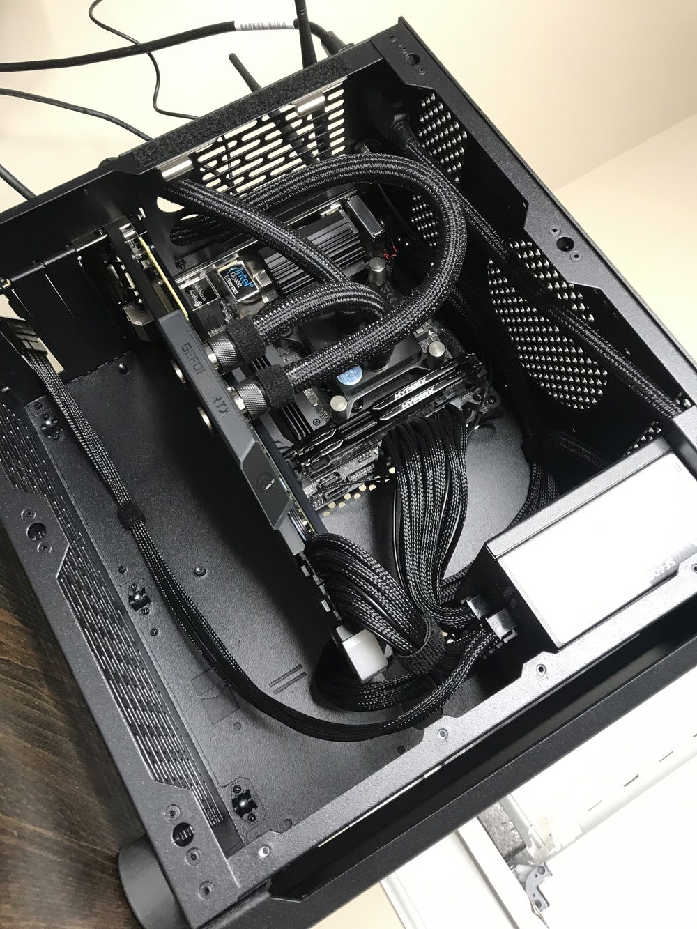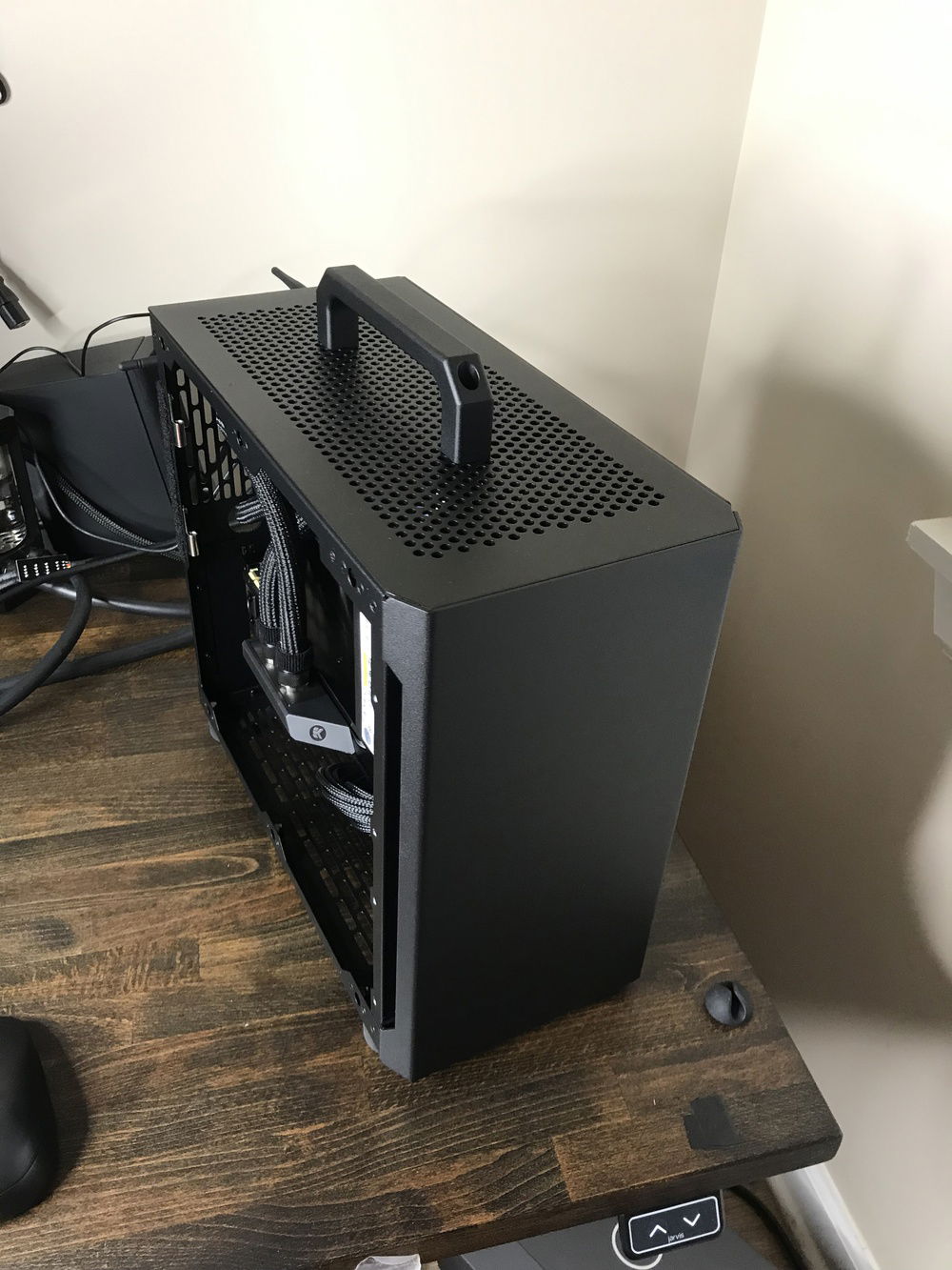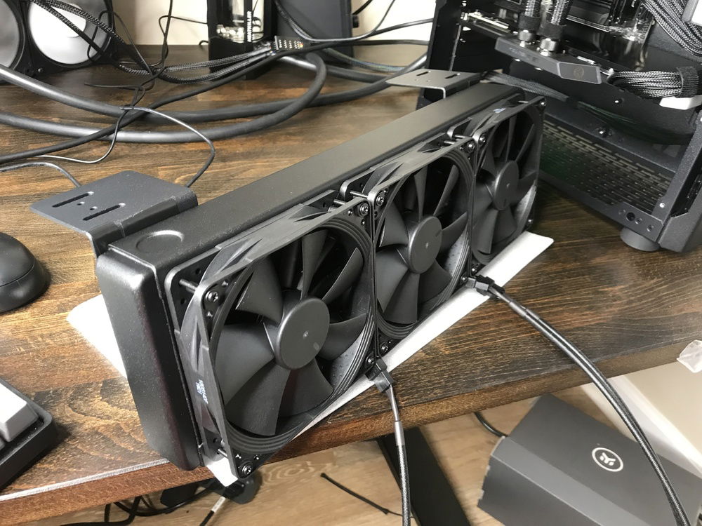 A build whose goal is to be as minimal in appearance as possible. Pump, reservoir, and radiator exist outside the case to prevent heat and dust from being pulled inside. Still working on tidying up the desk.