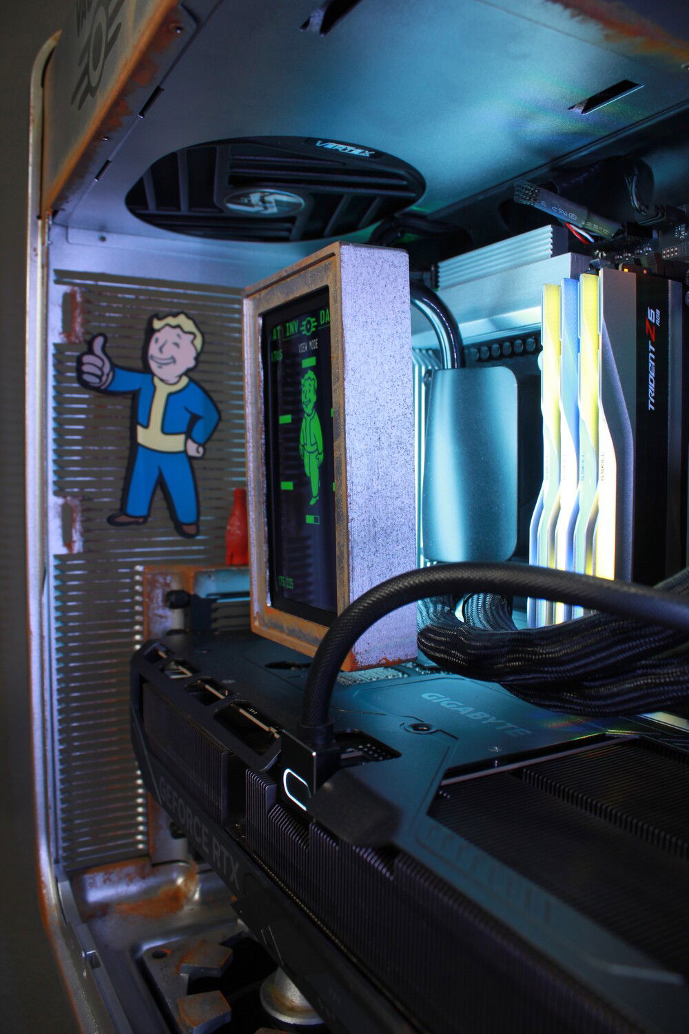 A lot of work went into customizing this build: fan shrouds, AIO cover, and a hand-painted rust effect.