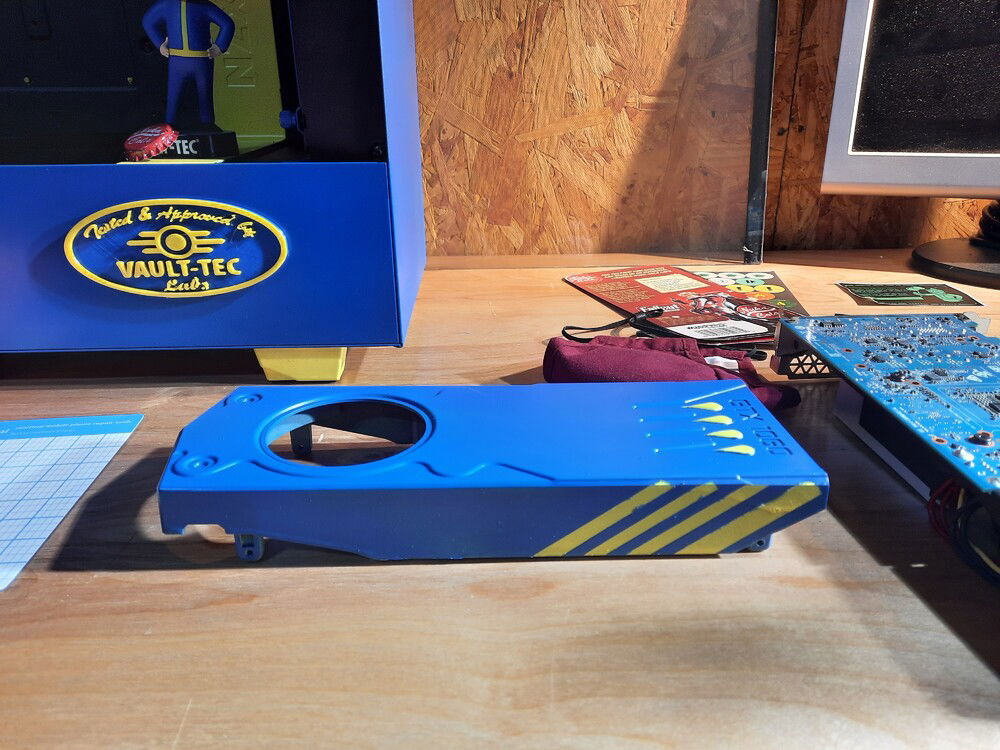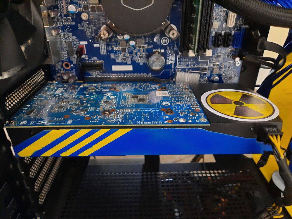 This build was inspired by the Bethesda game Fallout. I started with an NZXT h510i case, I dissembled the case, sanded and painted the case and internals of the case to match the Vault-boy theme. The GPU was also painted to match the theme of blue and yellow. 3-D printed emblems and stickers to give it the game feel. I used blue sleeved 24pin power cable to match the case. This was a fun build for a young boy who loves the Fallout games.
