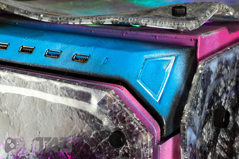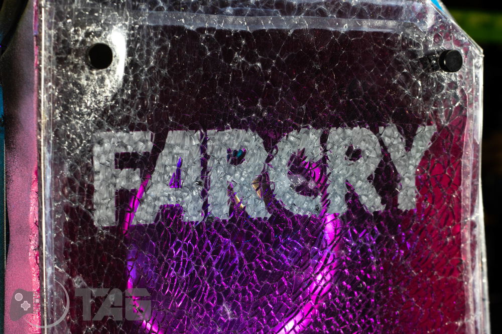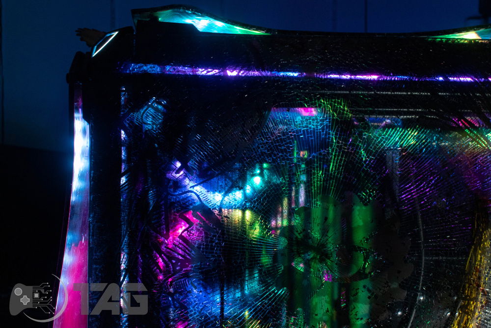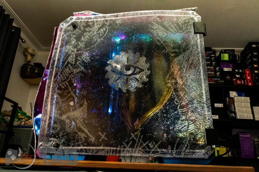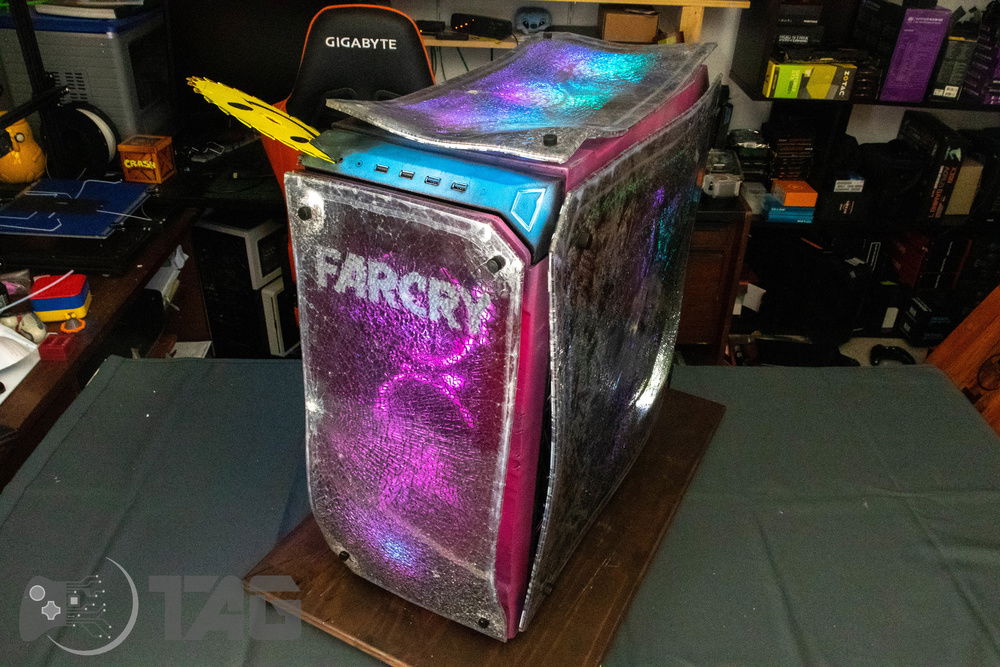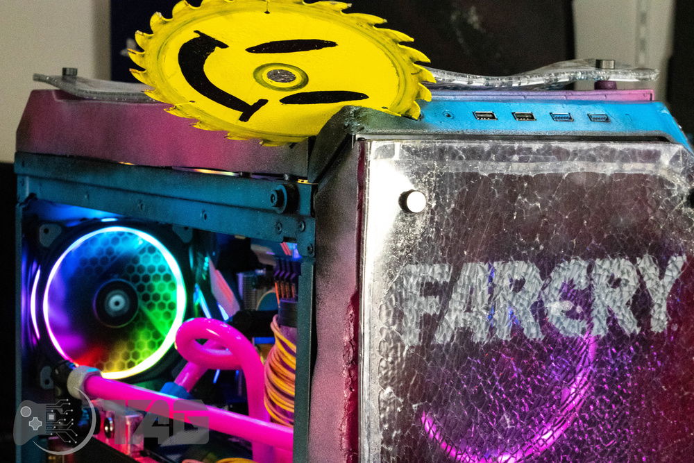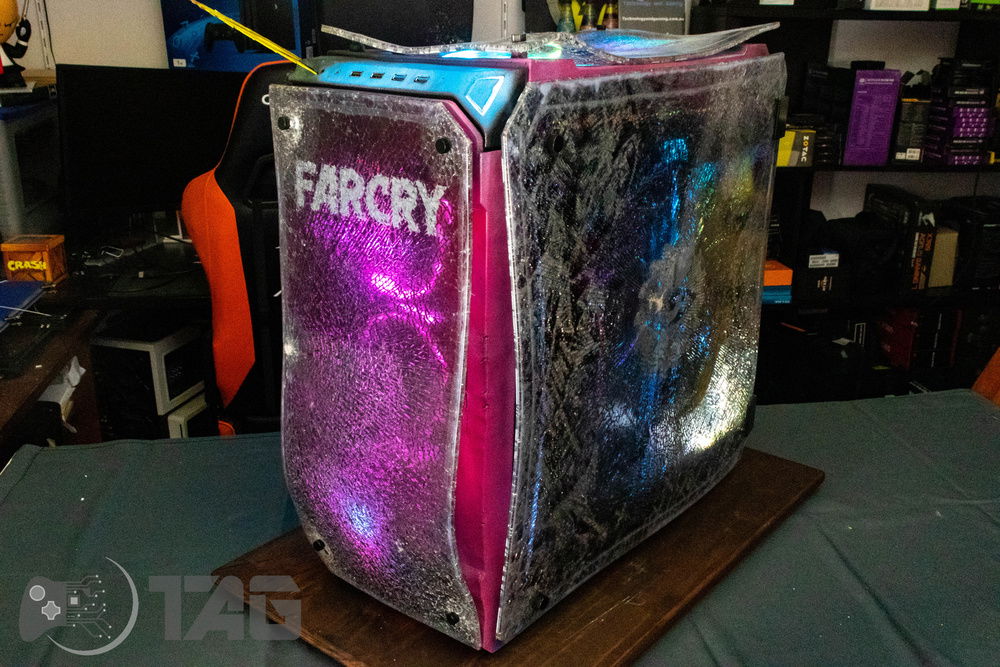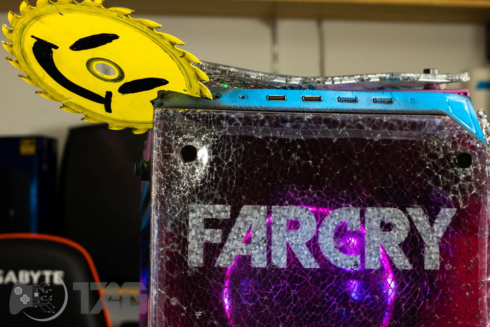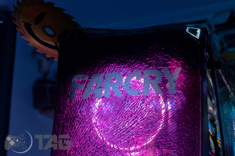 Here are the Far Cry New Dawn Beauty Shots! The shattered glass looks amazing in low light! Based on the antagonist gang from Far Cry New Dawn as well as the over saturated colour scape as seen in game. This new Far Cry build is also heavily inspired by the original Far Cry 5 build Eden’s Gate build we completed last year! The Smiley faced saw blade fired by the resistance is jammed in the top corner of the Highwaymen case! Combine that with broken UV printed glass and the crazy colour scheme and the build turned out splendidly!!