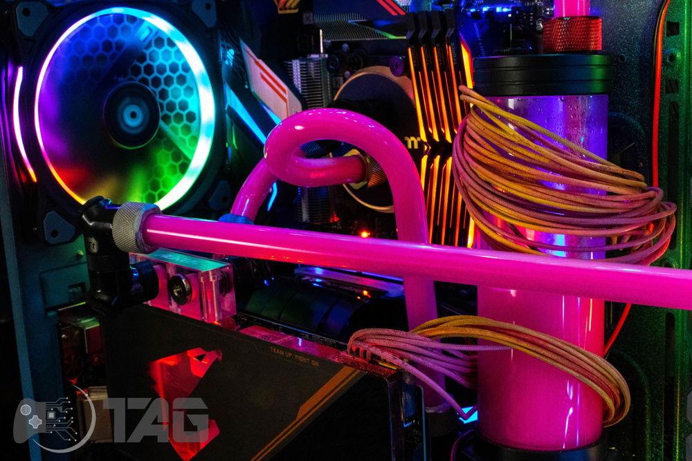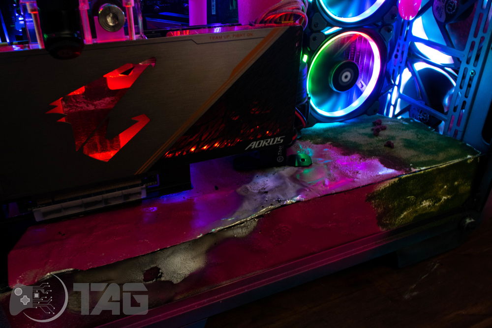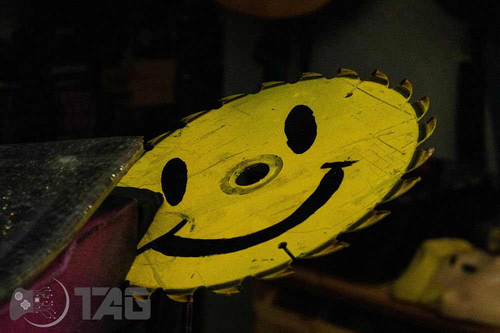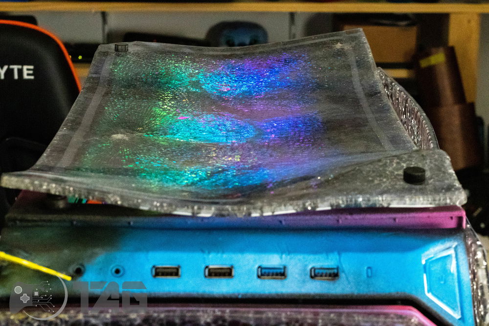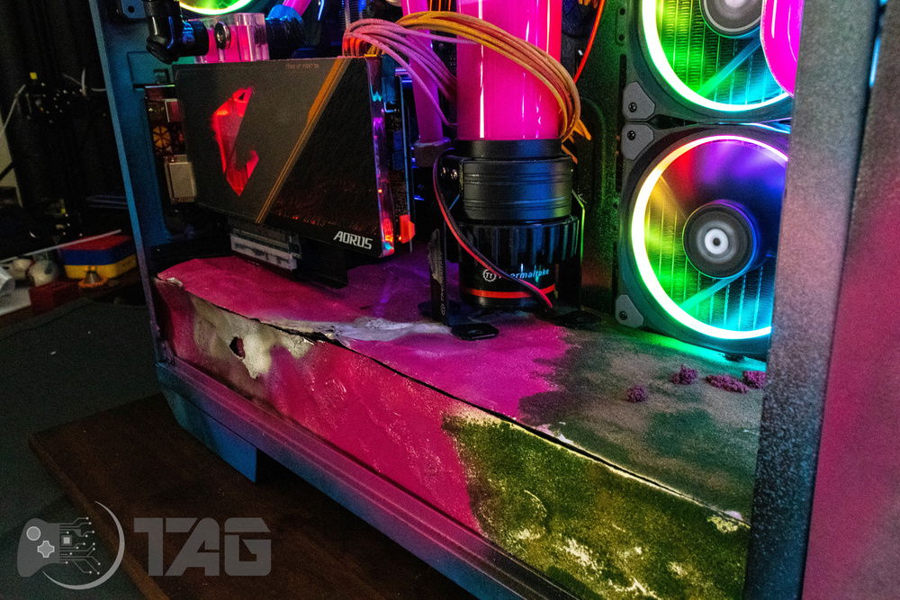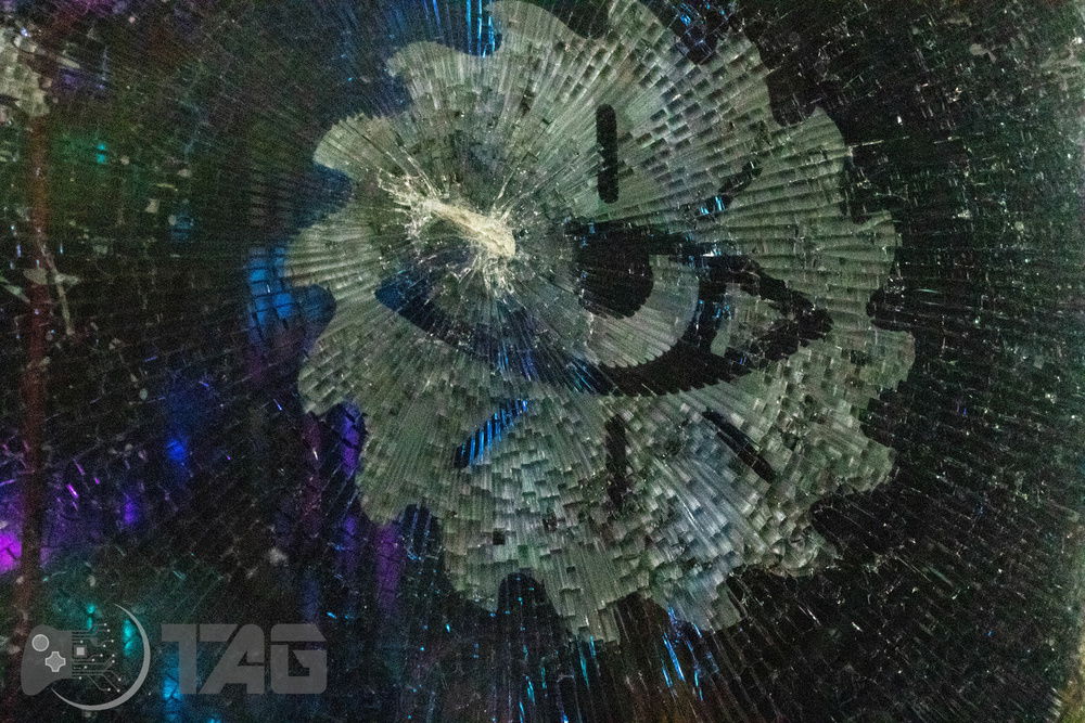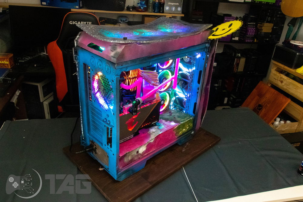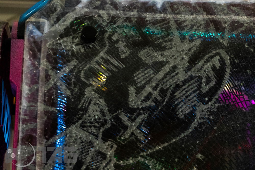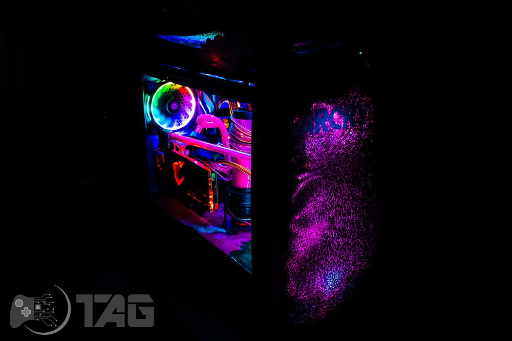 Here are the Far Cry New Dawn Beauty Shots! The shattered glass looks amazing in low light! Based on the antagonist gang from Far Cry New Dawn as well as the over saturated colour scape as seen in game. This new Far Cry build is also heavily inspired by the original Far Cry 5 build Eden’s Gate build we completed last year! The Smiley faced saw blade fired by the resistance is jammed in the top corner of the Highwaymen case! Combine that with broken UV printed glass and the crazy colour scheme and the build turned out splendidly!!