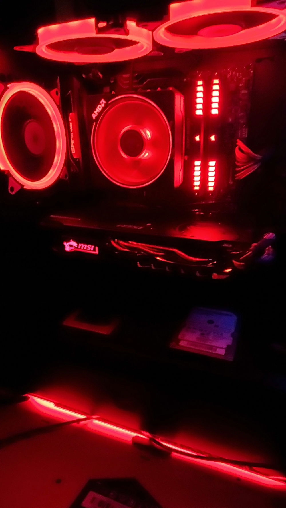 Ryzen 7 1700 4.0ghz OC, MSI x370 gaming pro motherboard, 16gb corsair vengeance RGB RAM 2X 8gb 3000mhz DRAM, 4X case fans 140mm 1 front 2 top one back, Wraith prism cpu fan, 1Tb crucial ssd, 500gb samsung 2.5 hdd, COUGAR PowerX 700w 80+ bronze PSU, and a msi rx580 8gb gpu all wrapped up nice and neat in a DarkFlash T20 case.