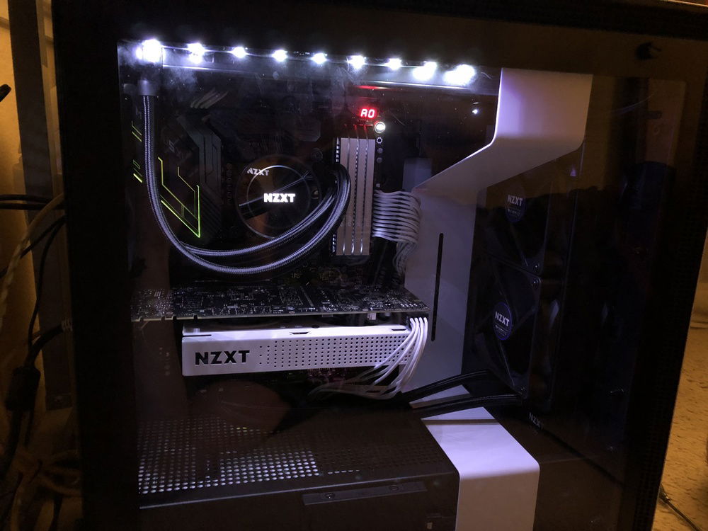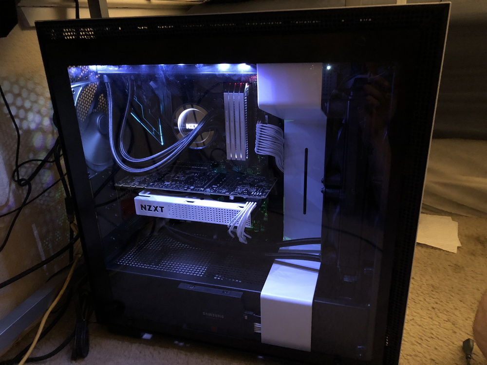 First time building a pc by reading online and watching some videos. Spec list is below and I love my new pc. Would like to upgrade the gpu and add a custom cooling loop next. I also need to fix the cable combs on my gpu. NZXT H700i ASUS Maximus XI Hero WiFi Z390 Intel i7 8700k Nvidia GTX 1080 FE Dominator Platinum 32GB 4x8 Samsung Pro 970 m.2 512GB SSD Samsung Pro 970 SATA 1TB SSD Corsair RMx 850 White Modular NZXT Kraken x62 AIO for CPU NZXT Kraken x52 AIO for GPU NZXT Kraken G12 Bracket for GPU NZXT AER RGB 120 & 140 fans