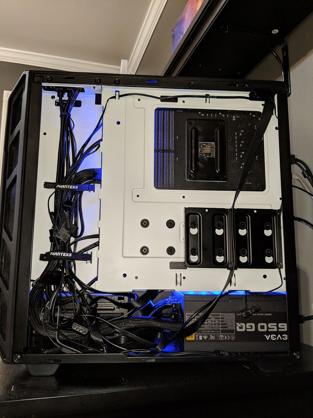 Built for gaming but also content creation. Budget around $1200 (tower) Bought the parts over a years time, cable management is probably Ehh, at best. I tried routing cables to make them disappear but in some cases, something wouldn't fit well. Overall I'm proud of it for a first time. With time I will change things out like add CableMod custom cables and fill the DIM slots with more RAM, change the CPU cooler to an AIO, possibly add some RGB LED strips.