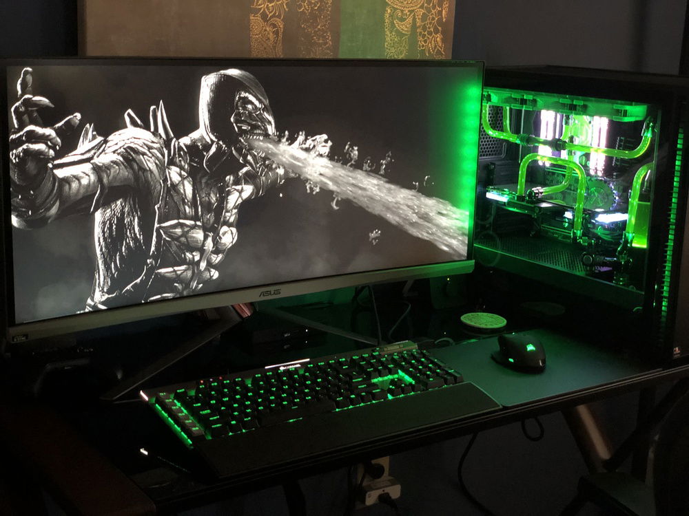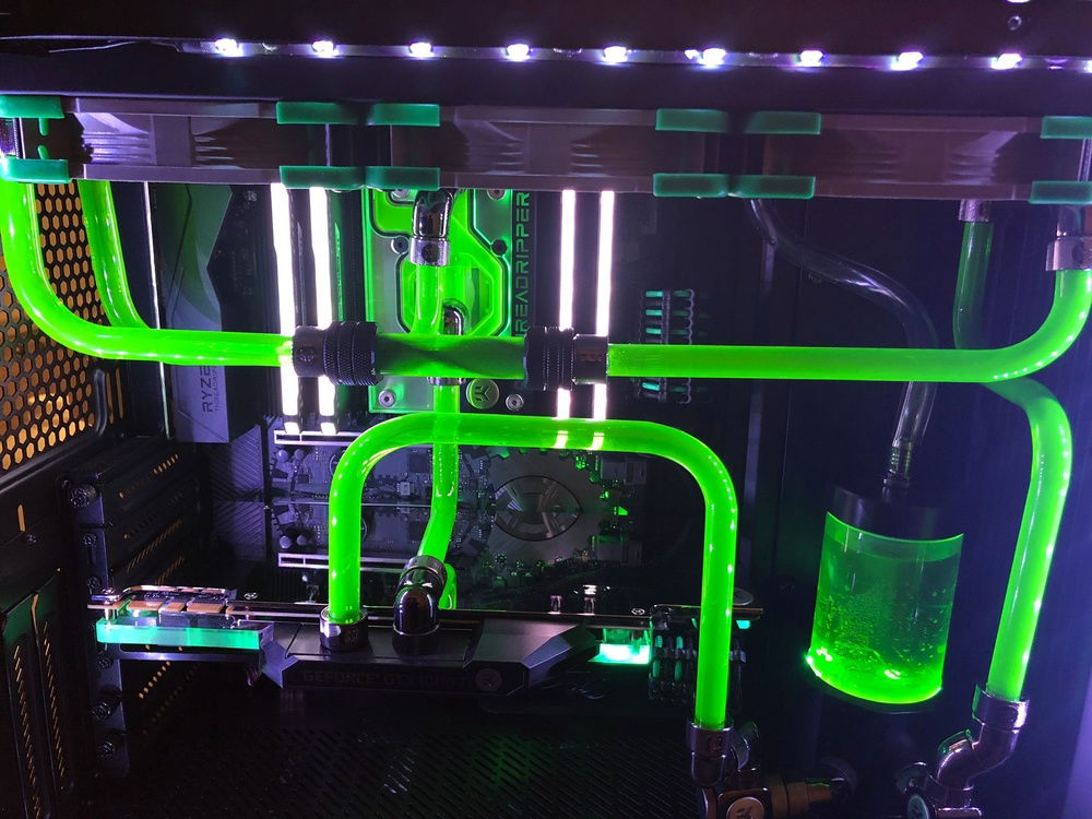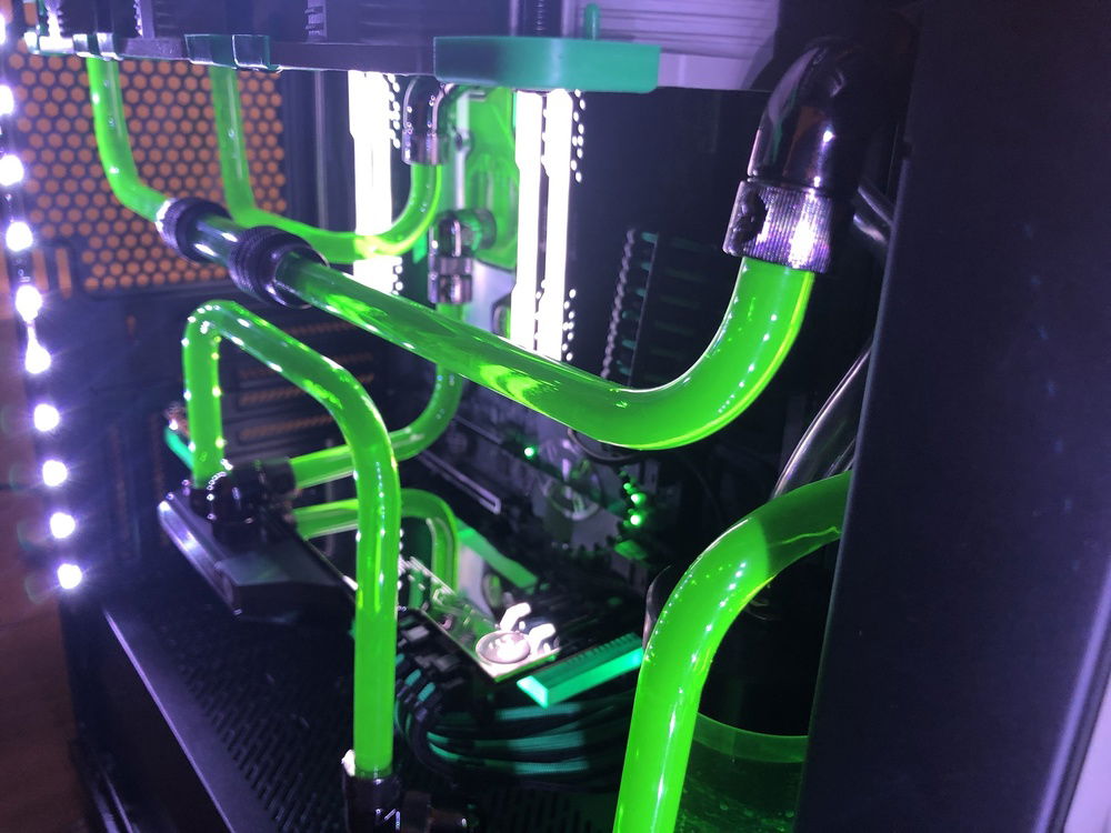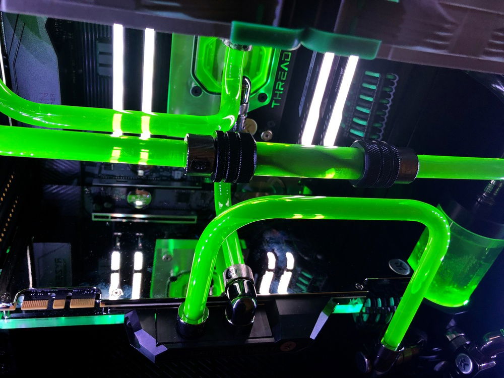 First attempt at water cooling, featuring EK parts. Went the mono block route for CPU and Motherboard. As for case fans, decided on the Noctua Redux fans with green bumpers because they fit the color theme of Black, Gray, Green and complimented the ASRock Taichi board perfectly. Also added Cable Mod cables in black and green and went with EK Cryofuel in Acid Green.