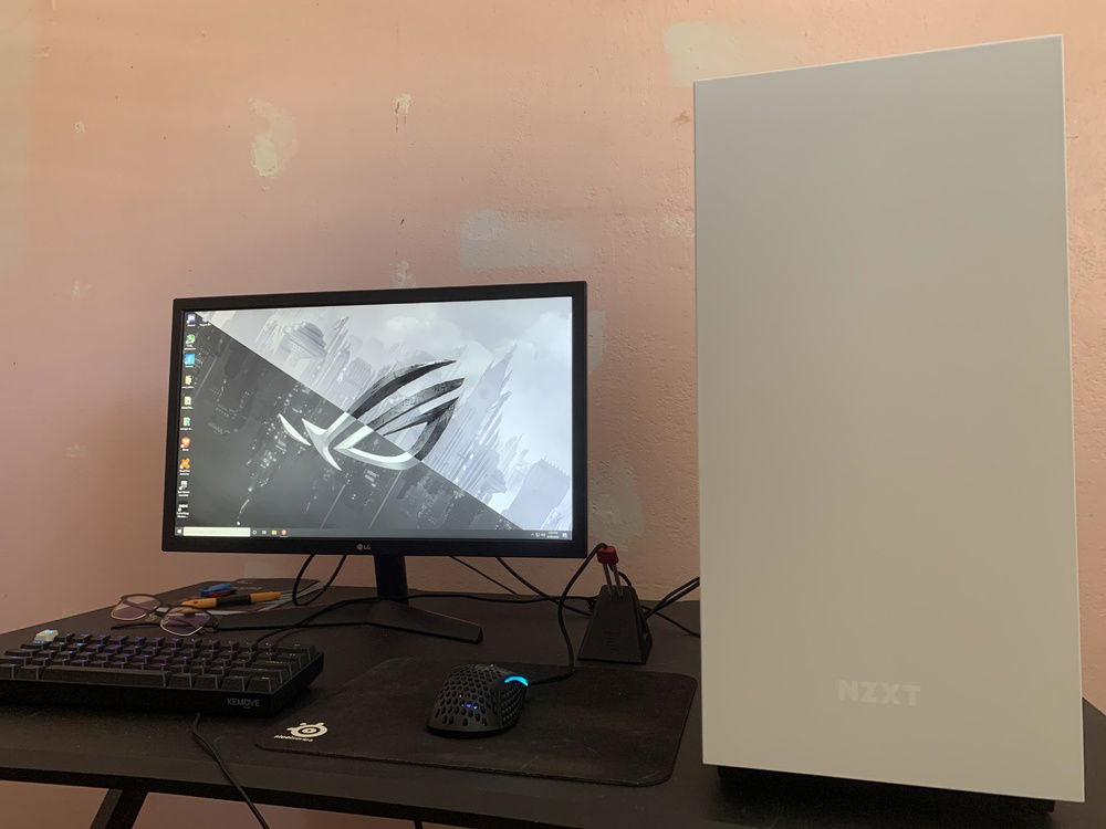 First ever build, just freshly built recently on mid april , was looking for some time at setups videos and such and finally decided to shoot the shot! It is very simple, no RGB other than the AURA of the mobo, lights, or extension cables to make it look nice yet but coming soon hopefully!