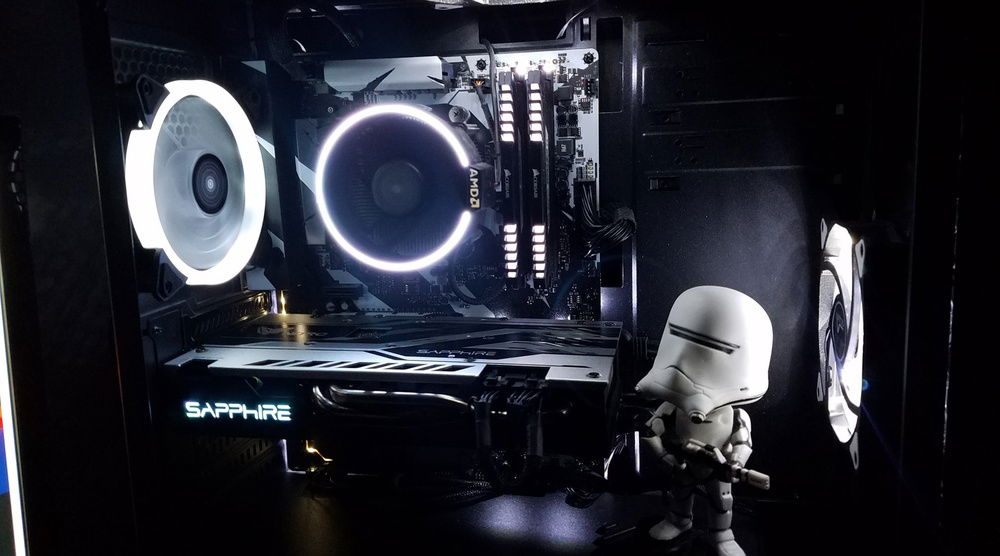 Raidmax Zeta B04 Ryzen 5 2600 w/ Wraith Spire RGB SAPPHIRE Nitro+ RX 580 MSI B350 Krait Gaming 2 x 8gb Corsair Vengeance LED 3200 mhz 450w 80+br EVGA Power supply x2 Vetroo white LED 120mm fans x1 Raidmax white LED fan 120 SandDisk SSD plus 1 tb Seagate Barracuda Funko pop: First order Firetrooper