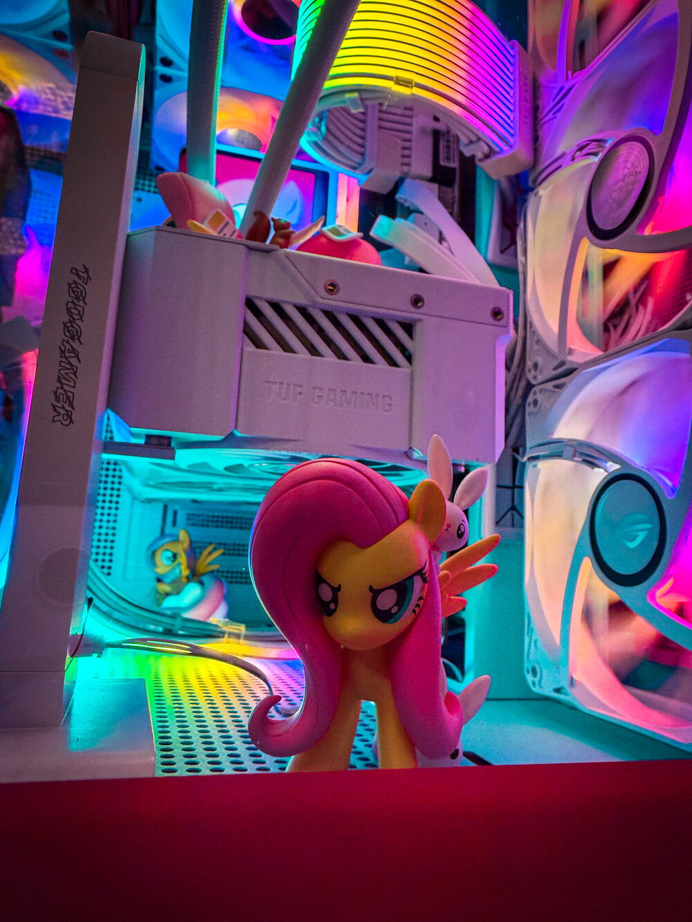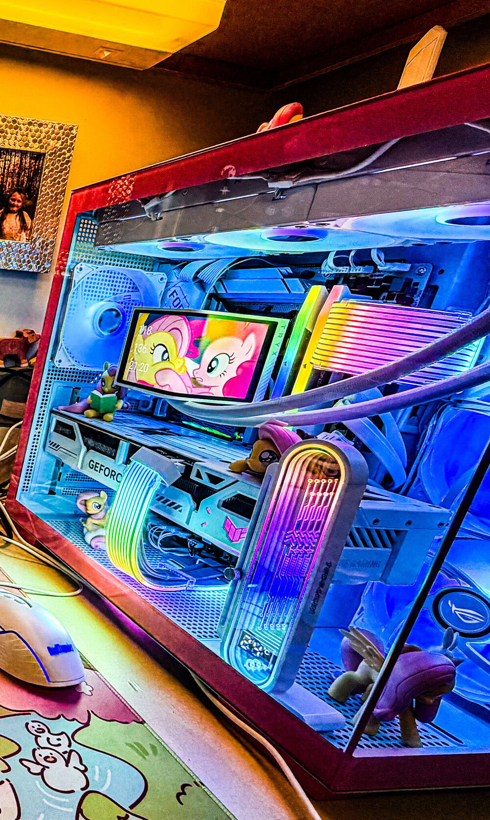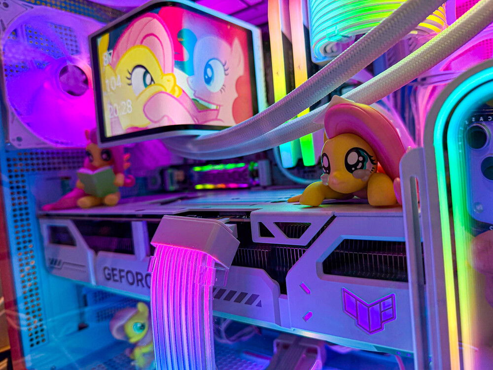 Inspired by My Little Pony’s Fluttershy and Pinkie Pie, this build fuses top-tier gaming power with a soft aesthetic—where baby blue panels, bubble-pink frames, and rainbow lighting meet creative energy.