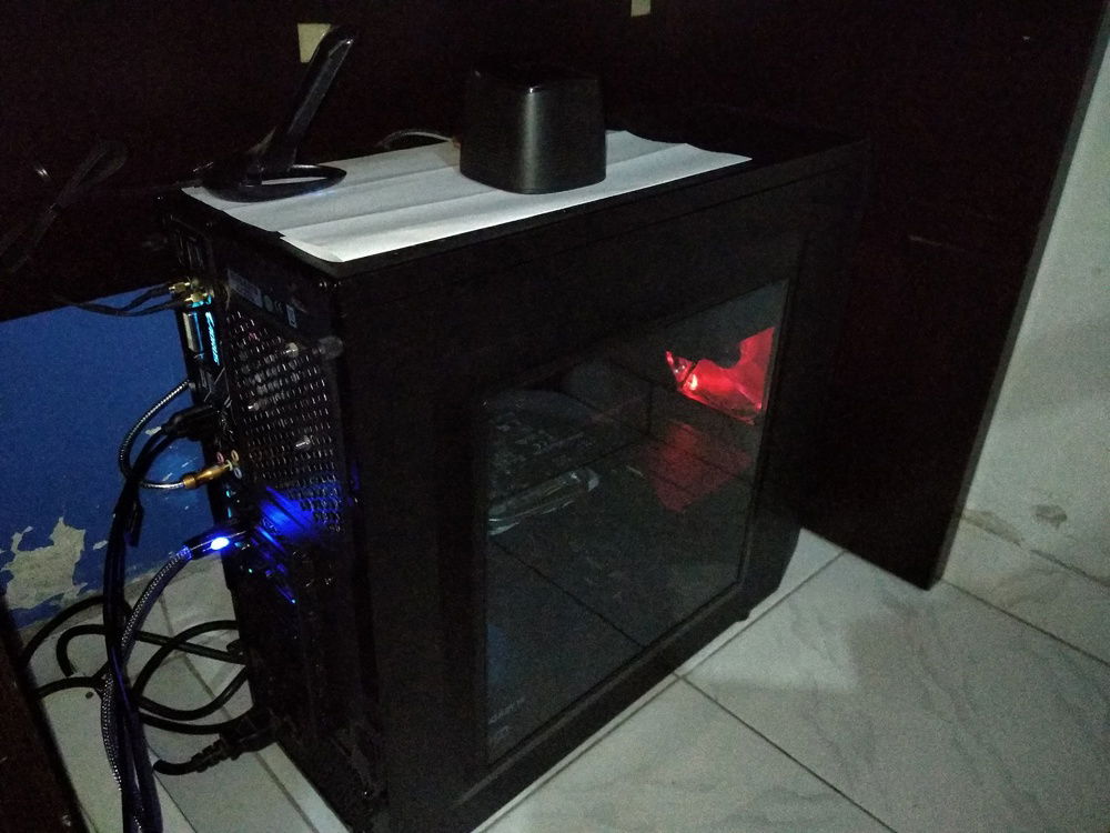 On the top of the case I have a piece of paper to prevent dust form going in the 240mm fan grid which i am currently not using. I also have a wifi antenna and a speaker connected.