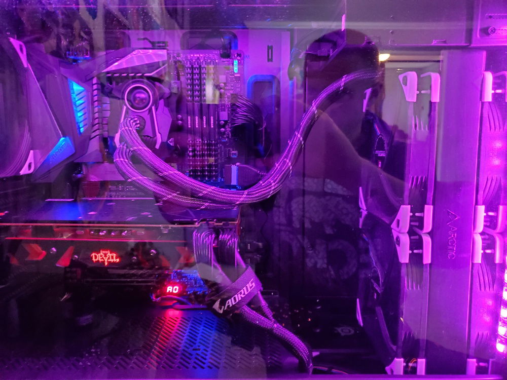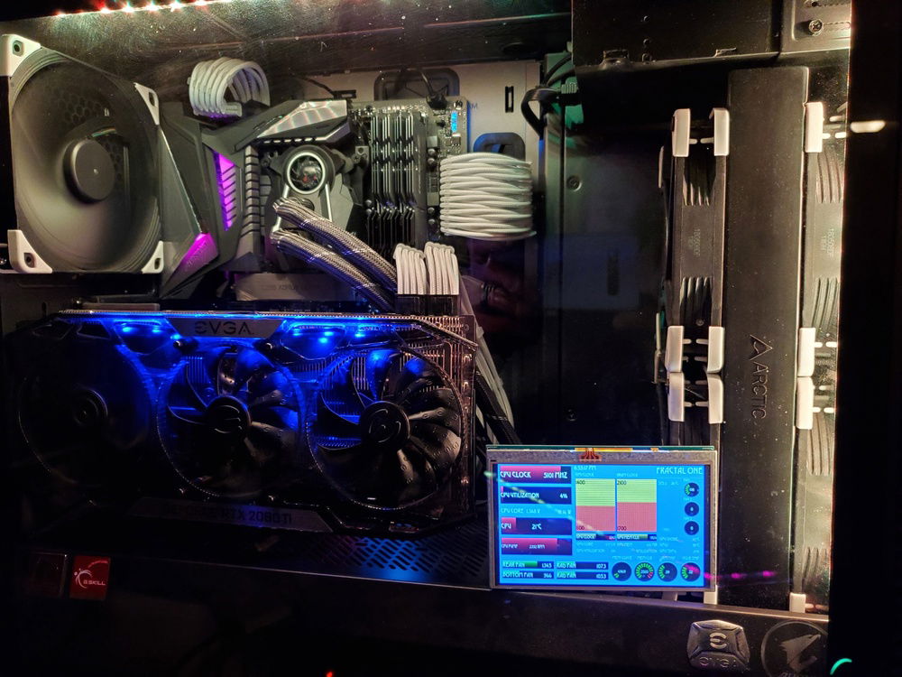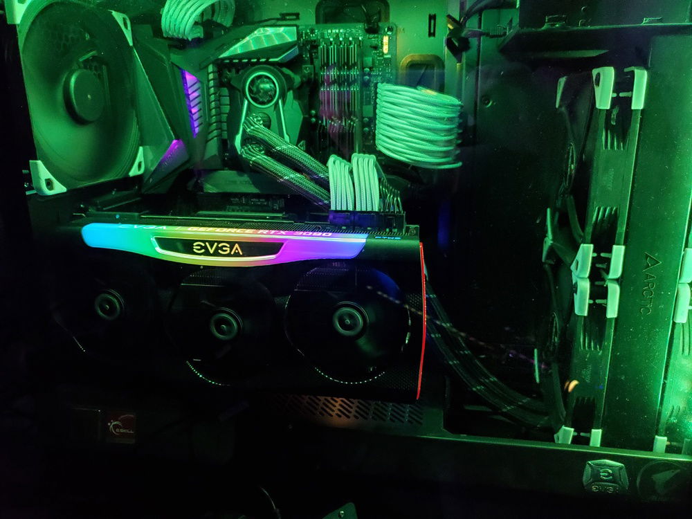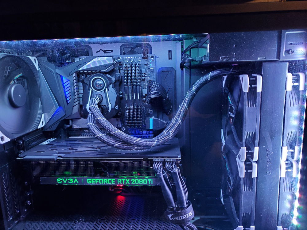 Core i9 9900kf, 5.0ghz 1.35v. AIO cooler instead of air. Same motherboard and ram, psu, and hard drives. Ended up having to get Evga Rtx 2080 ti FTW3 because I couldnt get my Aorus waterforce. Have a Galaxy theme going that I like. Did a vertucal mount on my gpu too. Replaced the thermal compund on the gpu with Noctua Nt-H2. Dropped temps 15°C. The 9900kf at 5.0ghz max temps on prime95 hits 88°C.