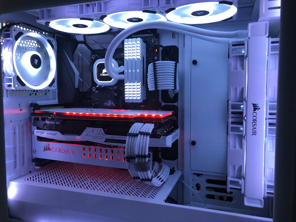 GPU is an ASUS Strix 1080TI 011G with a custom painted white shroud. V1tech made a custom back plate & GPU bracket that you will see in the photos. Also it is iCue compatible!