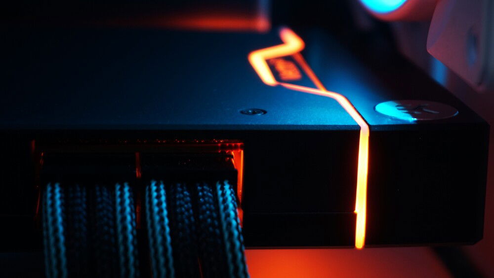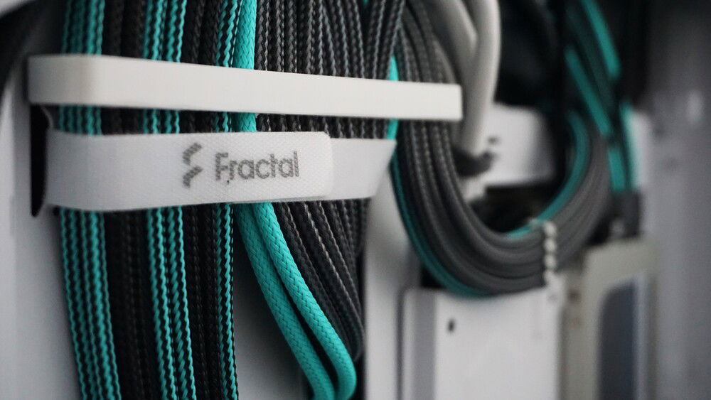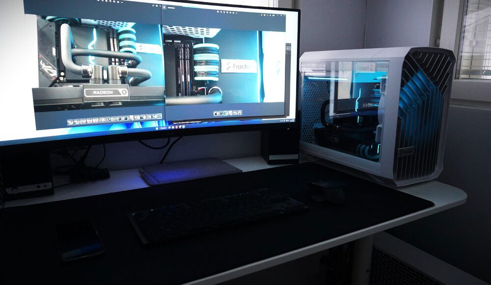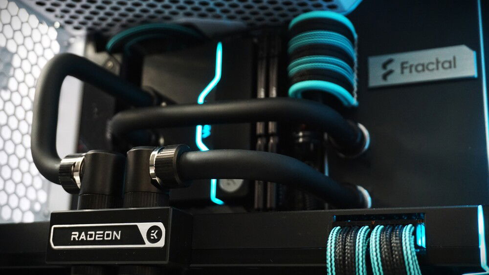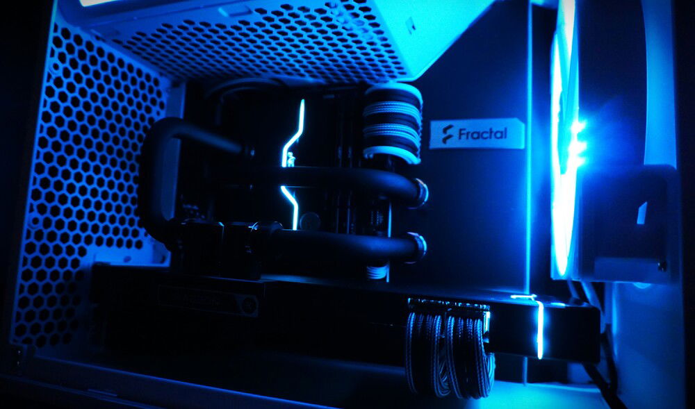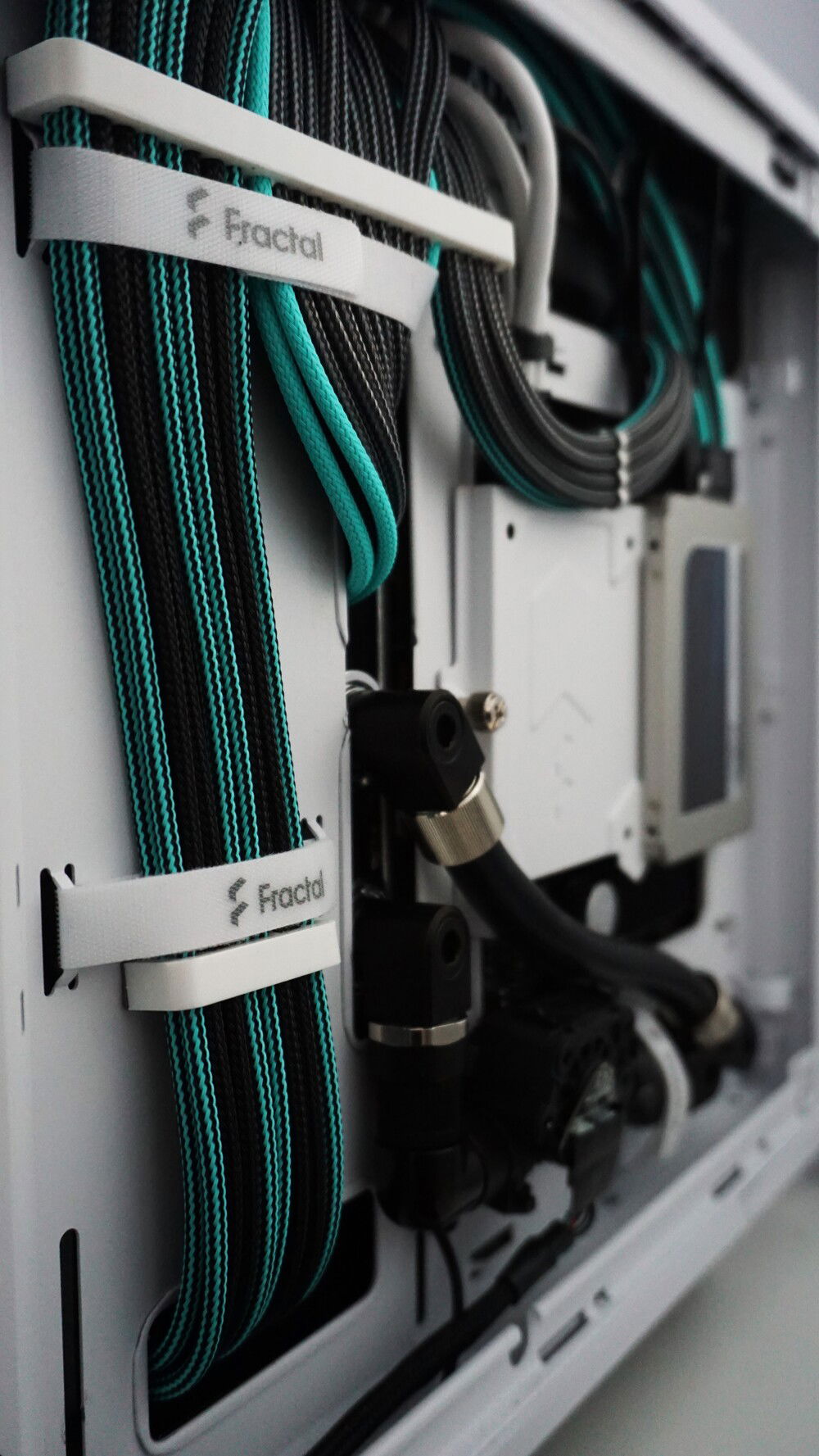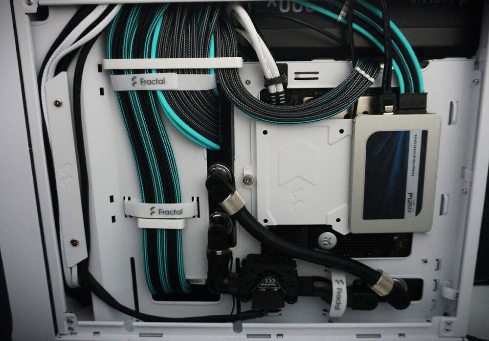 A custom loop build in a Fractal Torrent Nano White RGB. A custom backplate serves to route the tubing behind the case and stash the flow and temperature sensors out of sight. Black acetal contrasts with the nickel details on fittings and the cyan highlights on the cables and lighting gives the build a signature look.