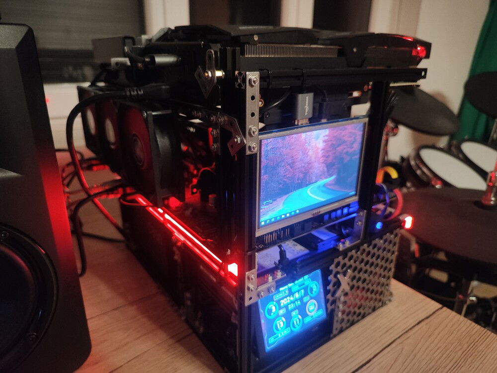 I needed to have a completely modular machine, so i could upgrade it, or change parts out, or modify it freely anytime i wanted, but i also wanted a completely unique case (or frame for it), with extras, like displays for my use scenario, RGB lights, a great cooling solution so it could also handle a decent overclock.. This is how the Frankenstein was born!
