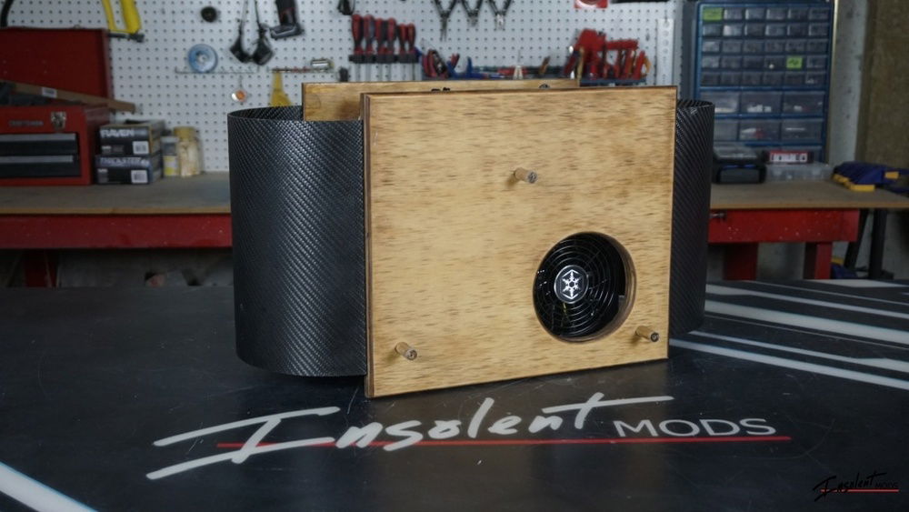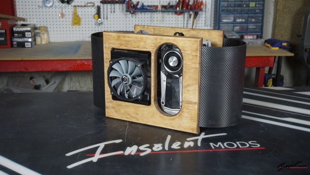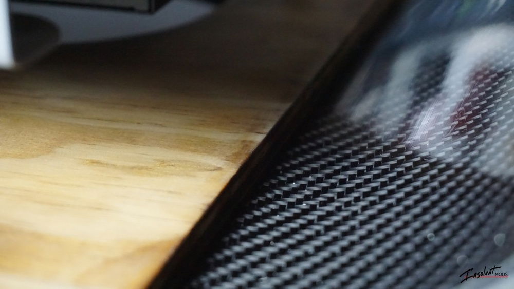 Yes, it's real carbon fiber. The birch plywood has a vintage maple dyed finish sanded to a satin for a rustic look. The tray is my own design and uses the front I/O panel from an InWin 303.