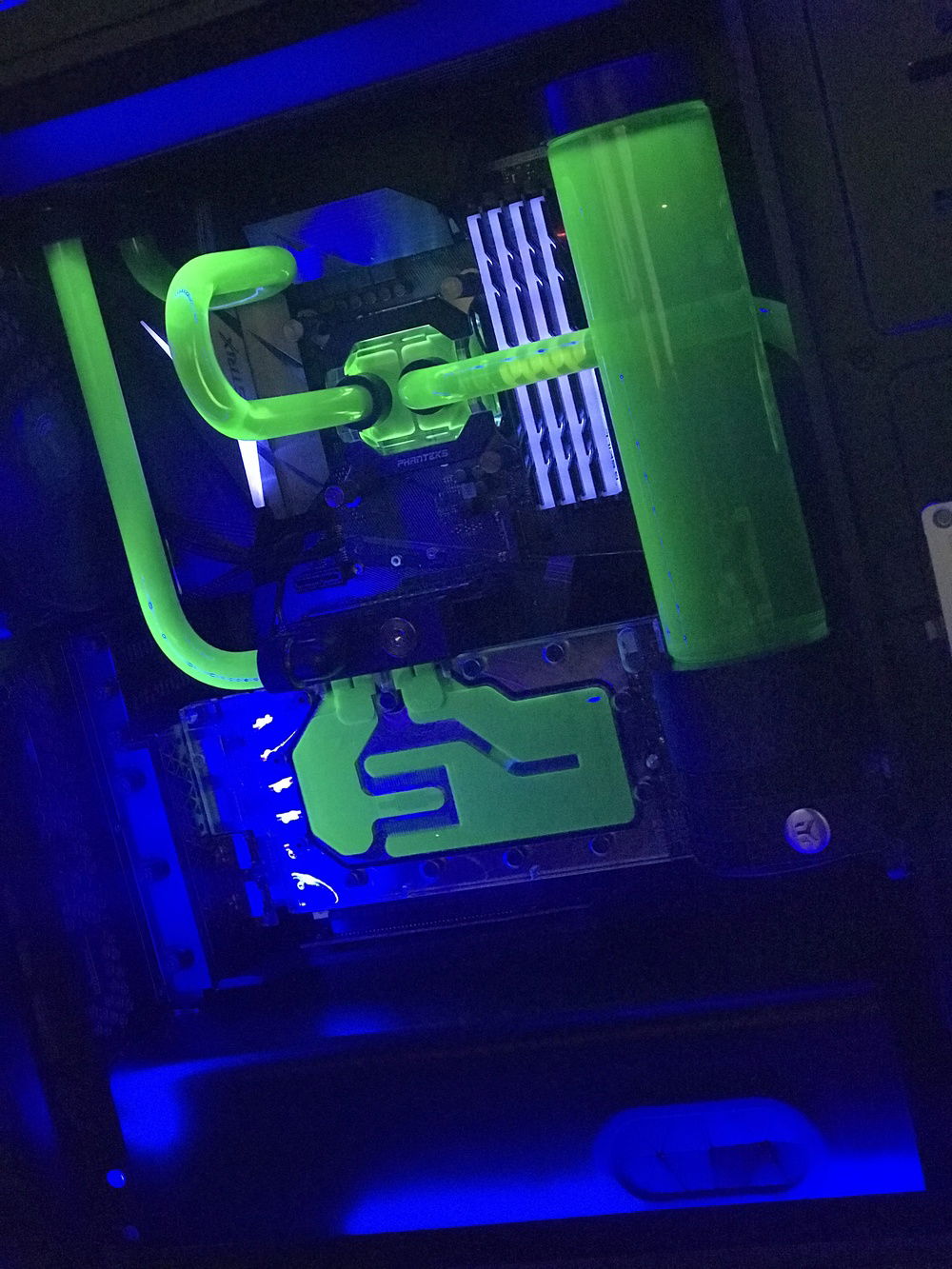 Main gaming rig. Lot's of RGB. Custom water cooling loop with EK Reservoir Pump combo. EK Block for the GTX 1080Ti. Phanteks block for the CPU. 360mm radiator up top and 240mm in front both PE Series (38mm thick). 5 EKWB Vardar Fans in push on the radiators. Coolant is EK Cryo Acid Green. Phanteks vertical gpu bracket was added a year after the build. Added some soft tubing for the front radiator that runs to the gpu and from the pump.