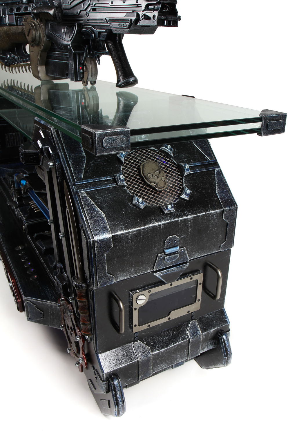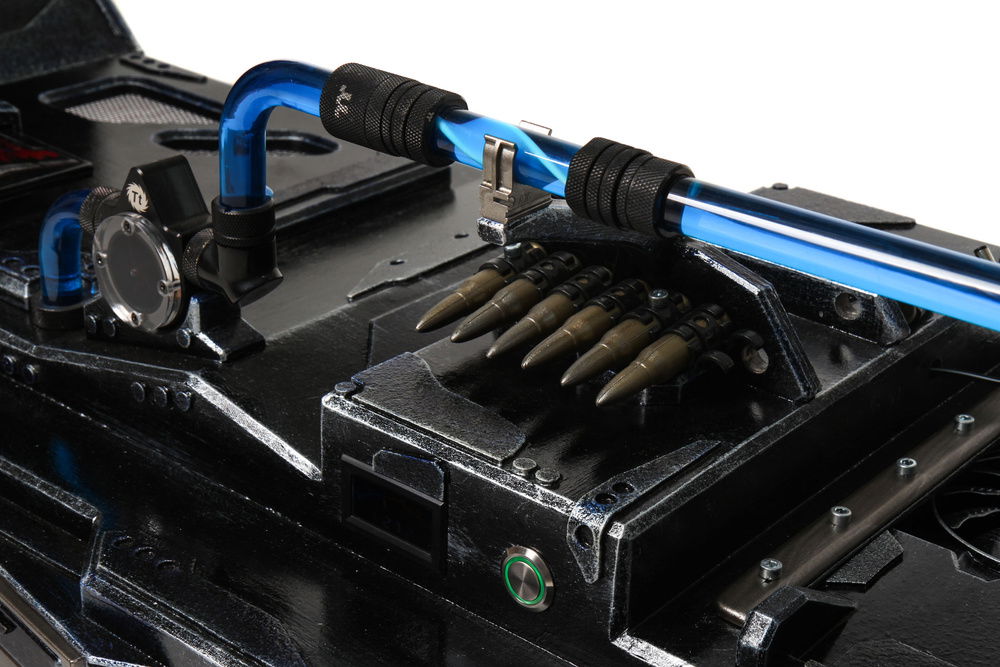 It has muzzle fire leds and a charging lights. A nice feature is also that the Lancer is also an external 1Tbyte Harddisk and the internal SSD registers when the Lancer is in its gun locker space.
