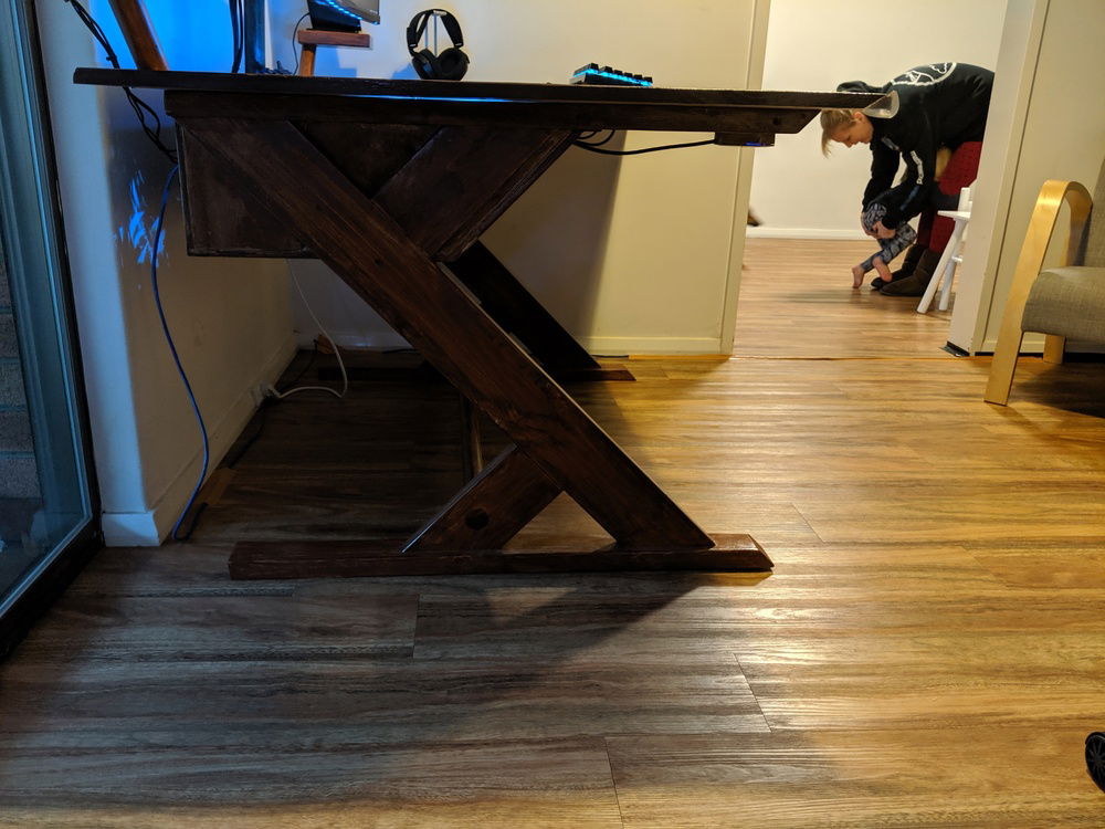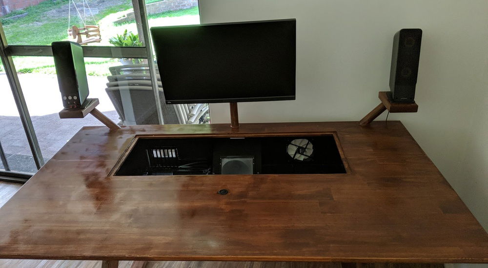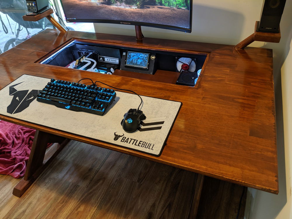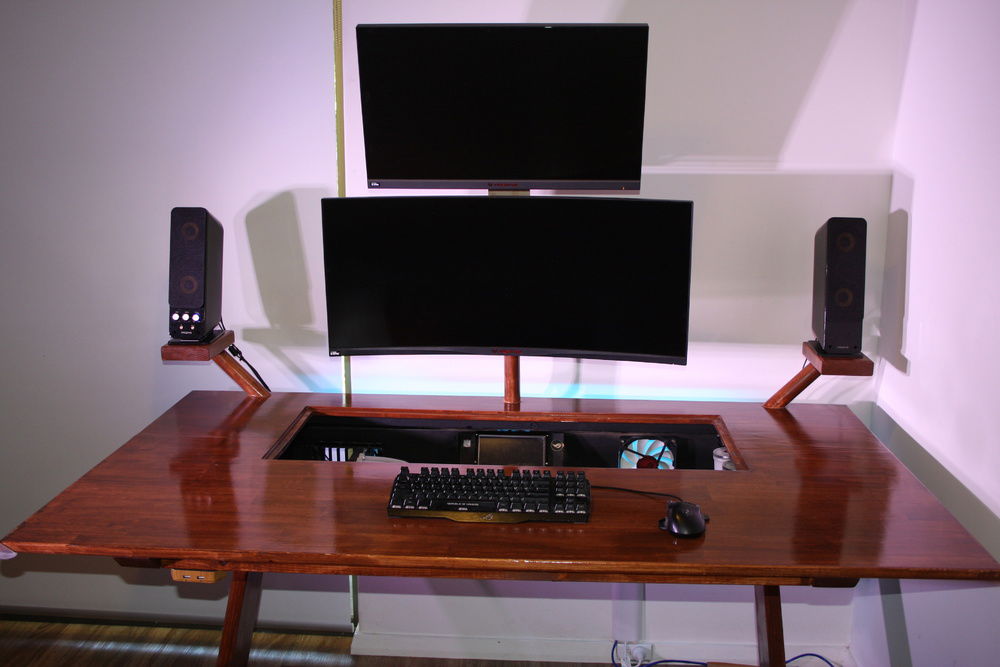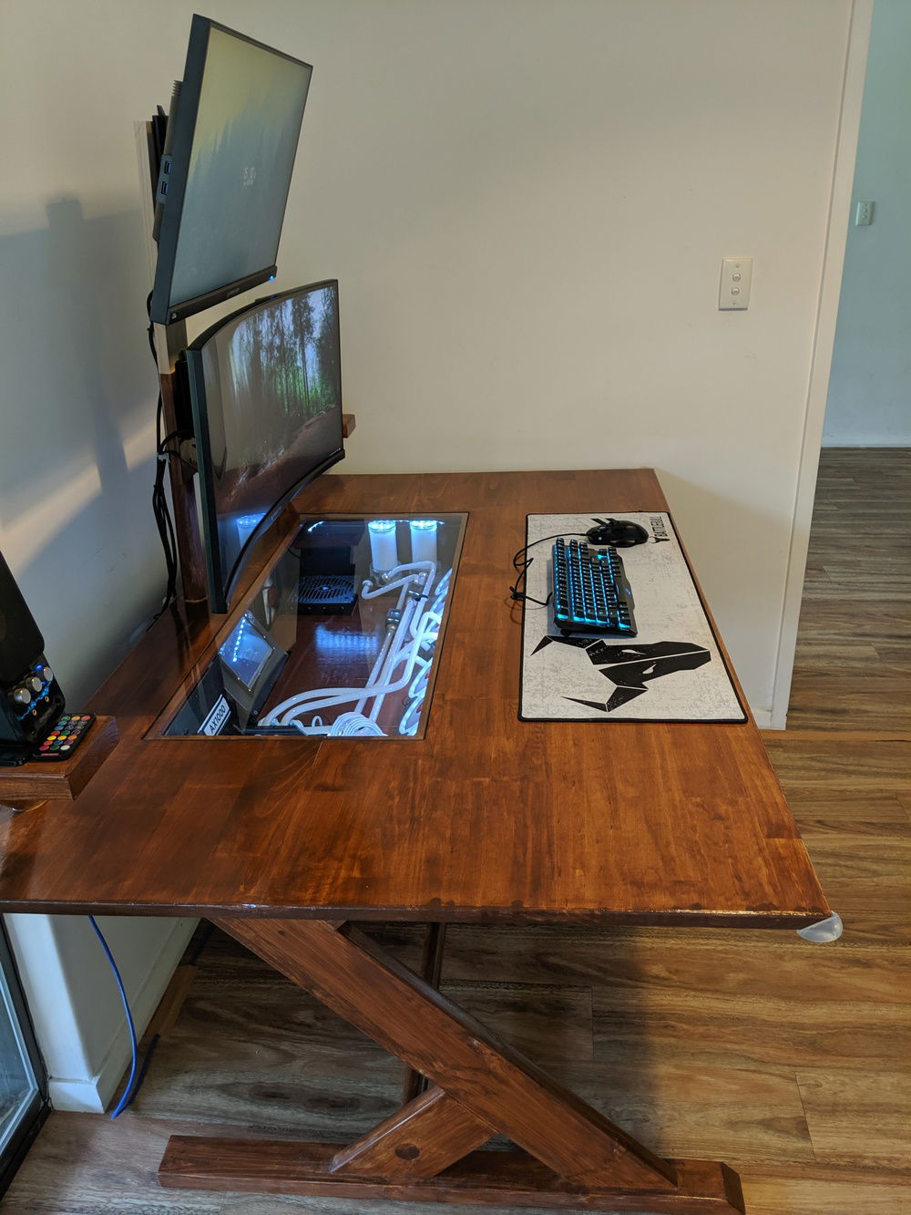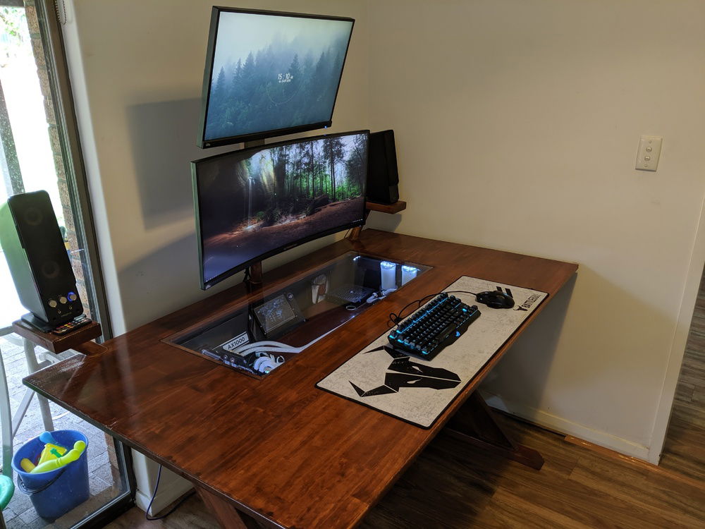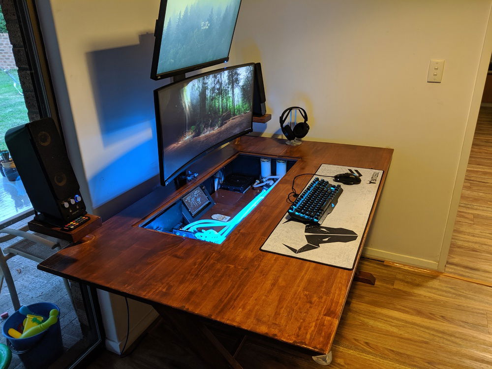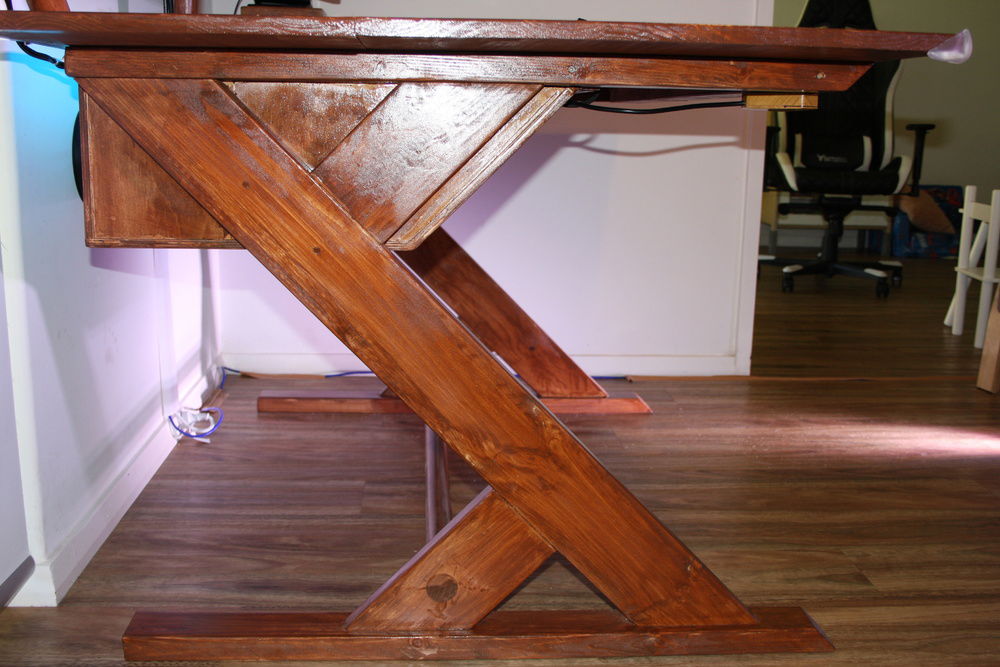 Custom built computer desk, all pine construction. Used for work, video production and gaming.