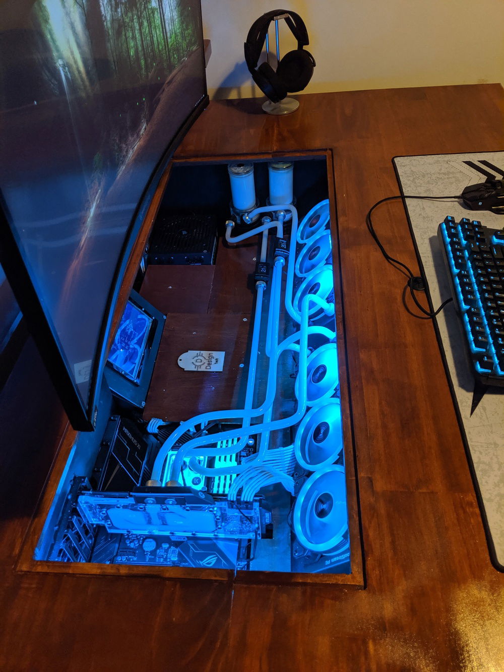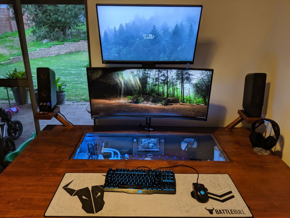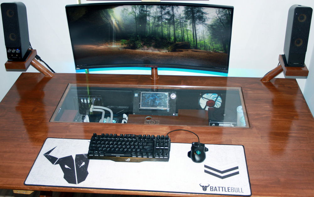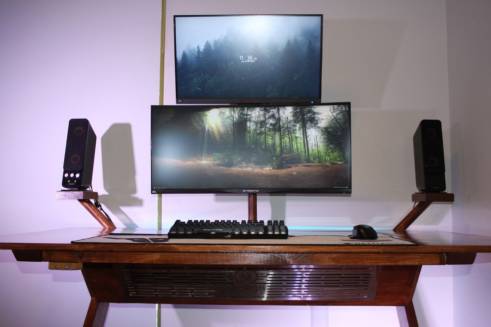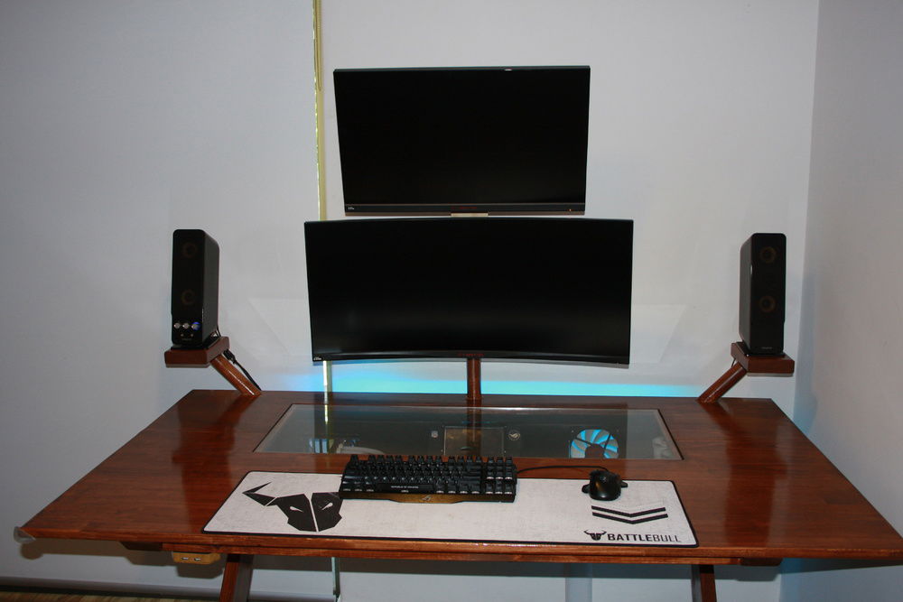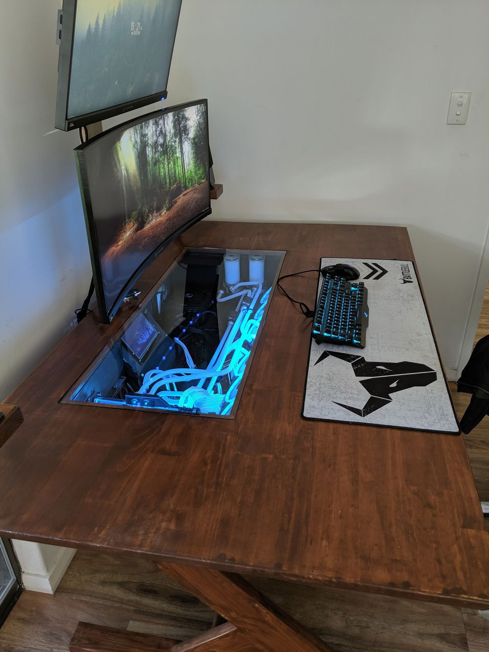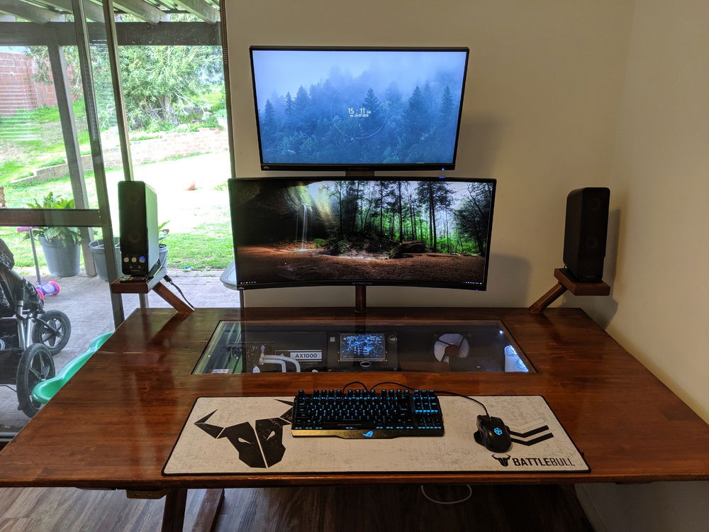 Custom built computer desk, all pine construction. Used for work, video production and gaming.