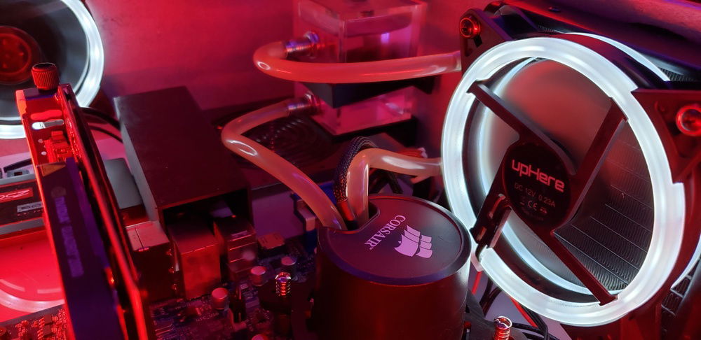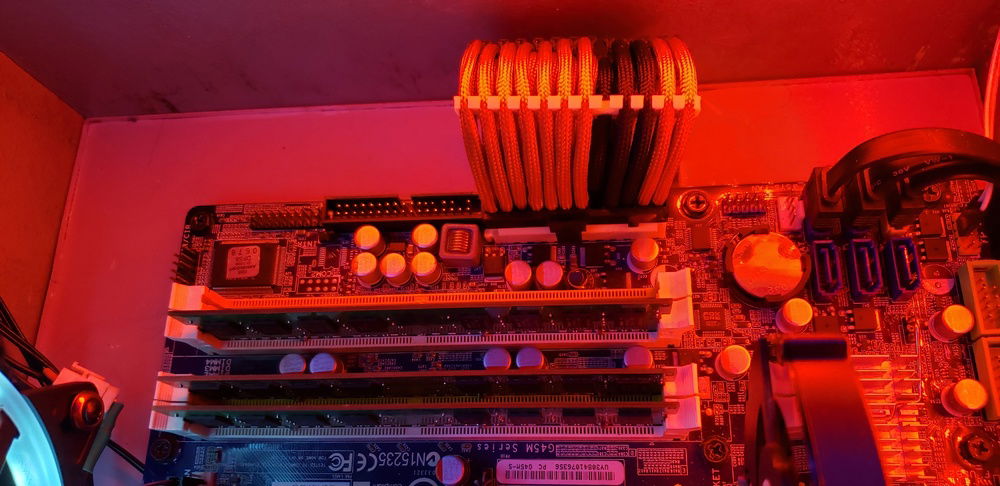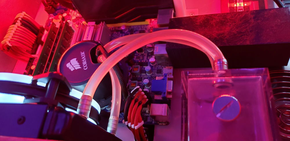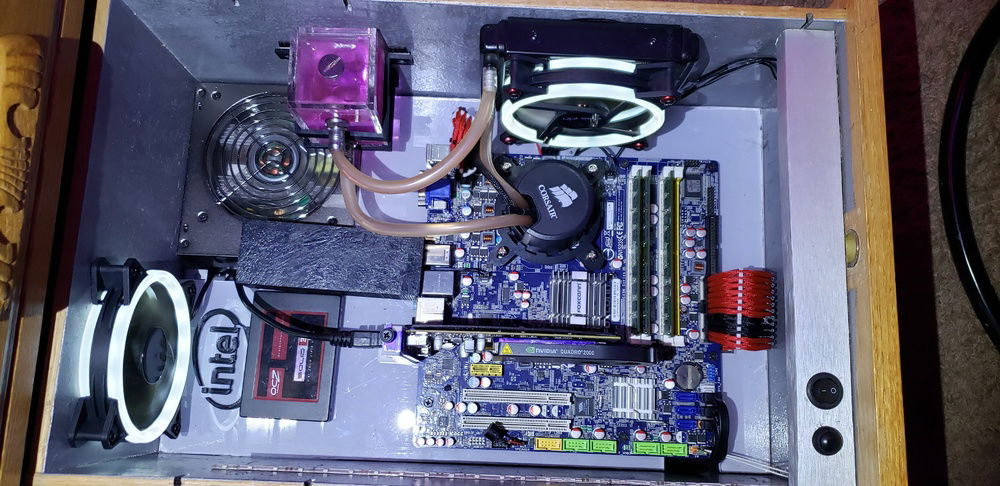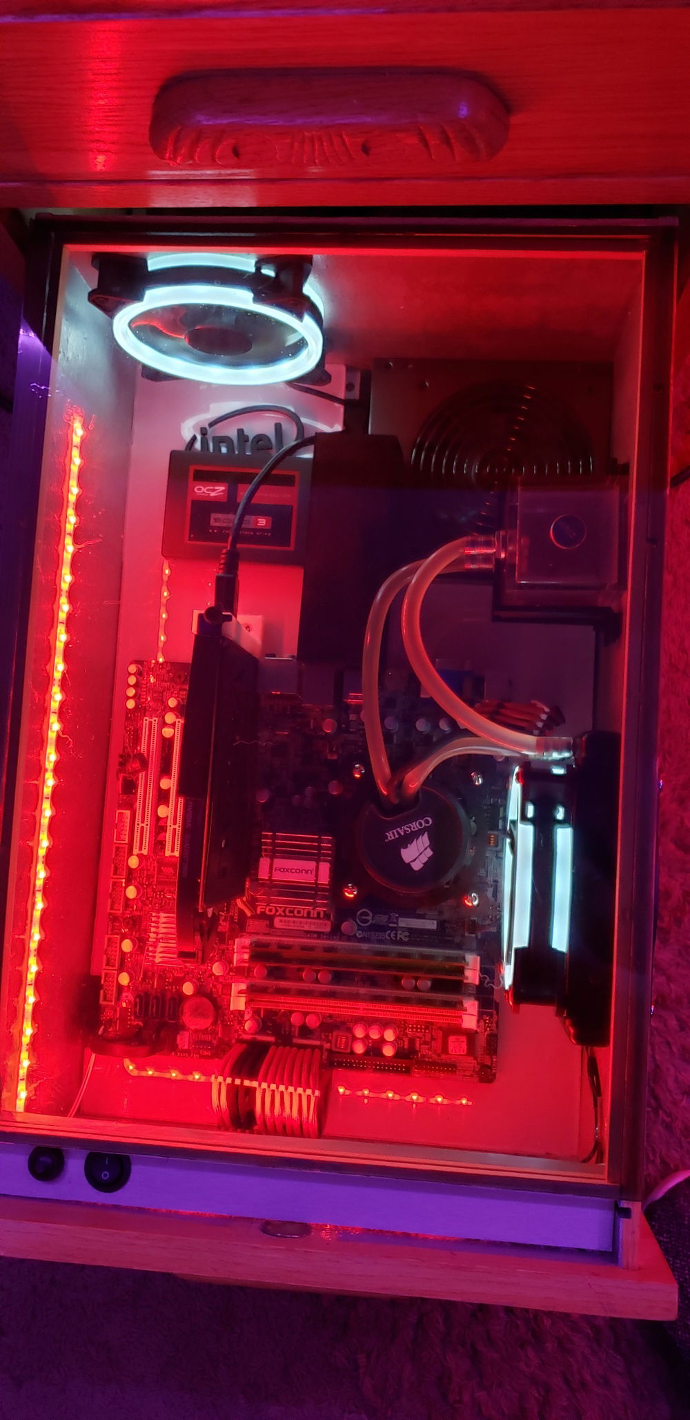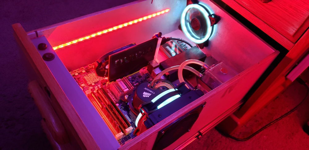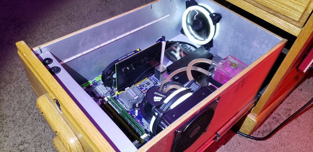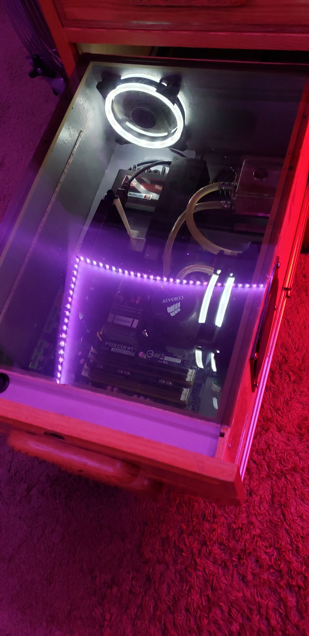 I had a desktop pc that I used as a Plex server and design station for my 3D printing that I do but I didn't want it taking up desk space or sitting on my carpeted floor. So I decided to build it into one of my desk drawers. It's an older system but It does what I need it to do plus lots more. Im still in the process of designing a motherboard armor cover and a better cover for the I/O wires. All the cables were sleeved by myself. The GPU backplate was also designed and 3d printed by me along with the reservoir mount and the aio block mount and backplate. Theres also the HDD mounts that were 3d printed but are not pictured. They're in a hidden section under the motherboard Tray witch is made out of 4mm Thick acrylic. There is 2-10 foot usb extension running up to the top of the desk for easier access along with a fan controller for the 320mm exhaust fan that blows out the back of the desk. If you want to know more about the build just ask