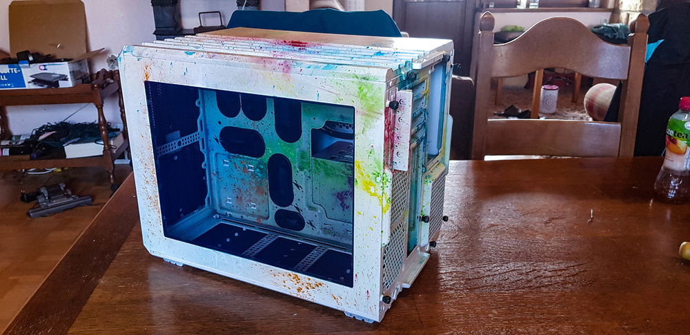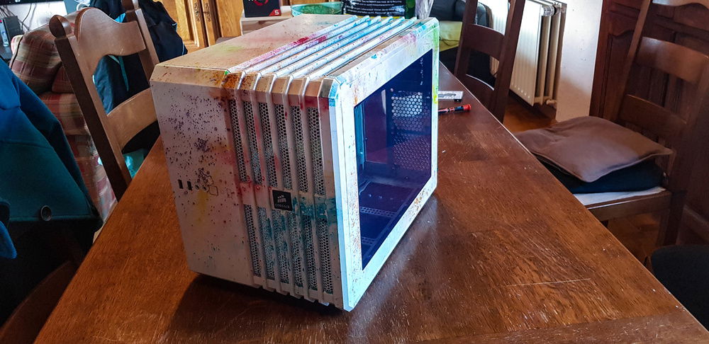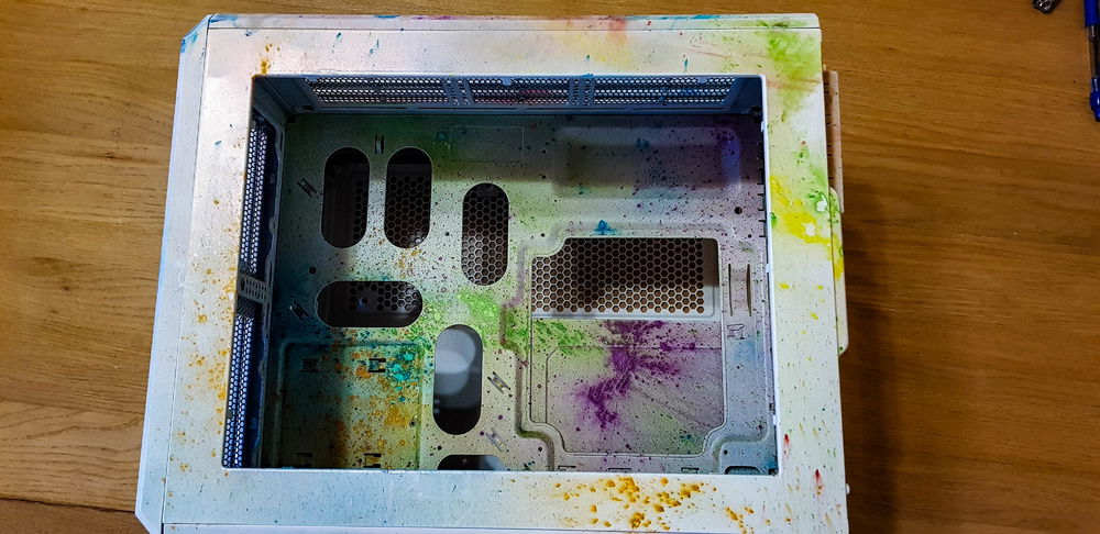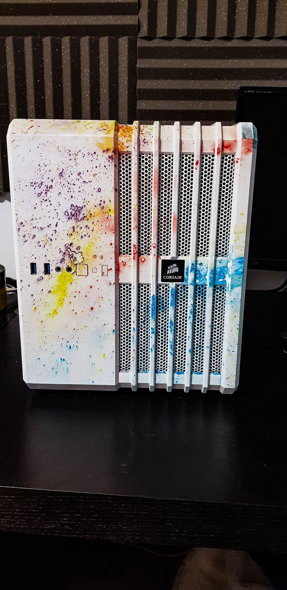 This build was made as a little suprise to my mom, a little upgrade for her after 9 years of a tiny notebook. As she loves colours I tried something out by reusing an old Corsair 240 Air. Ordered some holi powder on amazon, put a clear coat on the case after a fresh white. As long as the clear coat was still wet I threw some of the powder on it. After another clear coat dried, I washed the remaining powder off which you might see but it does add in interesting effect. Last clear coat and the job was done. Anything else is just a standard build.